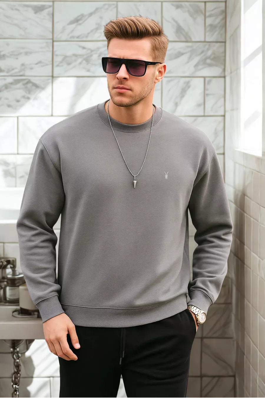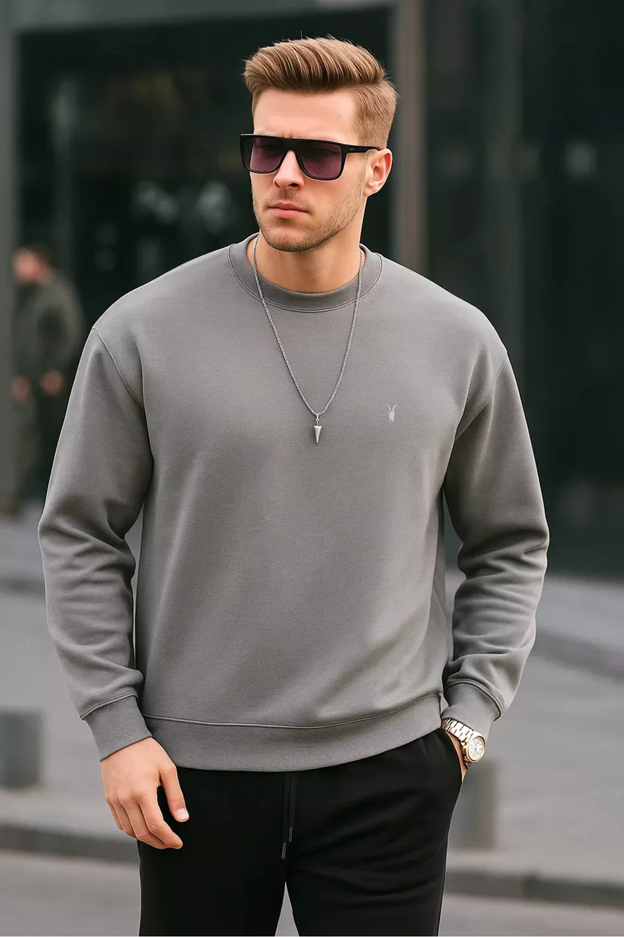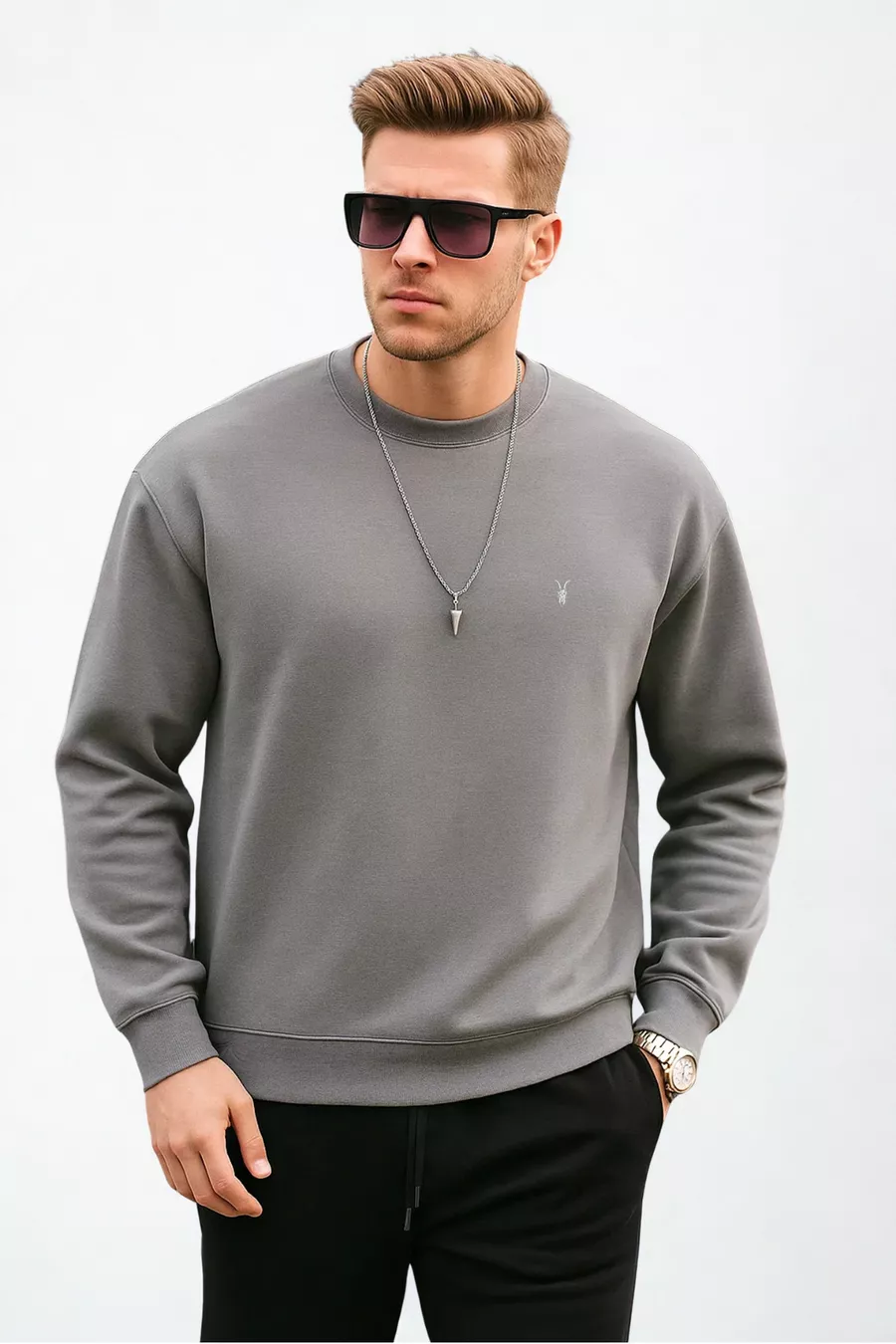 Graues Basic-Sweatshirt für Männer mit Rundhalsausschnitt, entspannte Passform