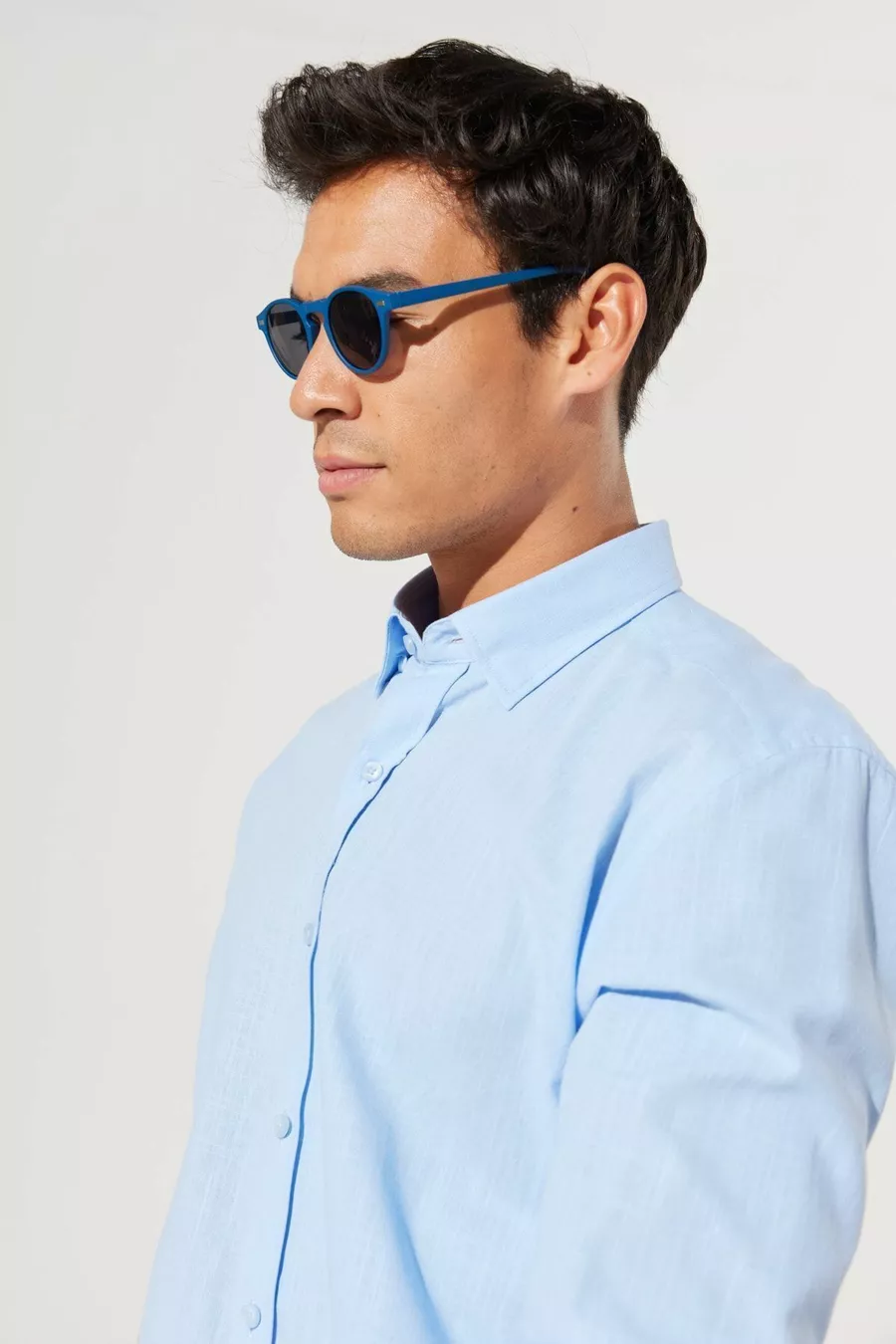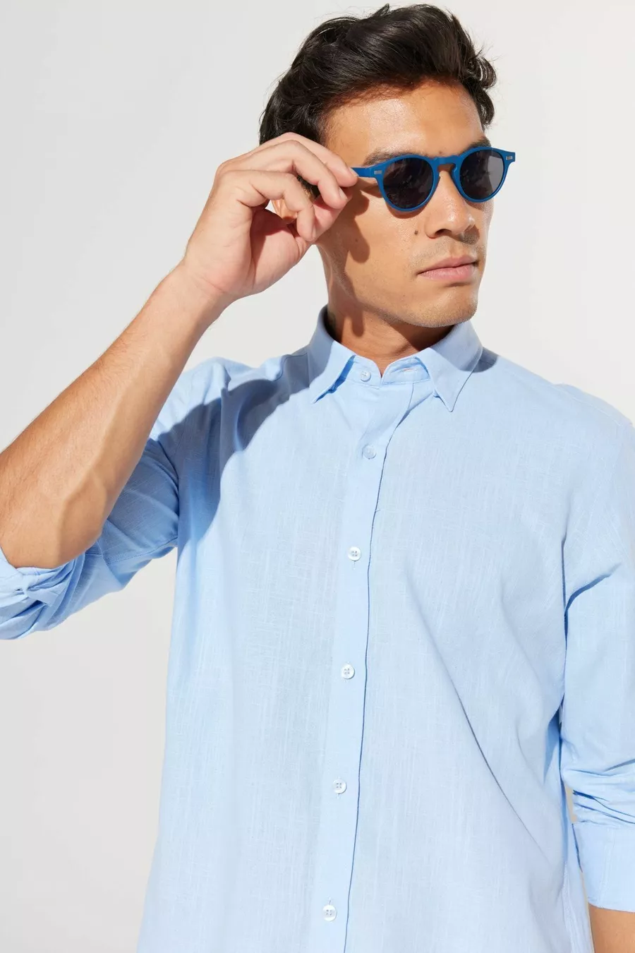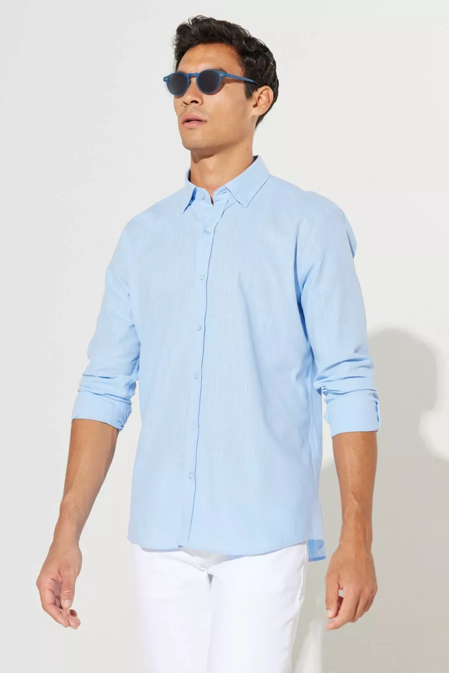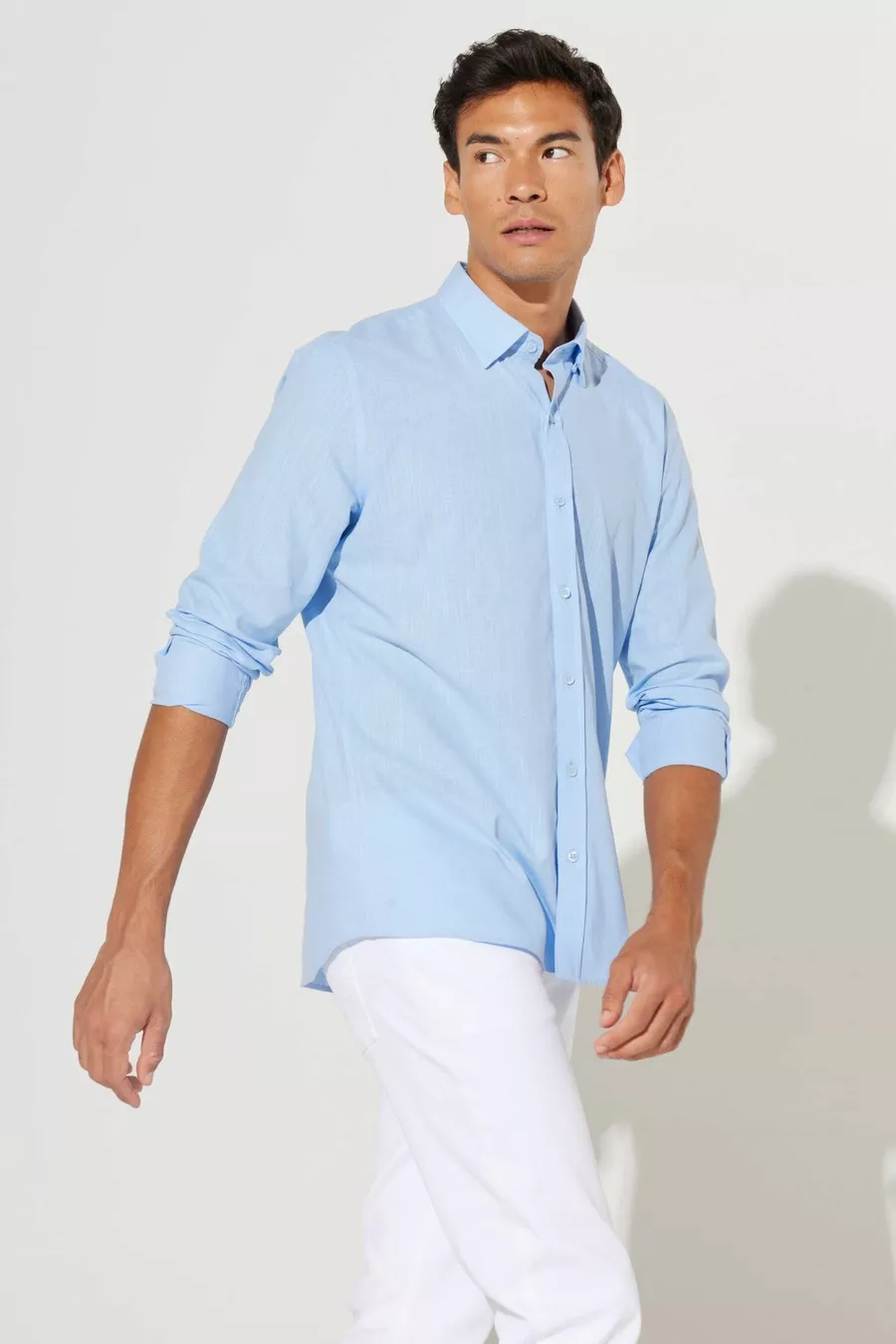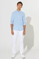 Herrenbluse Slim Fit mit Knopfleiste, Blauer Leinenoptik, % Baumwolle, Atmungsaktiver Stoff