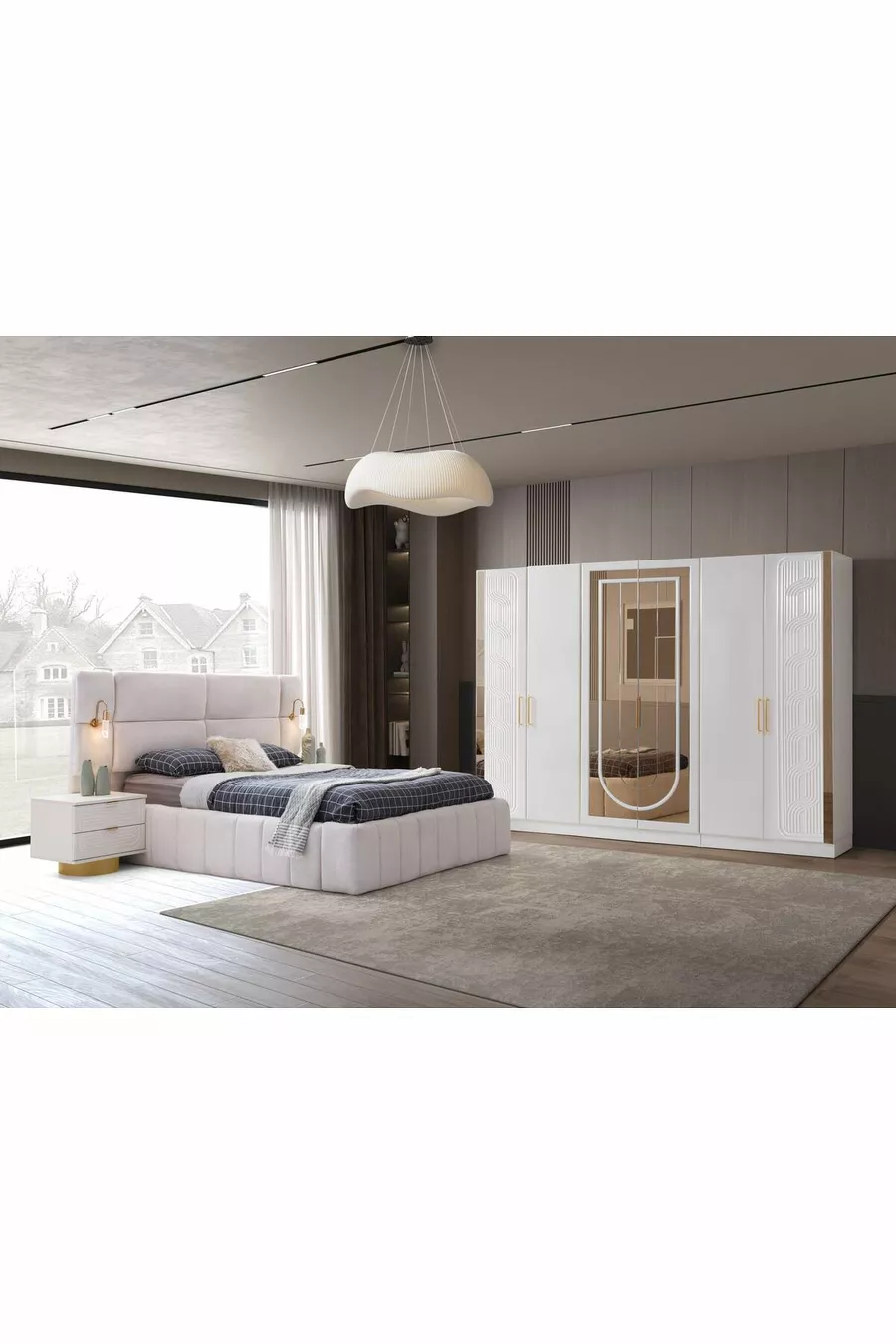 Farbe: Weiß Garantiezeit: 2 Jahre Bettgestell / Bettkasten Maße: 160 x 200 Bettgestell Funktion: Mit Stauraum Schrank Funktion: Mit Spiegel Schrankkorpus Material: MDF Anzahl der Türen: 6 Setinhalt: Schrank + 2 Nachttische + Kommode + Bettkopfteil Stil: Modern Thema / Stil: Skandinavisch Herkunft: TR