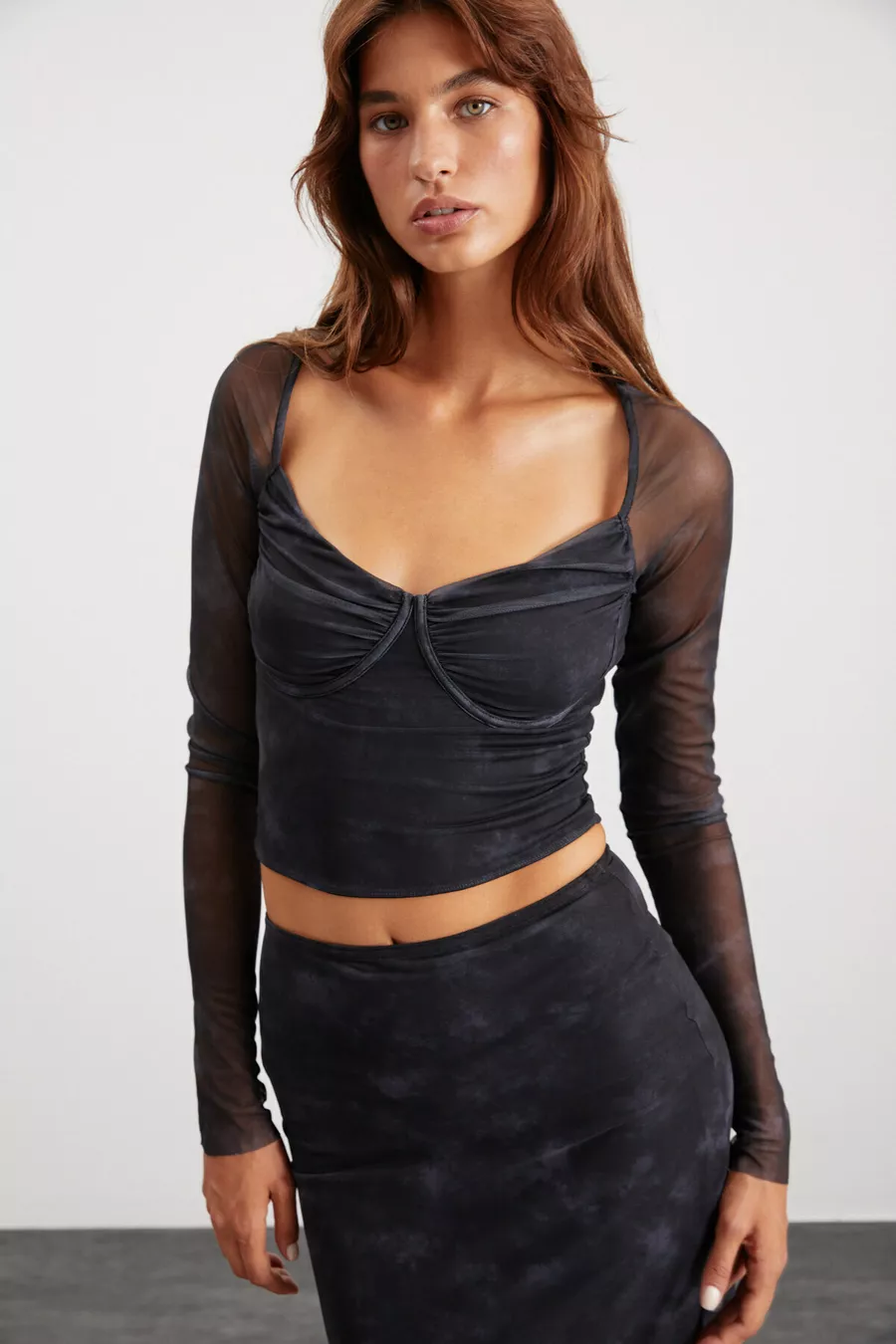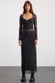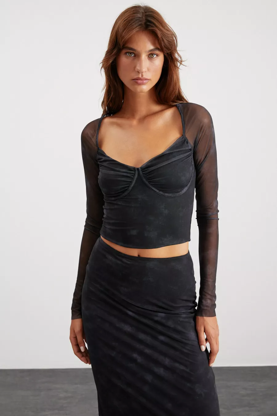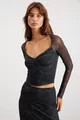 Lıly Damen Slim Fit Herz-Ausschnitt Gemustertes Tüll Langarm Dunkelgraues Bluse