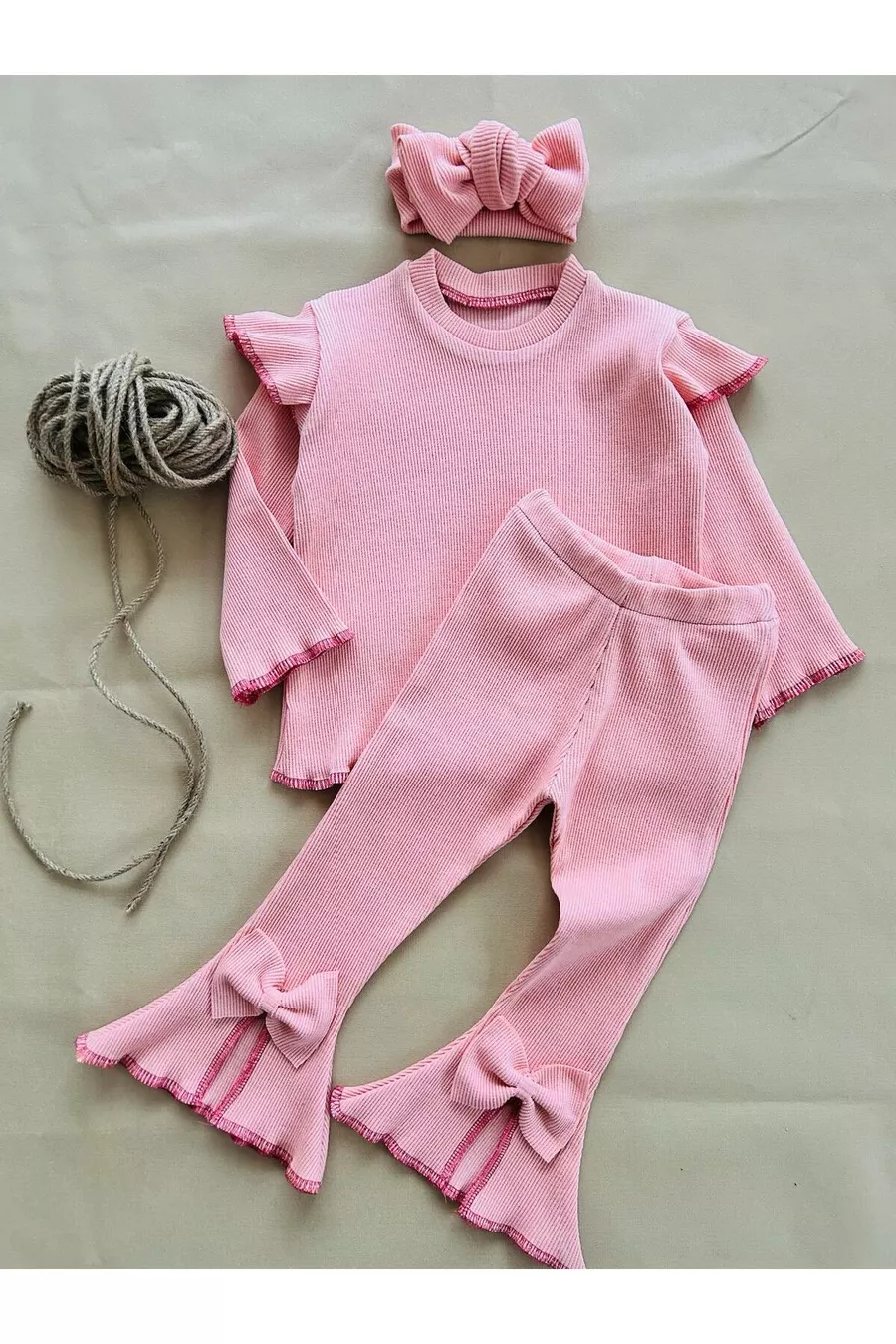 Mädchen Baby Kinder Set mit Fischnetz-Bund, Schleifendetail und Bandana, Saisonaler Rippstrick