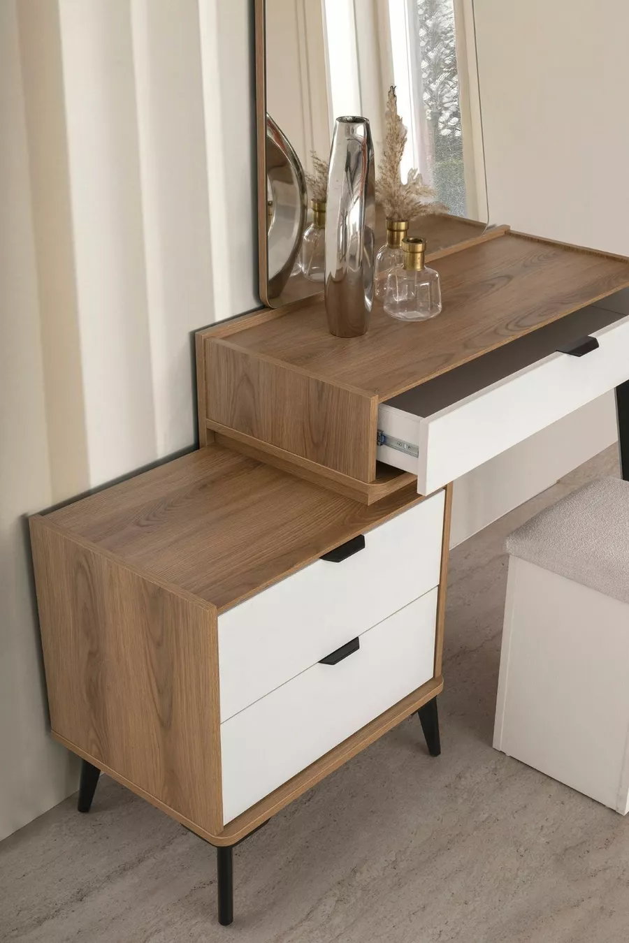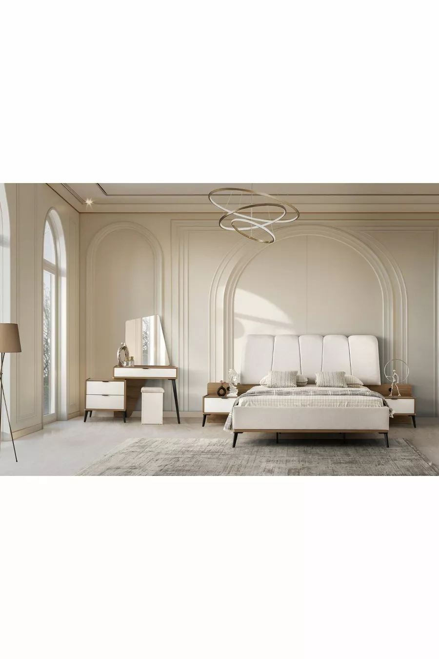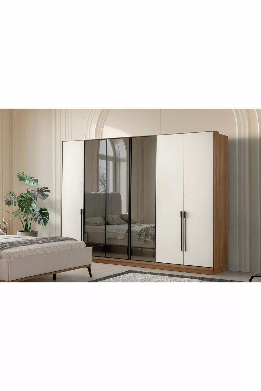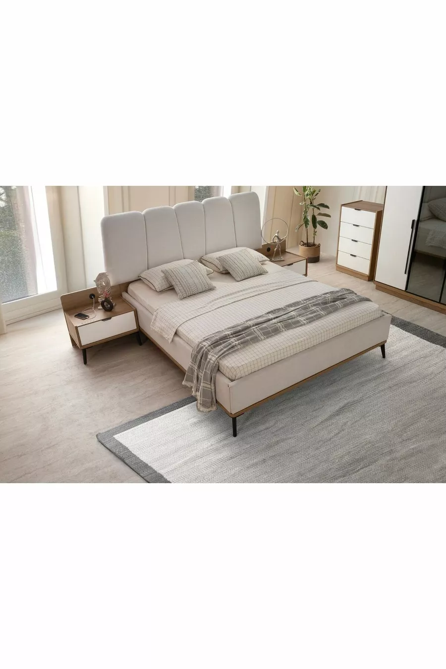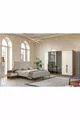 Setinhalt: Bett + 2 Nachttische + Kommode + Kleiderschrank + Spiegel