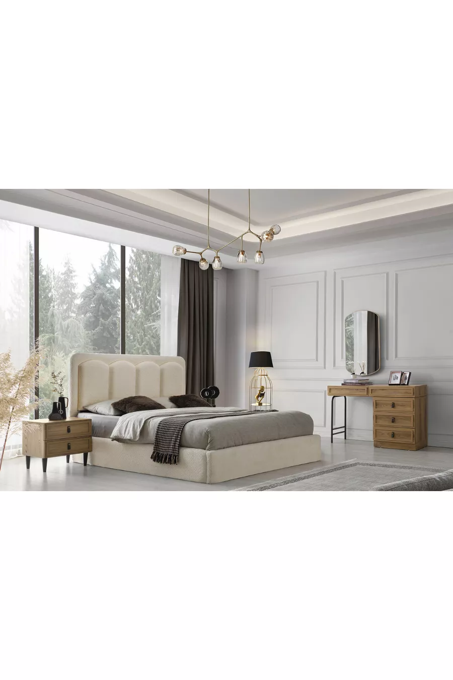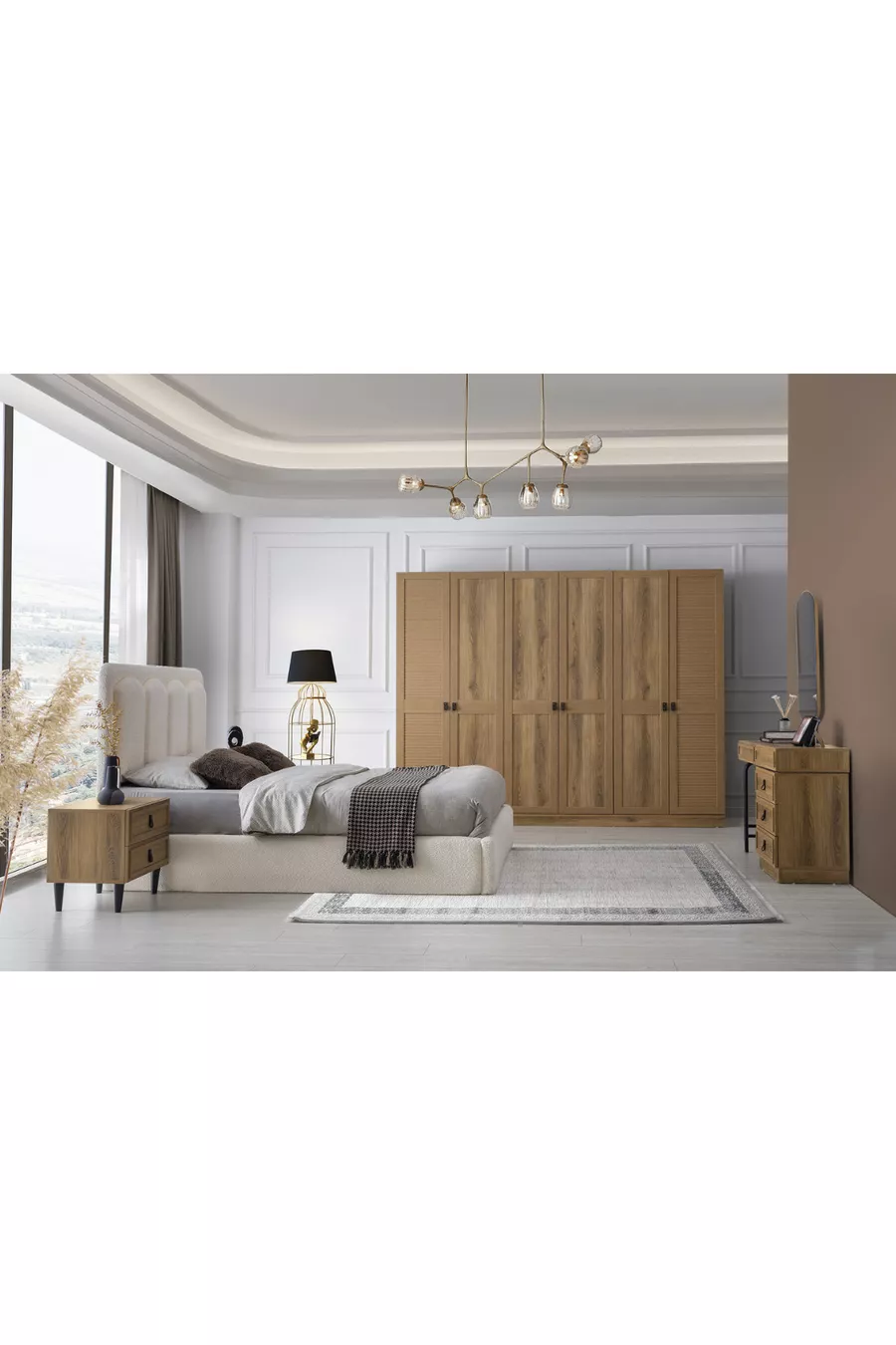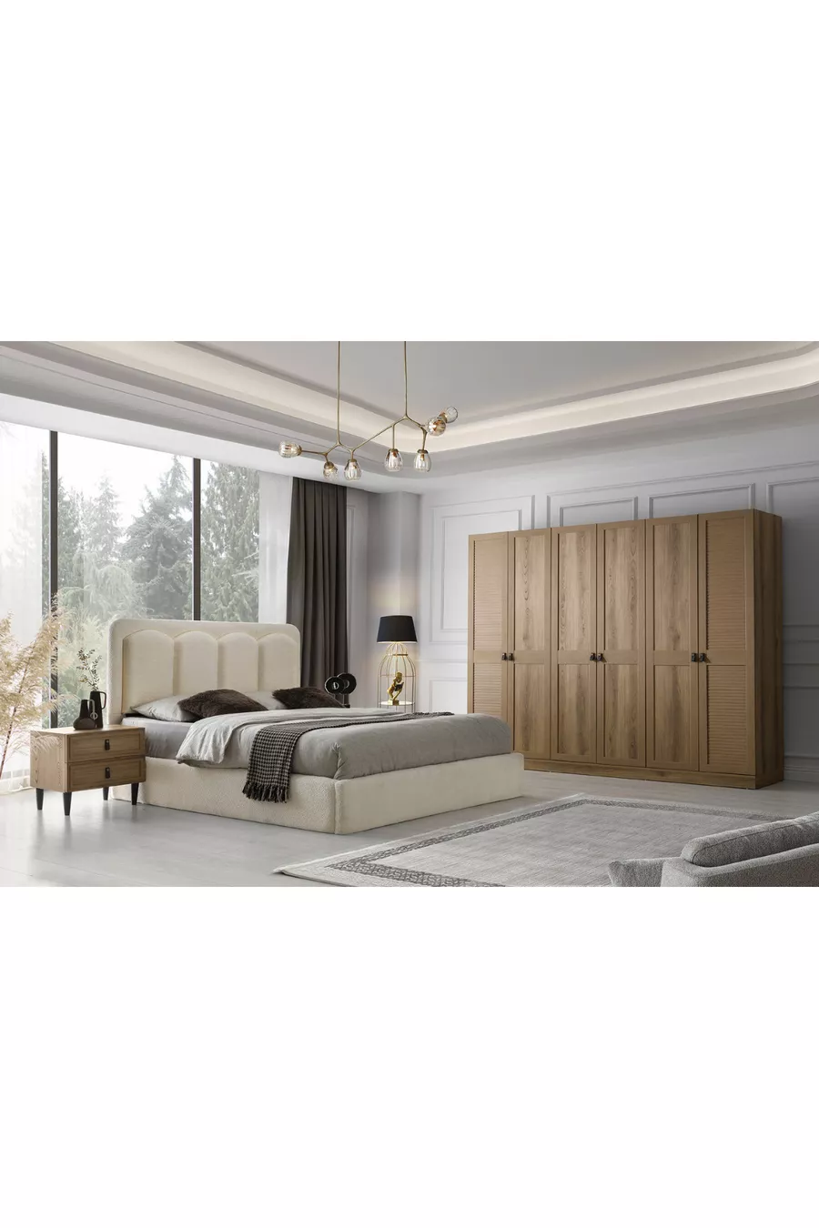 Setinhalt: Kleiderschrank + 2 Nachttische + Kommode + Kopfteil