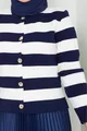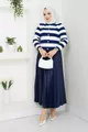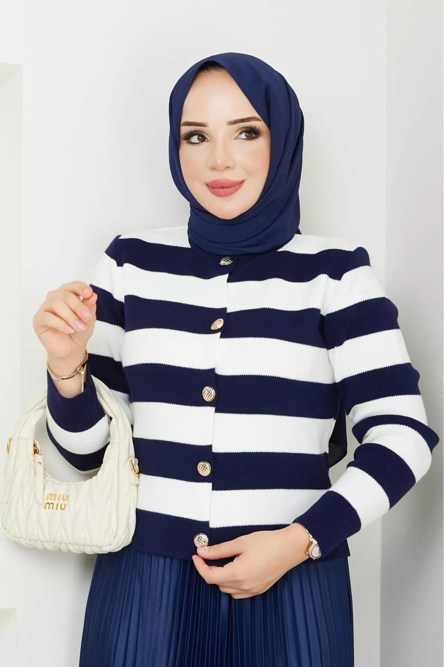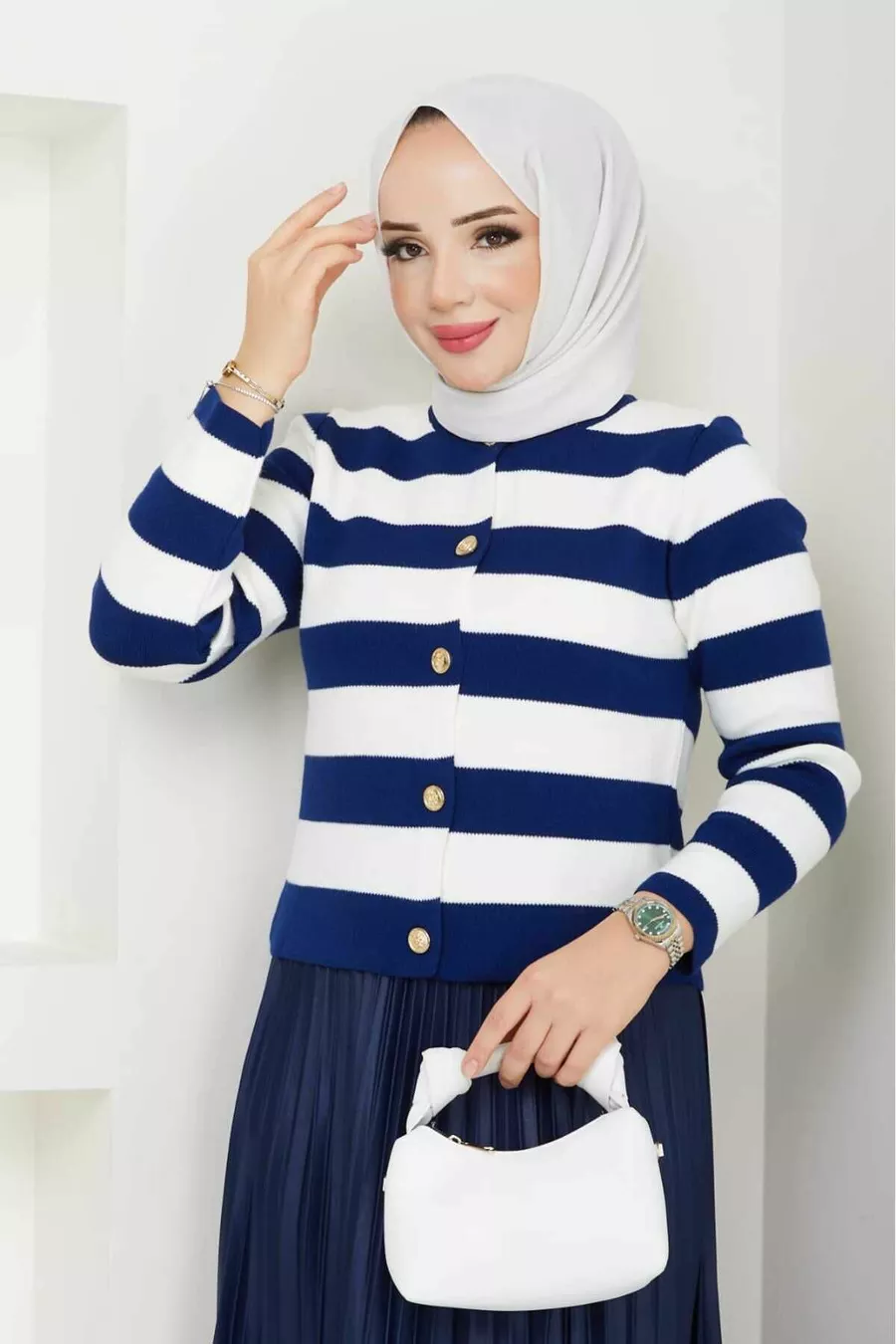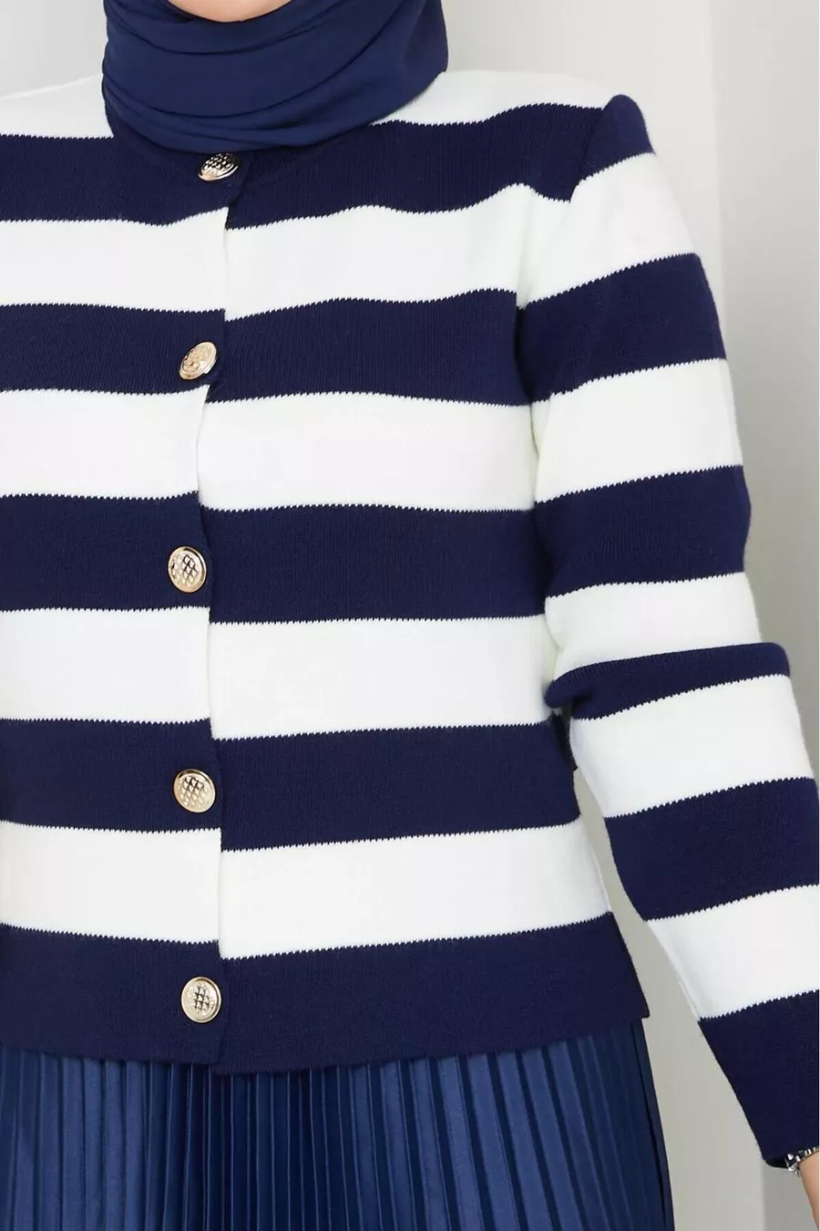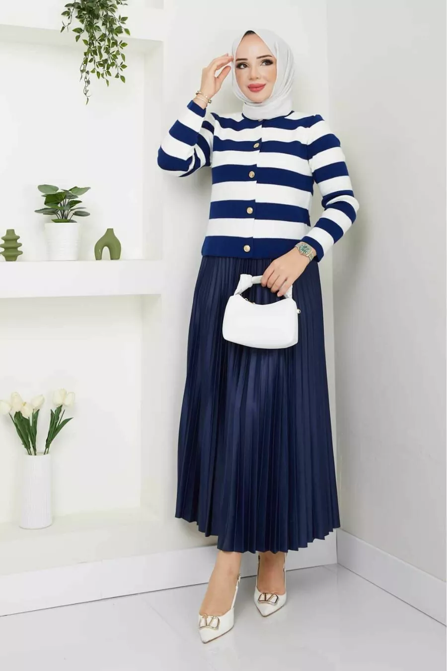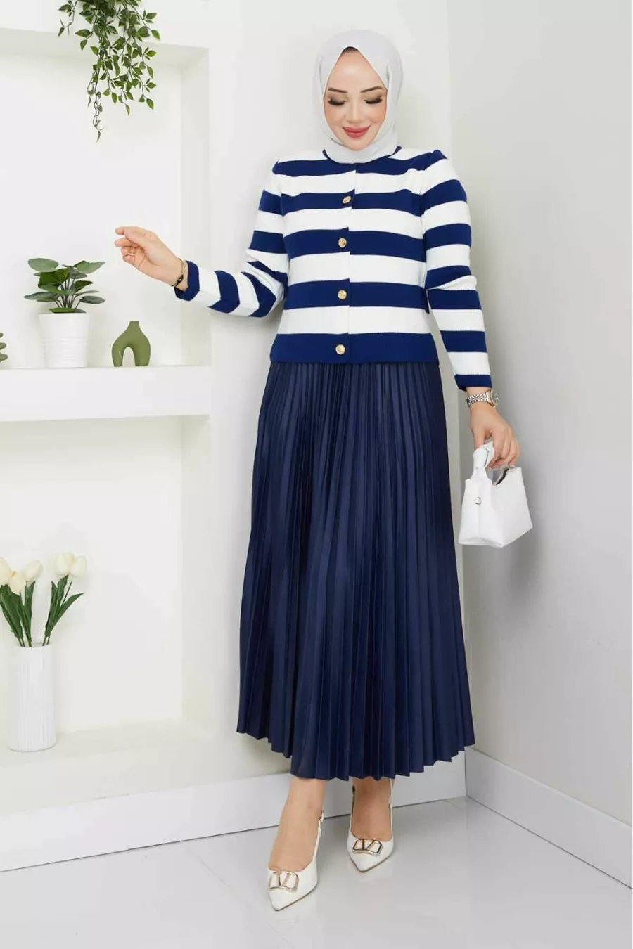 MF Damen Taillierter Plissierter Rock mit Gummibund und Strickjacke mit Knöpfen vorne