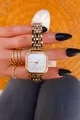 Gehäusedurchmesser: 20-25 mm Gehäusefarbe: Silber Gehäusematerial: Holz Armbandfarbe: Gold Armbandmaterial: Metall Wasserdichtigkeit: 3 ATM Glasart: Mineral Uhrwerk: Quarz Glasform: Flach Garantiezeit: 2 Jahre Farbe: Gold Eigenschaft: Quadrat