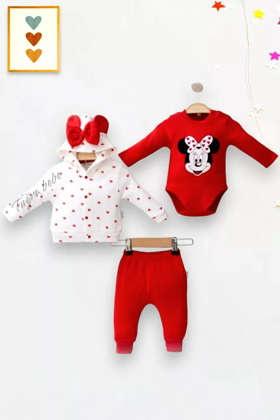 Minnie Mouse 3-teiliges Baby-Mädchen-Set mit Strampler, Herzmuster, Kapuzenjacke