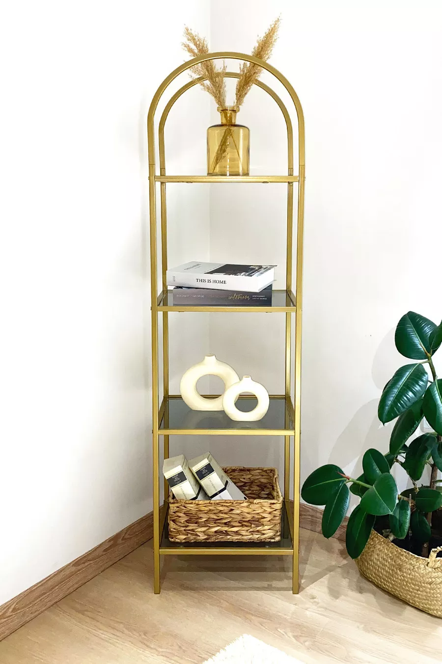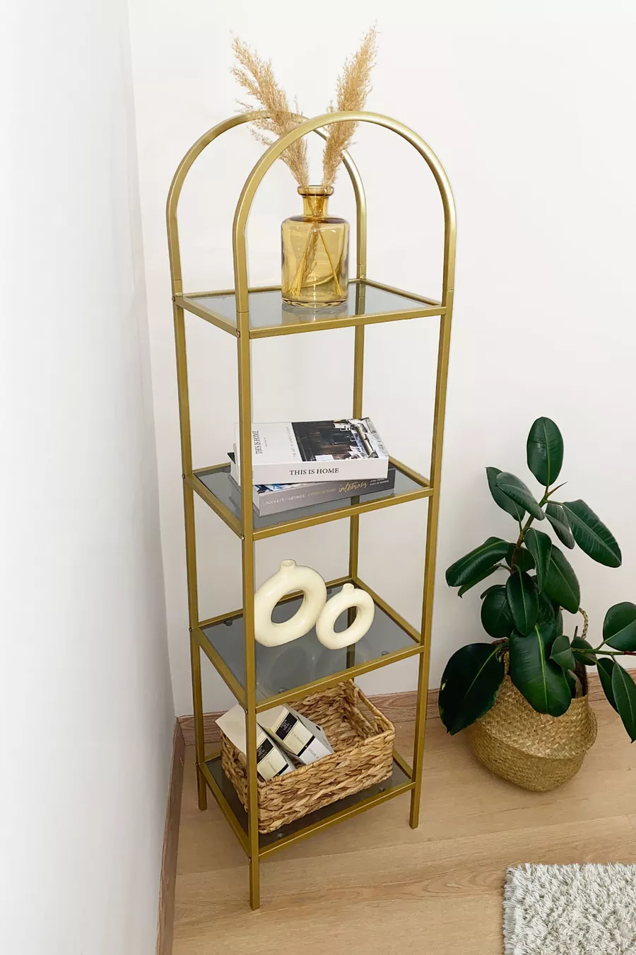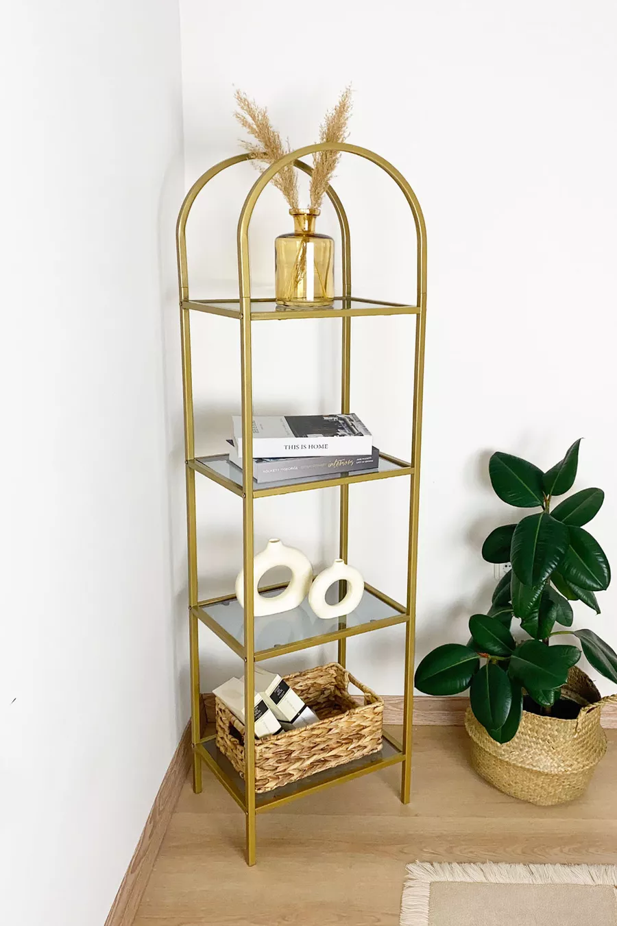 Tipp: Klassisch Material: Glas Farbe: Gold Höhe: 152 cm Breite: 40 cm Tiefe: 30 cm Anzahl der Regale: 4 Korpusmaterial: Metall Stil: Retro Thema / Stil: Retro Herkunft: TR
