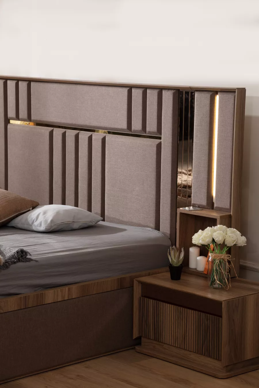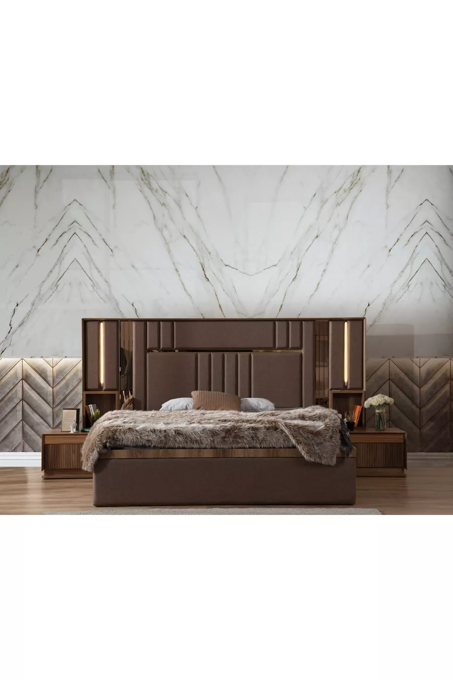 Setinhalt: Bettgestell + 2 Nachttische + Kommode + Kleiderschrank