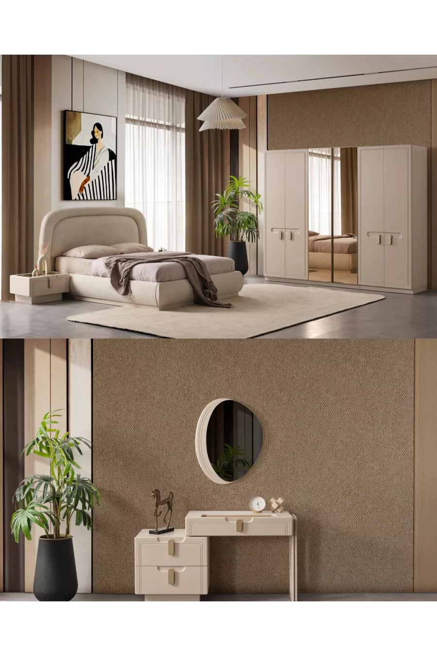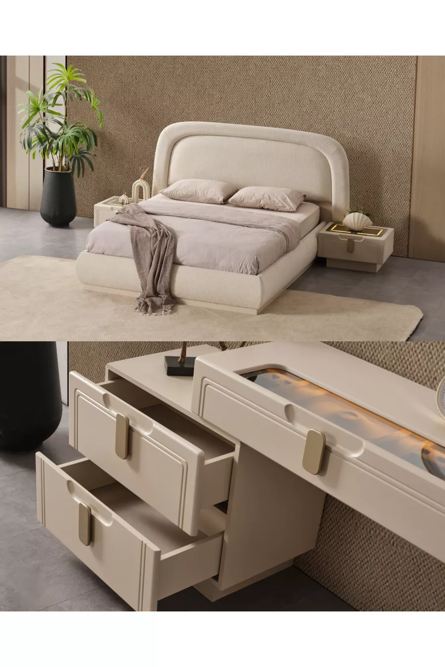 Setinhalt: Bett + 2 Nachttische + Kommode + Kleiderschrank + Spiegel