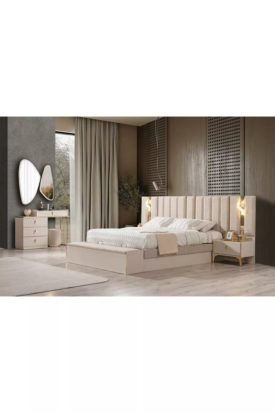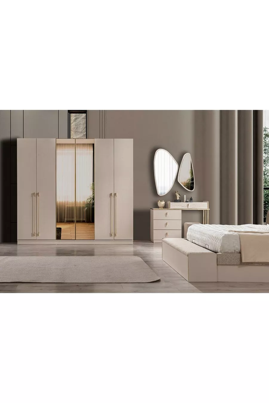Farbe: Ecru Garantiezeit: 2 Jahre Bettgestell / Bettkasten Größe: 160 x 200 Bettgestell Funktion: Mit Stauraum Schrank Funktion: Mit Spiegel Schrankkorpus Material: Spanplatte Anzahl der Türen: 6 Set Inhalt: Bettgestell mit Stauraum + 2 Nachttische + Kommode + Kleiderschrank Stil: Modern Thema / Stil: Modern Herkunft: TR