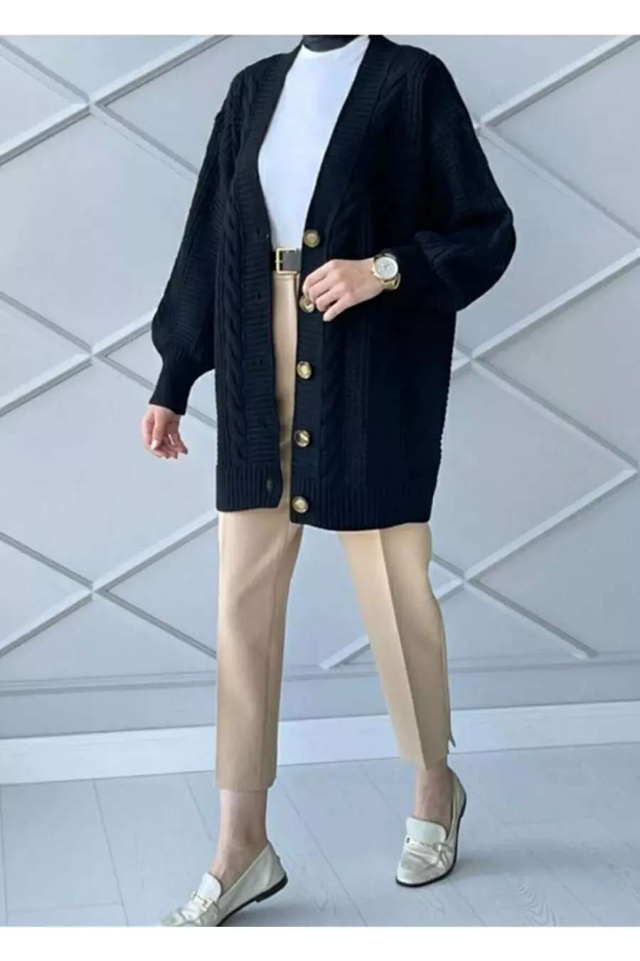 Schwarze Strickjacke mit Zopfmuster
