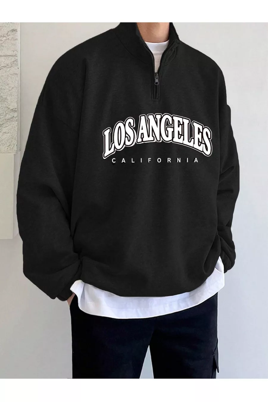 schwarzer Los Angeles Print Stehkragen Pullover mit halbem Reißverschluss