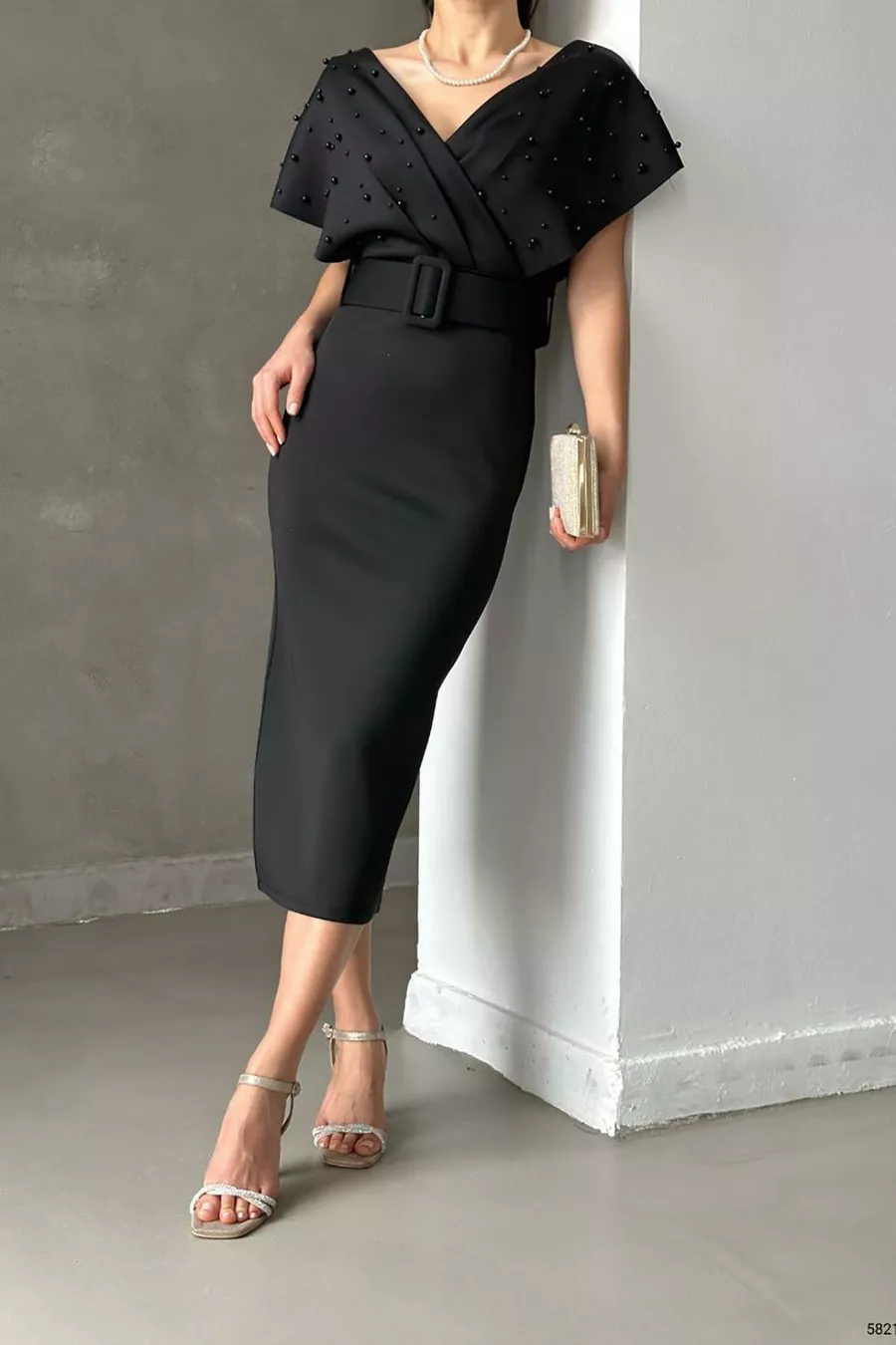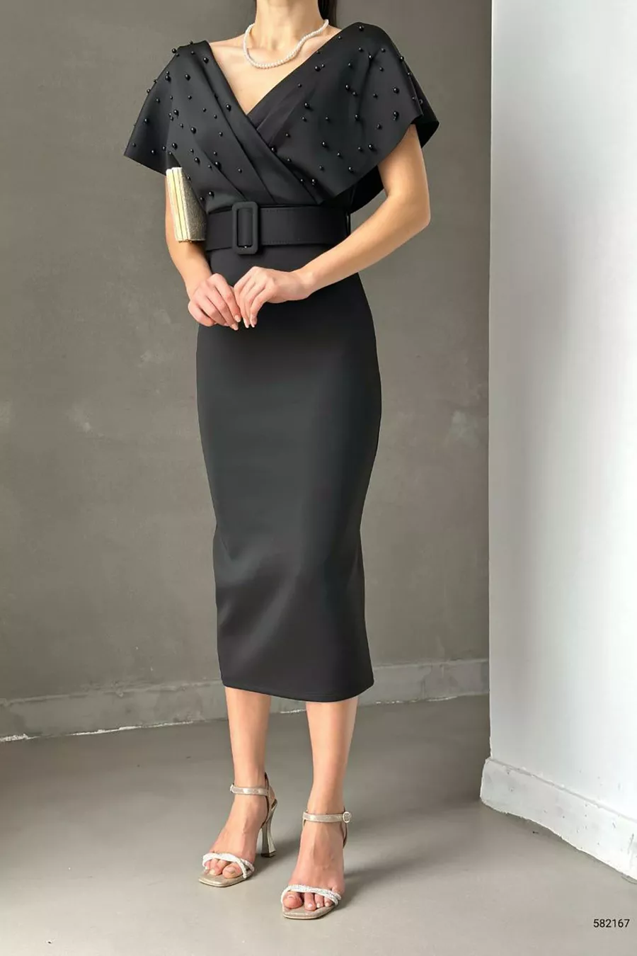 Schwarzes, tailliertes Kleid mit Tauchstoff und Perlendetails
