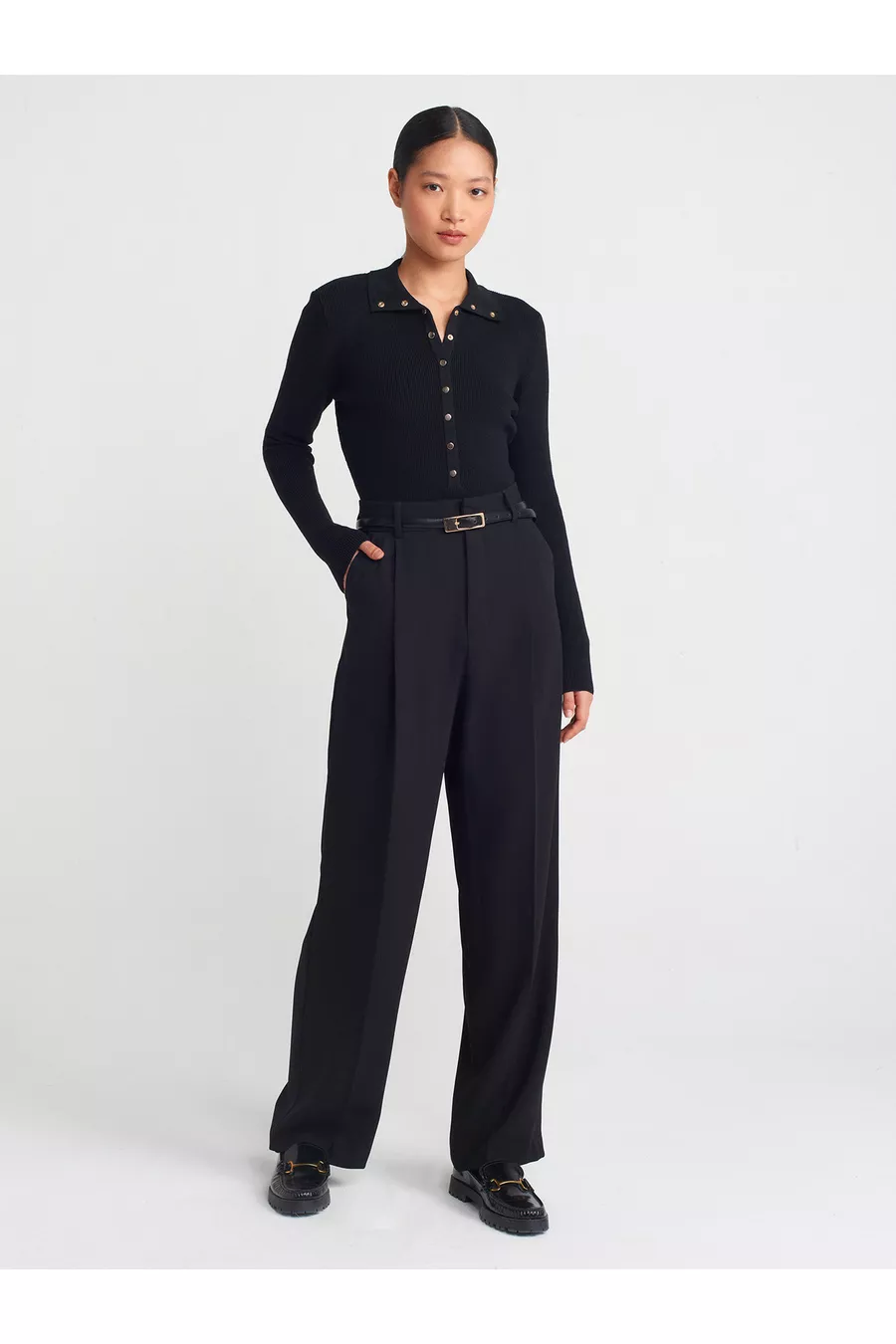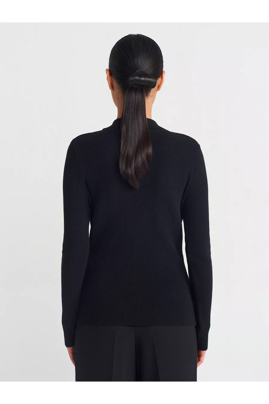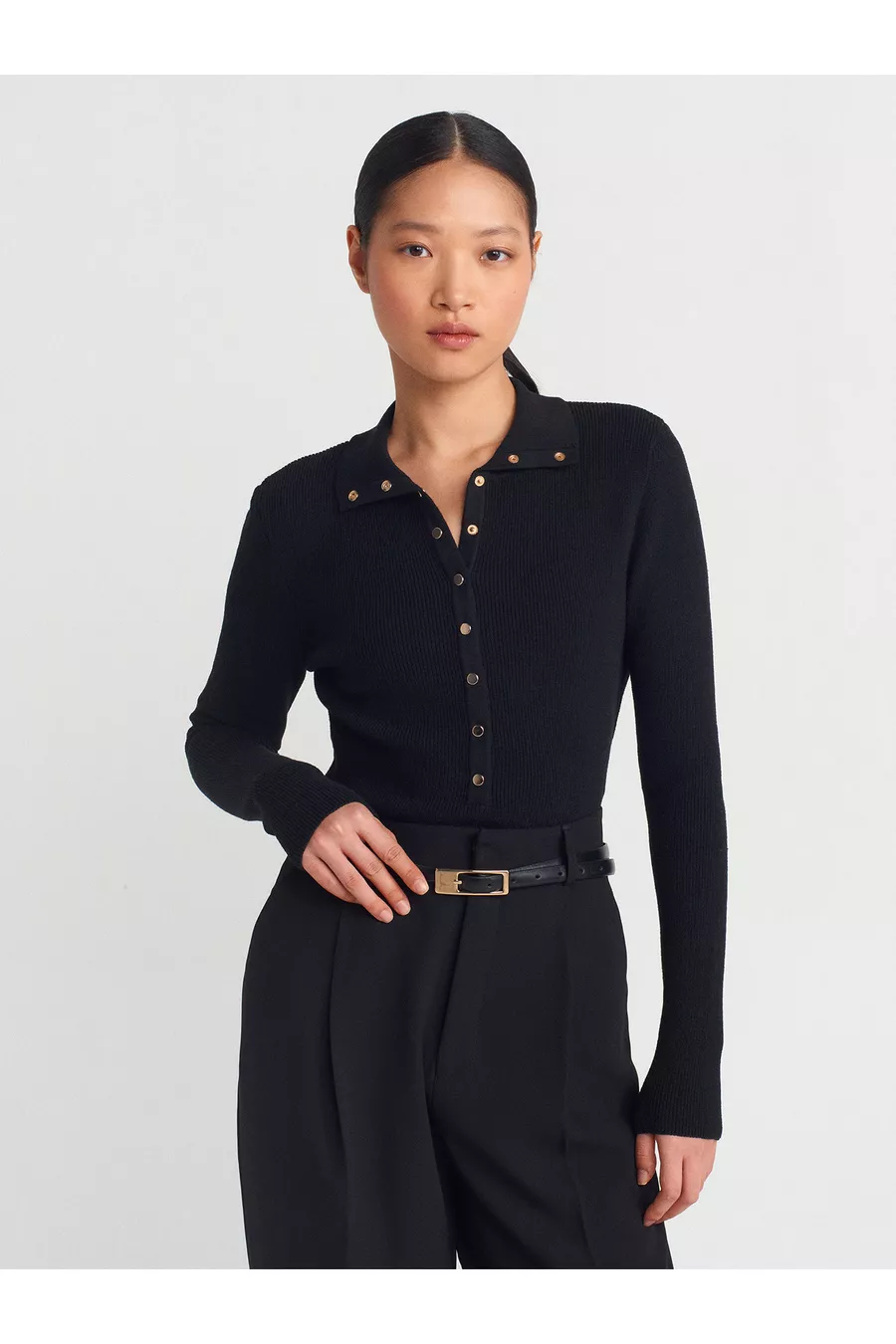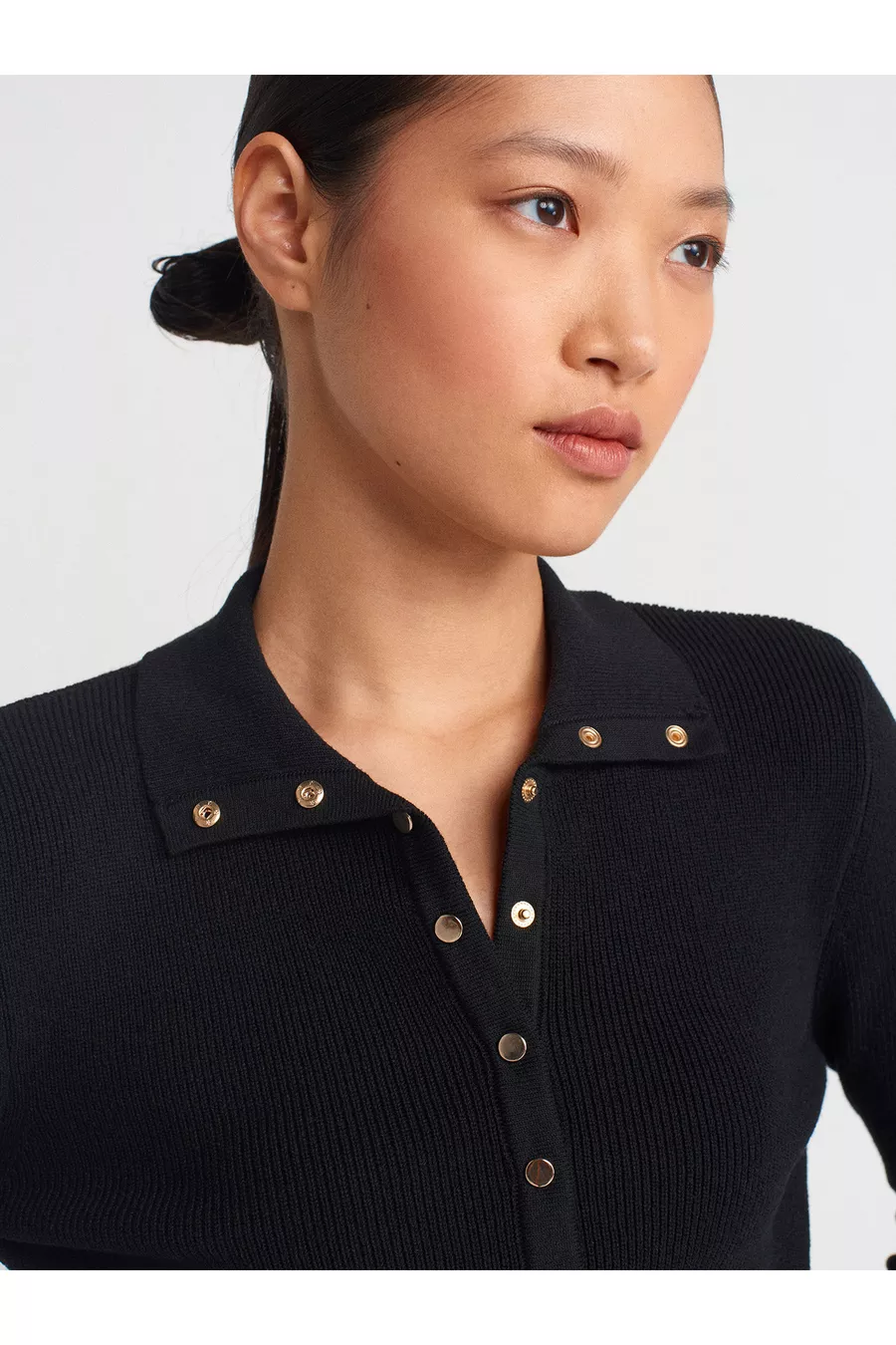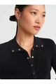 Stehkragen-Strickpullover mit Druckknöpfen - Schwarz