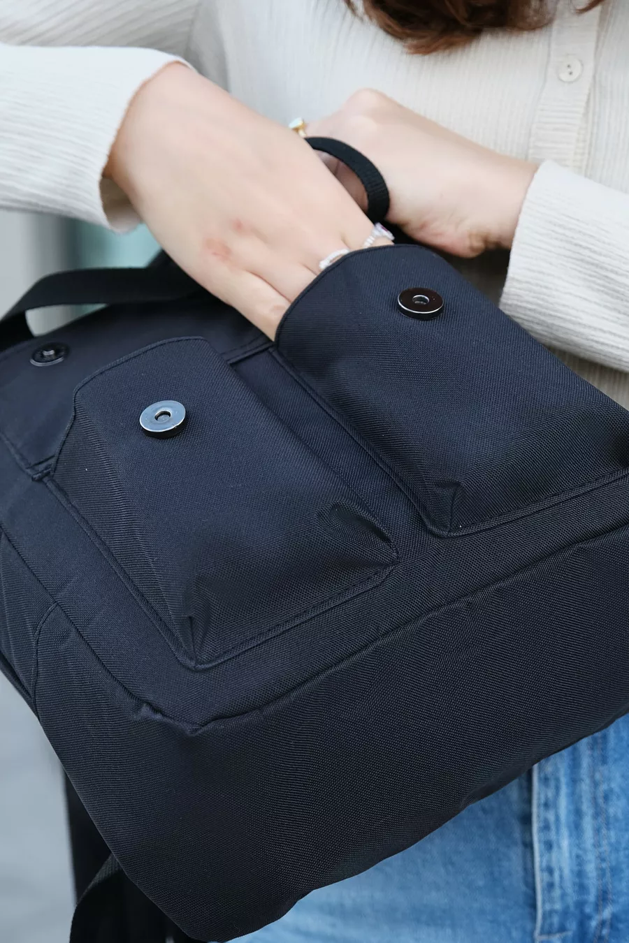 Kollektion: Business Nachhaltigkeitsdetail: Recycelt + Organisch Farbe: Schwarz Material: Stoff Kapazität: 0-15 L Umgebung: Zurück zur Schule Waschanleitung: Typ 4 Muster: Einfarbig Lederqualität: Teilweise nicht vorhanden