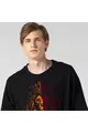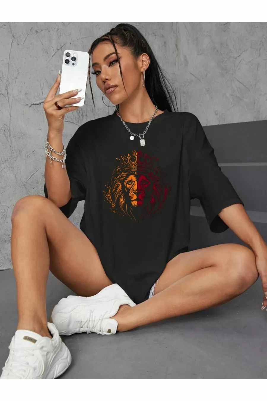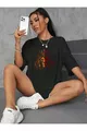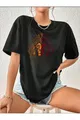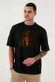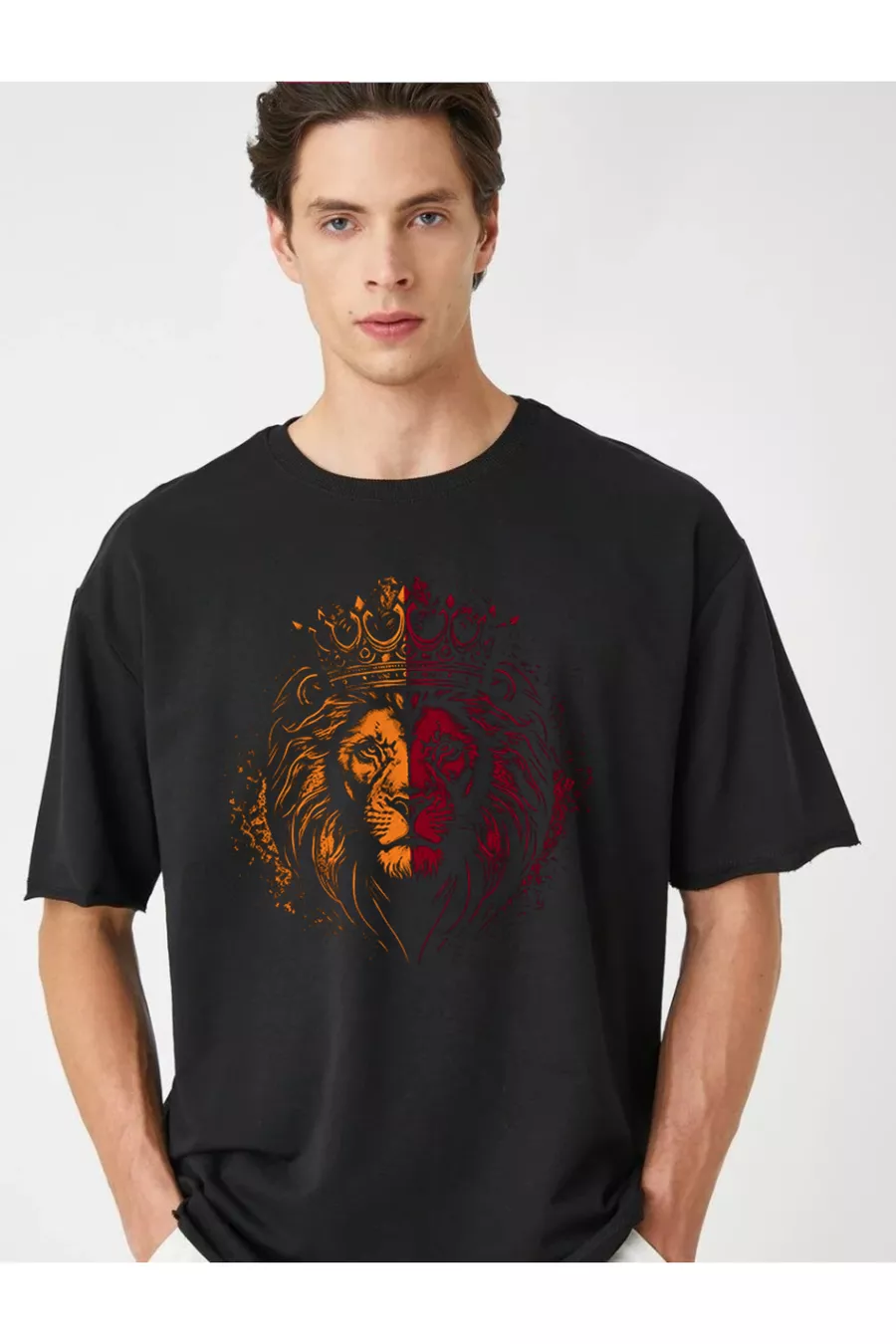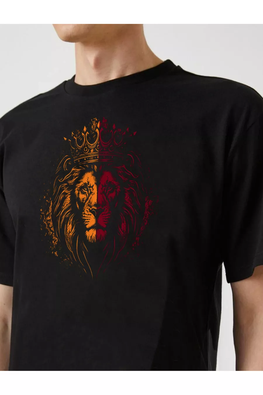 Unisex Schwarzes T-Shirt mit gelb-rotem Löwen-Design, Oversize schwarzes T-Shirt