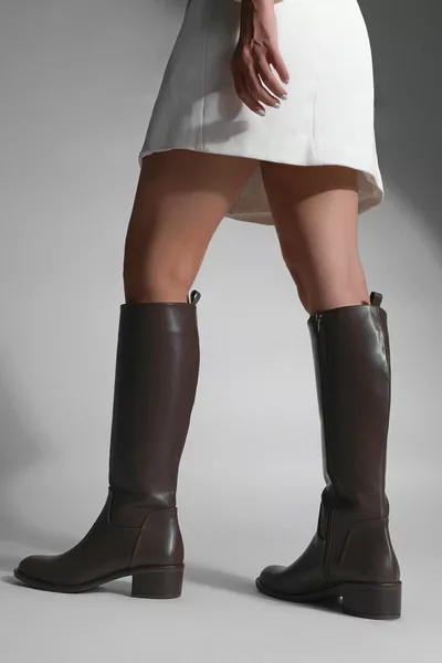 Briony Brown Side Zipper, Thin Faux Fur Lined Blunt Toe Women's Heeled Boots