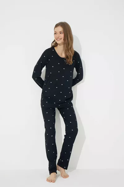 Navy Blue Rabbit Patterned Cotton Buttoned Knitted Pajamas Set