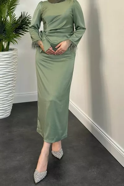 Satin Hijab Evening Dress with Stone Decoration Throughout the Front OIL GREEN
