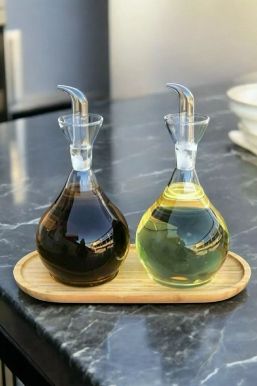2 Pieces ml Bulbous Borosilicate Glass Oil Dispenser with Drip Tray and Vinegar Bottle