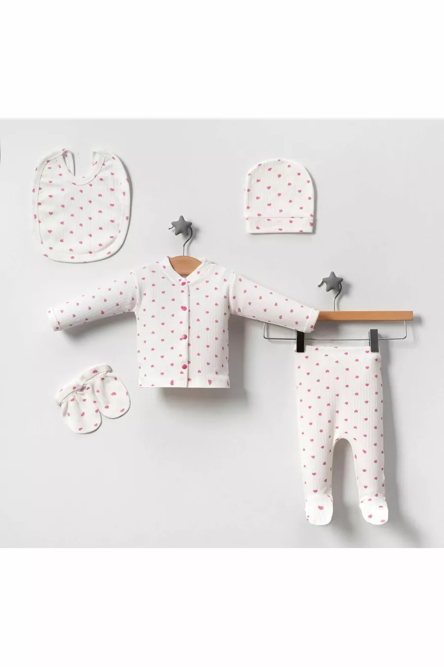 5-Piece Newborn Bodysuit Set Hospital Discharge Ribbed Ecru Fabric with Pink Heart, Boxed
