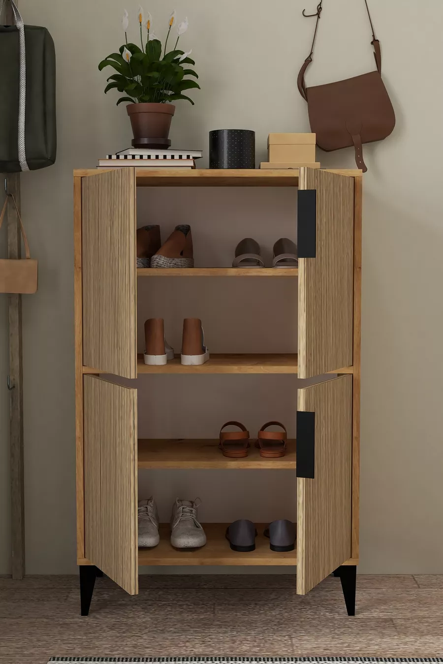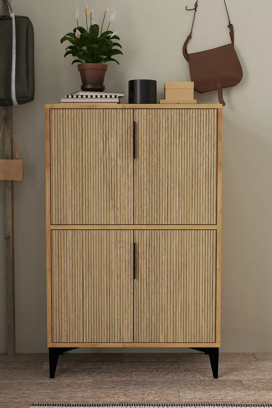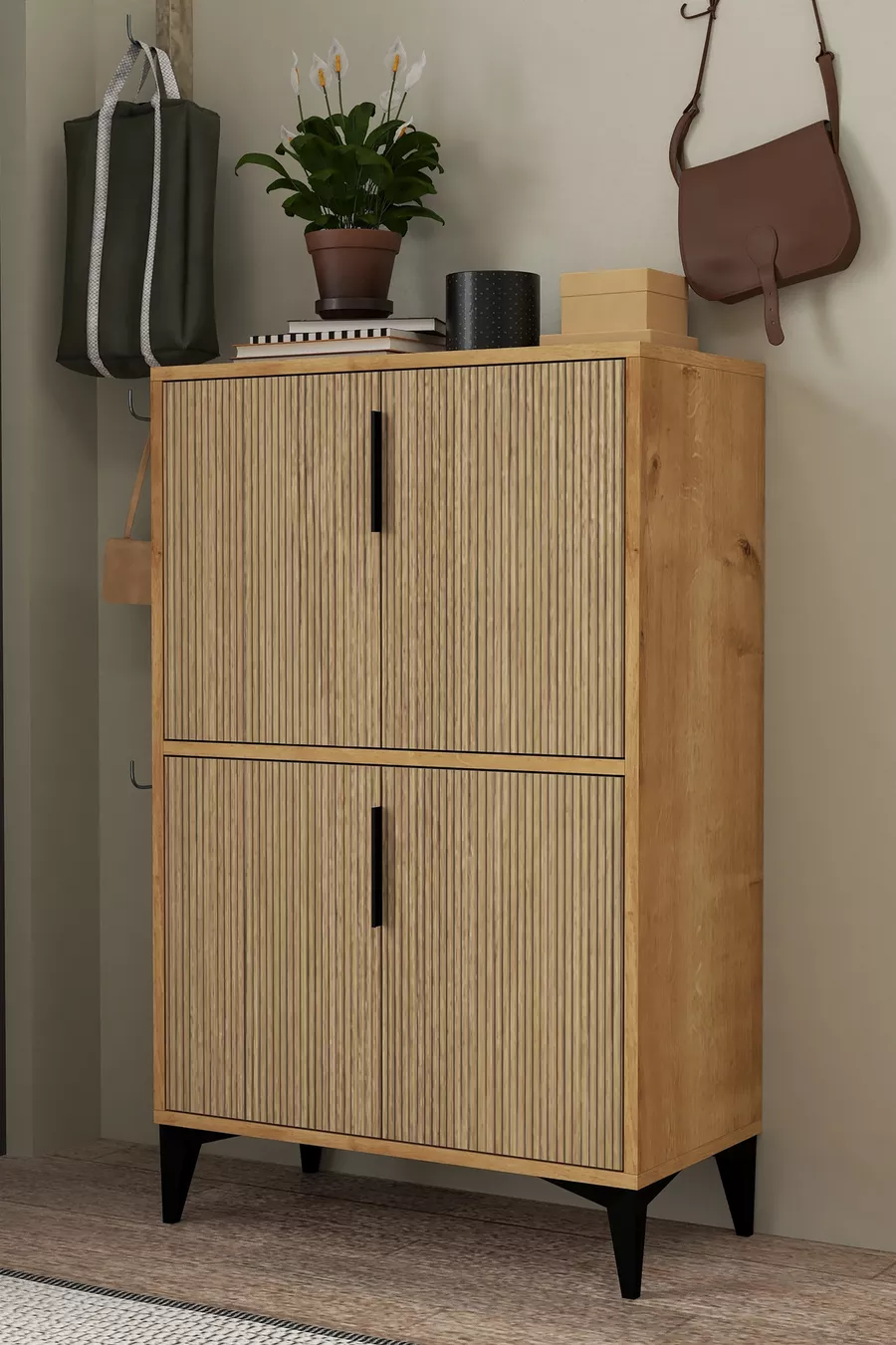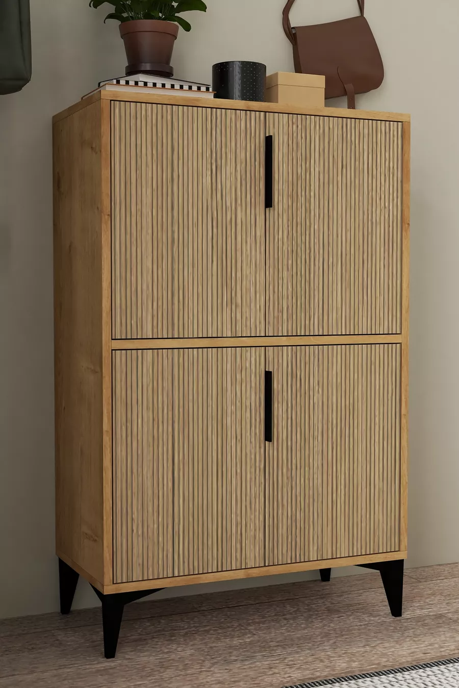 Material: Particleboard Color: Brown Height: 114 cm Width: 72 cm Depth: 37 cm Warranty Period: 2 Years Style: Scandinavian Theme / Style: Scandinavian Origin: TR Feature: With shelves