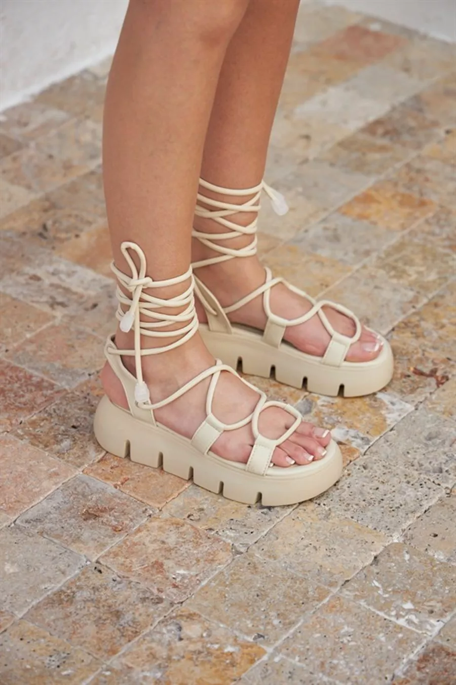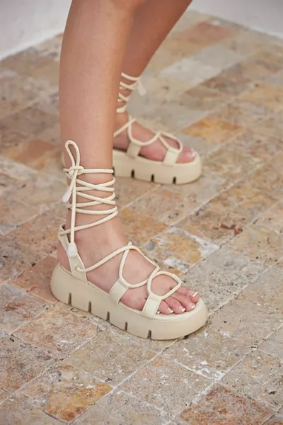 Heel Type: Chunky Heel Season: Summer Upper Material: Synthetic Leather Sole Material: Poly Heel Height: Mid Heel (5-9 cm) Insole Material: Synthetic Leather Material: Polyurethane Color: Beige Lining Material: Synthetic Leather Closure Type: Lace-up Persona: Sexy Additional Feature: Orthopedic Sole Sustainability Detail: Yes Material Composition: 60% synthetic leather, 40% poly Occasion: Day / Night Washing Instructions: Type 4 Pattern: Solid Fabric Type: Not Specified Collection: Licensed Product Detail: Synthetic Leather Origin: TR Box Condition: Boxed Outer Material: Cotton