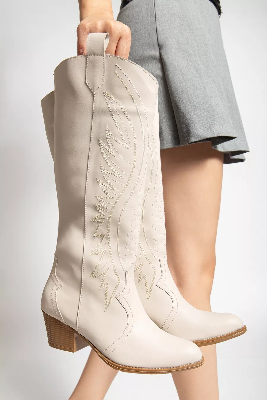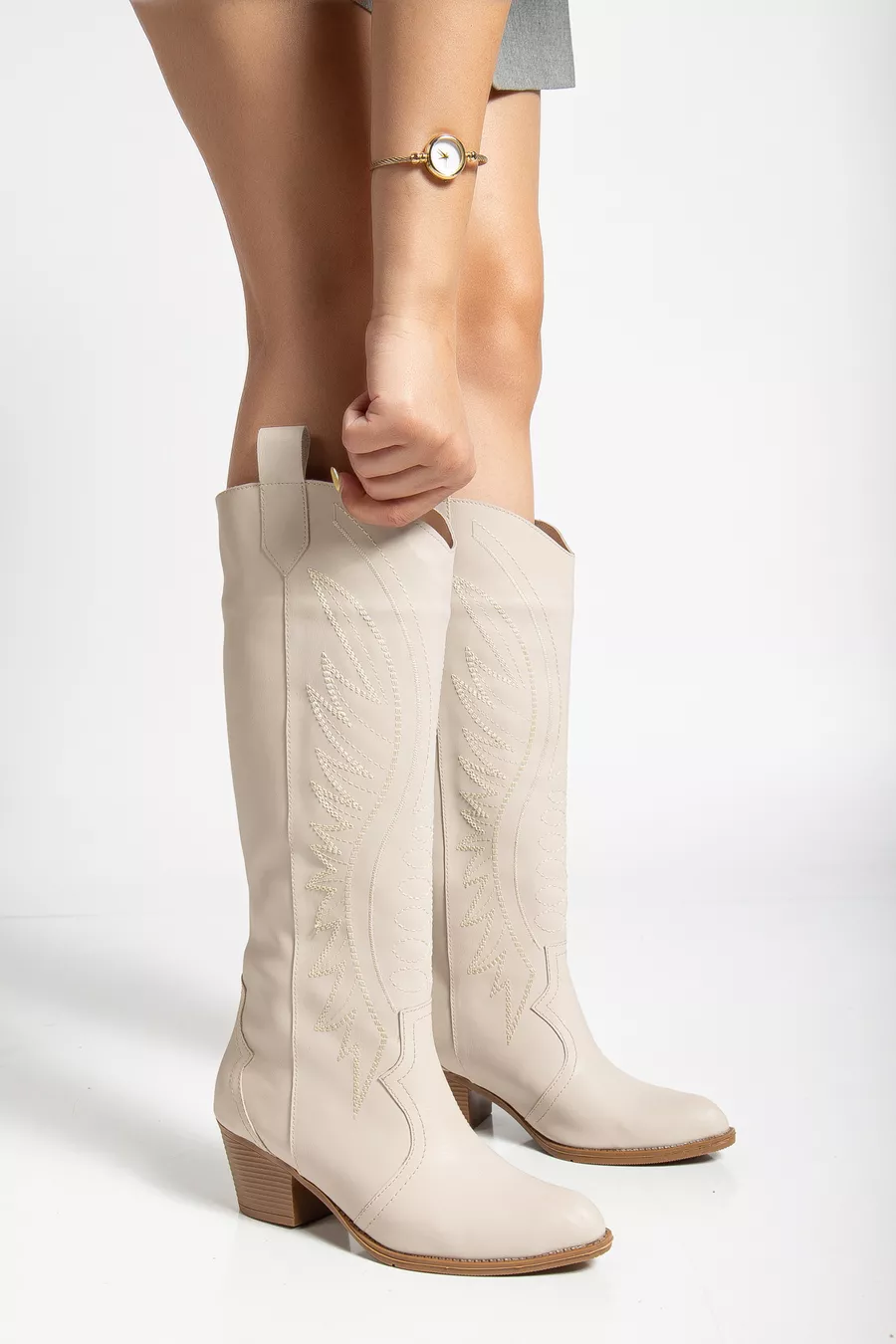 Pattern: Embroidered / Detailed Lining Material: Faux Leather Material: Faux Leather Heel Height: Mid Heel (5-9 cm) Heel Type: Block Heel Color: Beige Closure Type: Slip-On Sole Material: Thermoplastic Upper Material: Faux Leather Insole Material: Faux Leather Sustainability Detail: No Washing Instructions: Type 4 Fabric Type: Faux Leather Occasion: Casual/Daily Product Detail: Faux Leather Origin: TR Toe Type: Round Box Condition: No Box Outer Material: Faux Leather