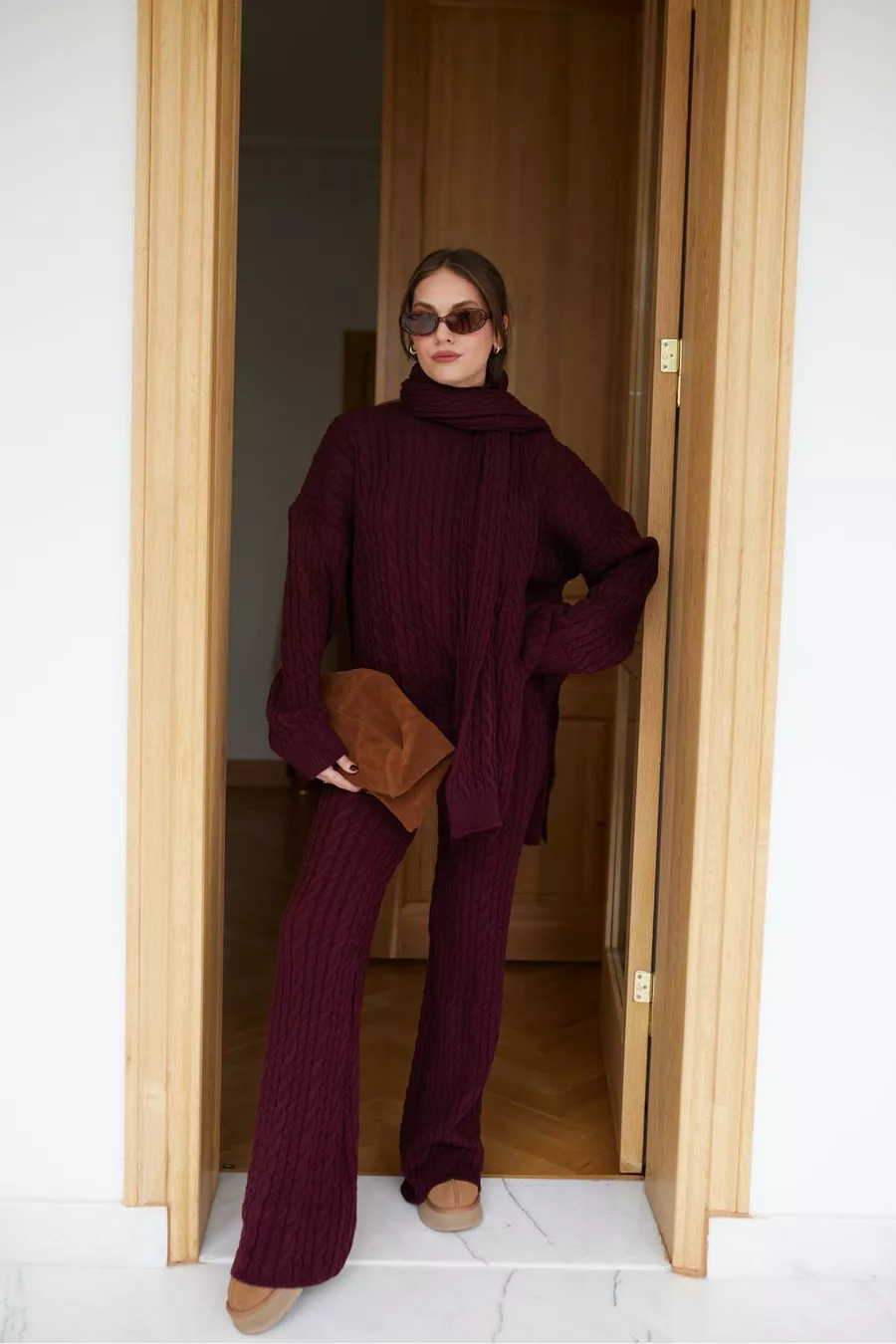 Aurane Burgundy Scarf Braided Knit Pants Set