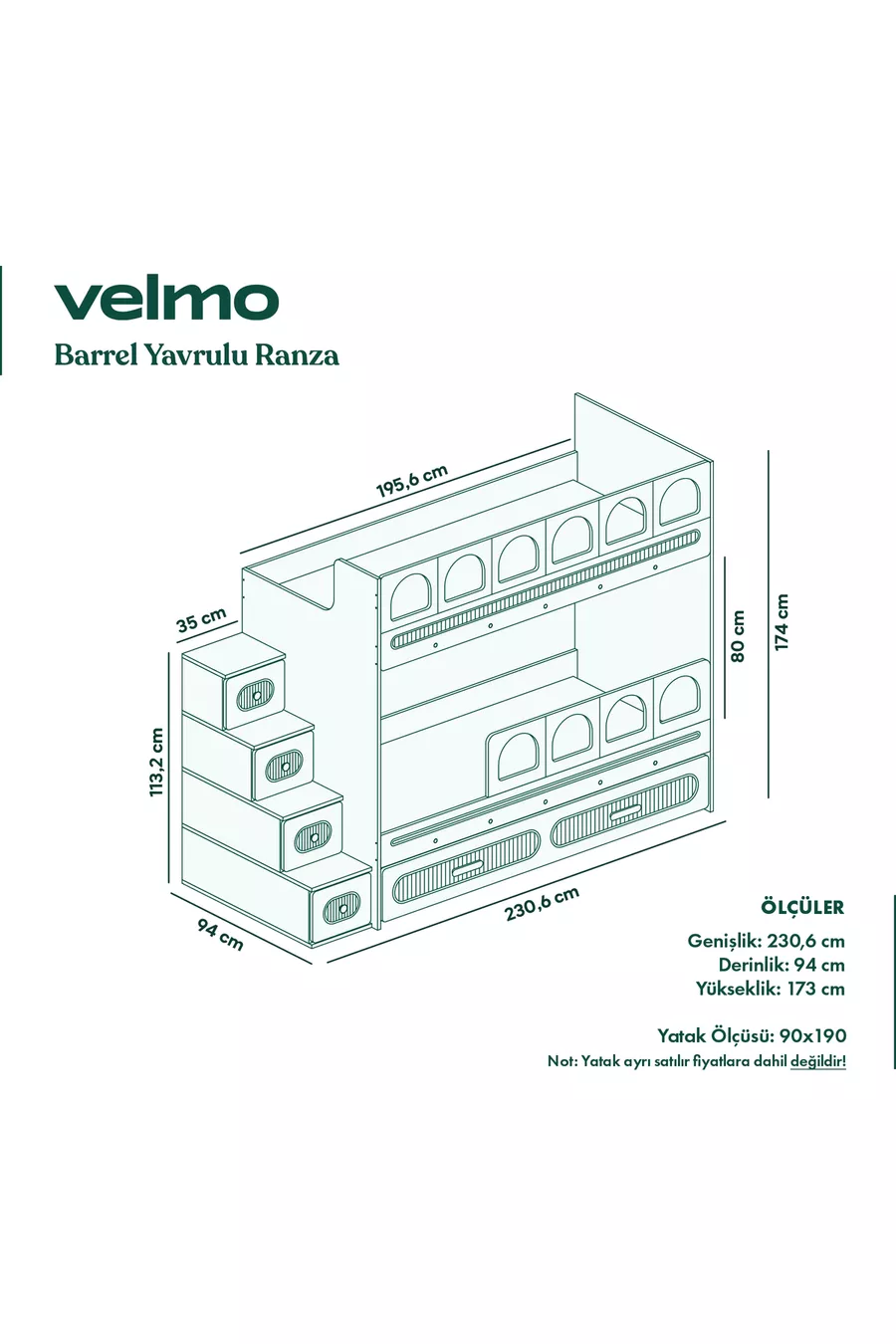 Color: Green Material: MDF Size: Double Dimensions: 90 x 190 Warranty Period: 2 Years Style: Scandinavian Theme / Style: Scandinavian Bunk Bed: Yes Origin: TR