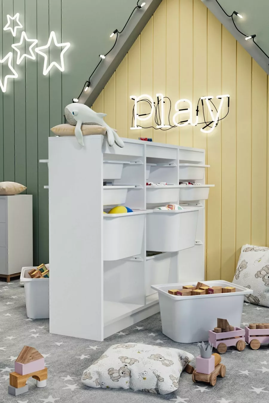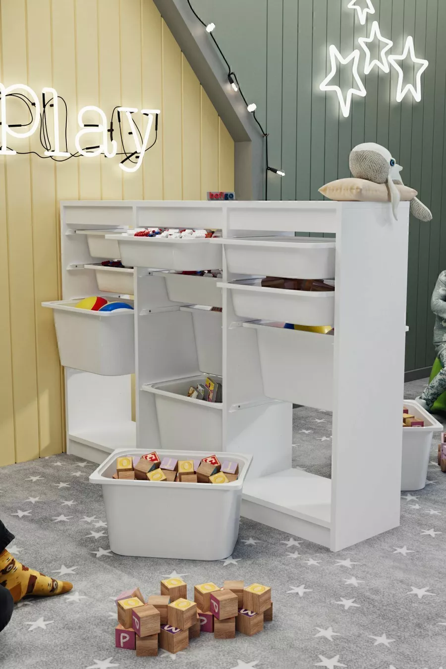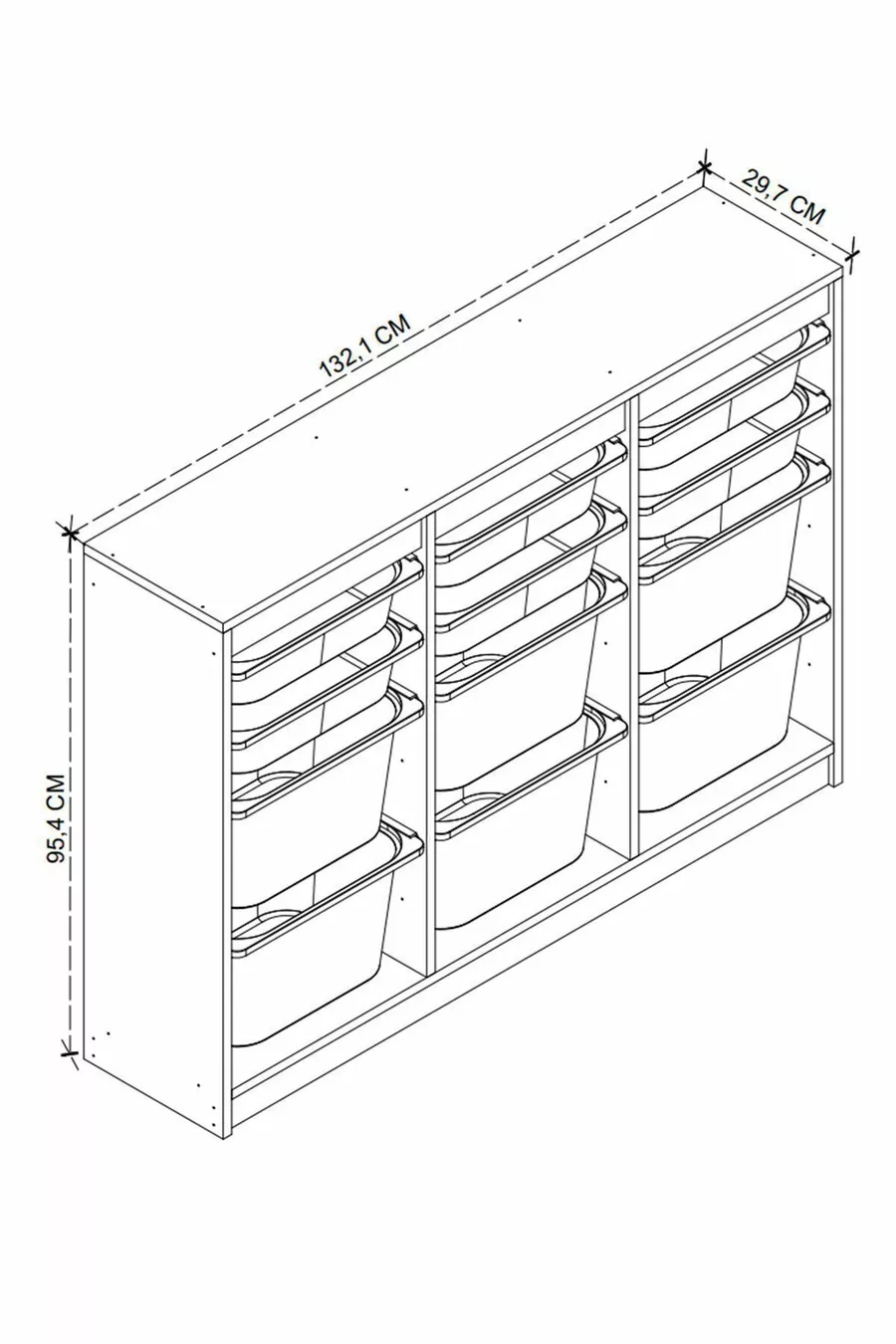 Material: Laminated Chipboard Number of Drawers: 12 Width: 132 cm Depth: 30 cm Height: 95 cm Color: White Theme / Style: Modern Age: 4 - 8 Years