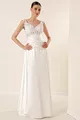 Beaded Guipure Transparent Draped Lined Long Satin Dress Ecru
