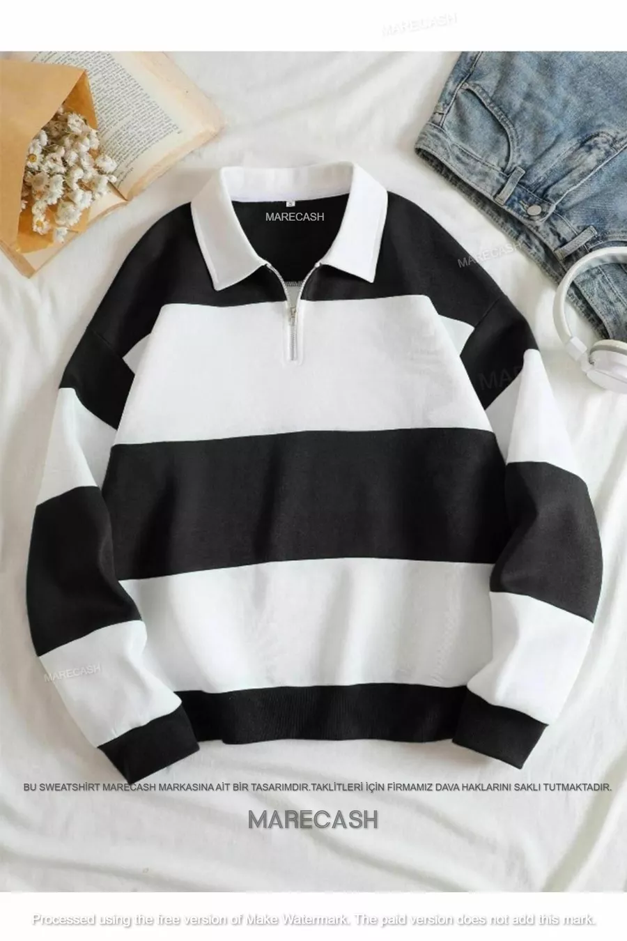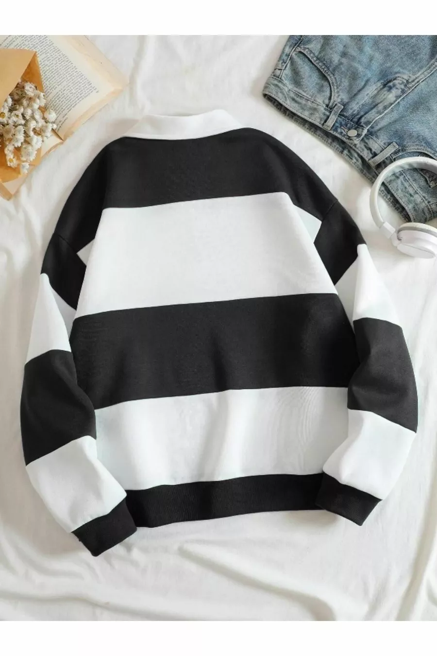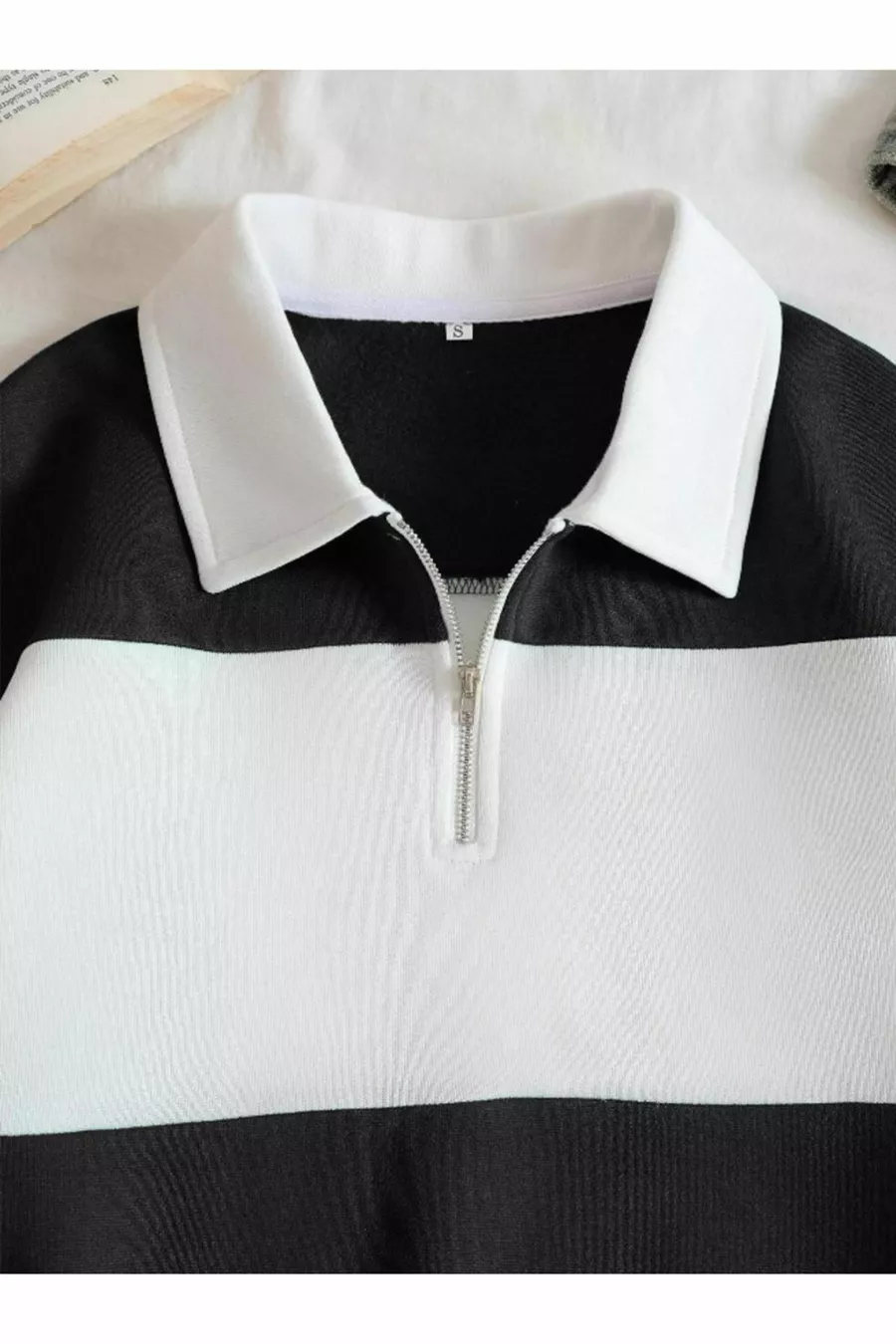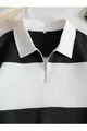 Black and White Color-Blocked Solid Half-Zip Polo Collar Sweatshirt, Non-Bleeding Fabric