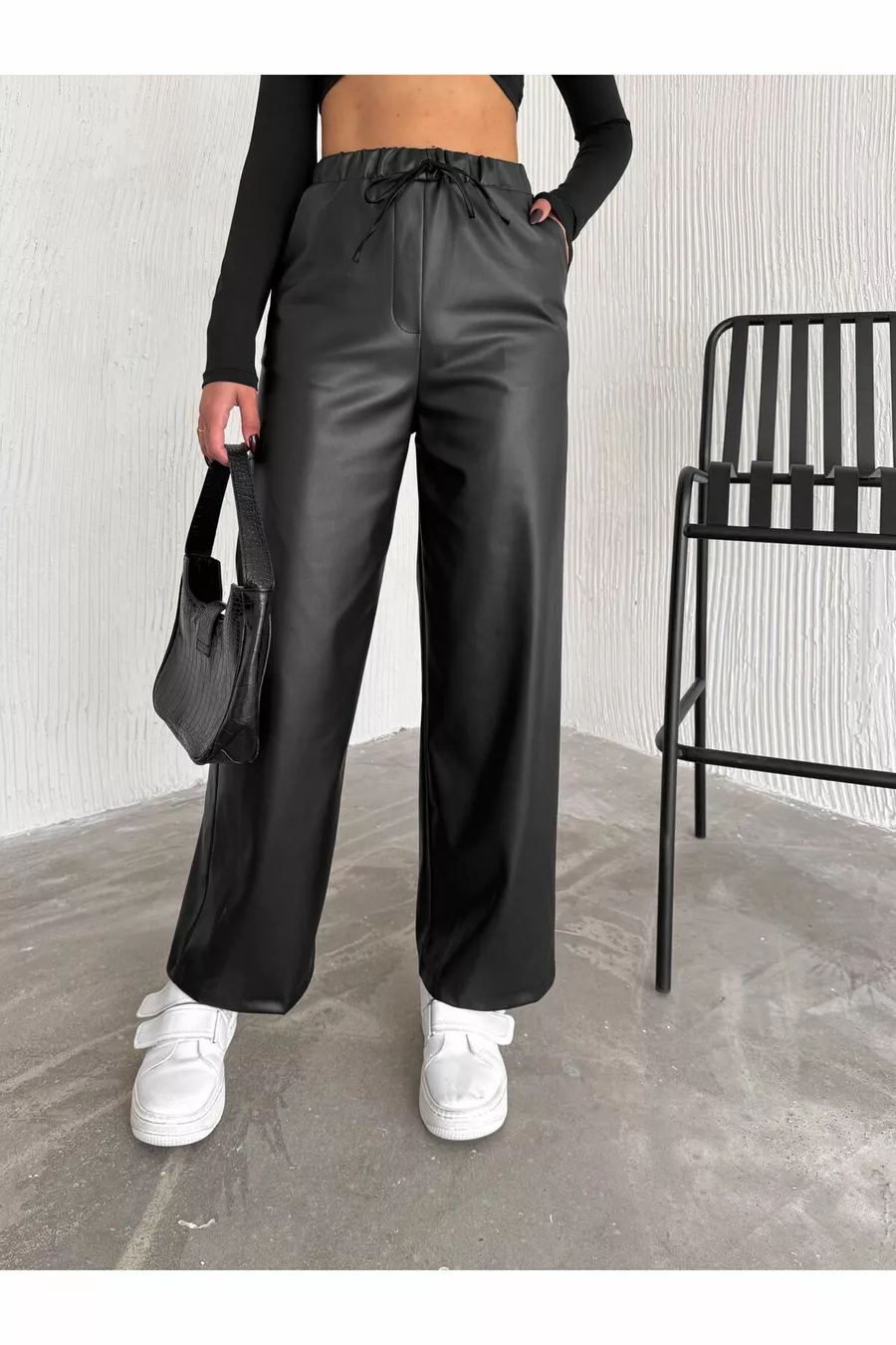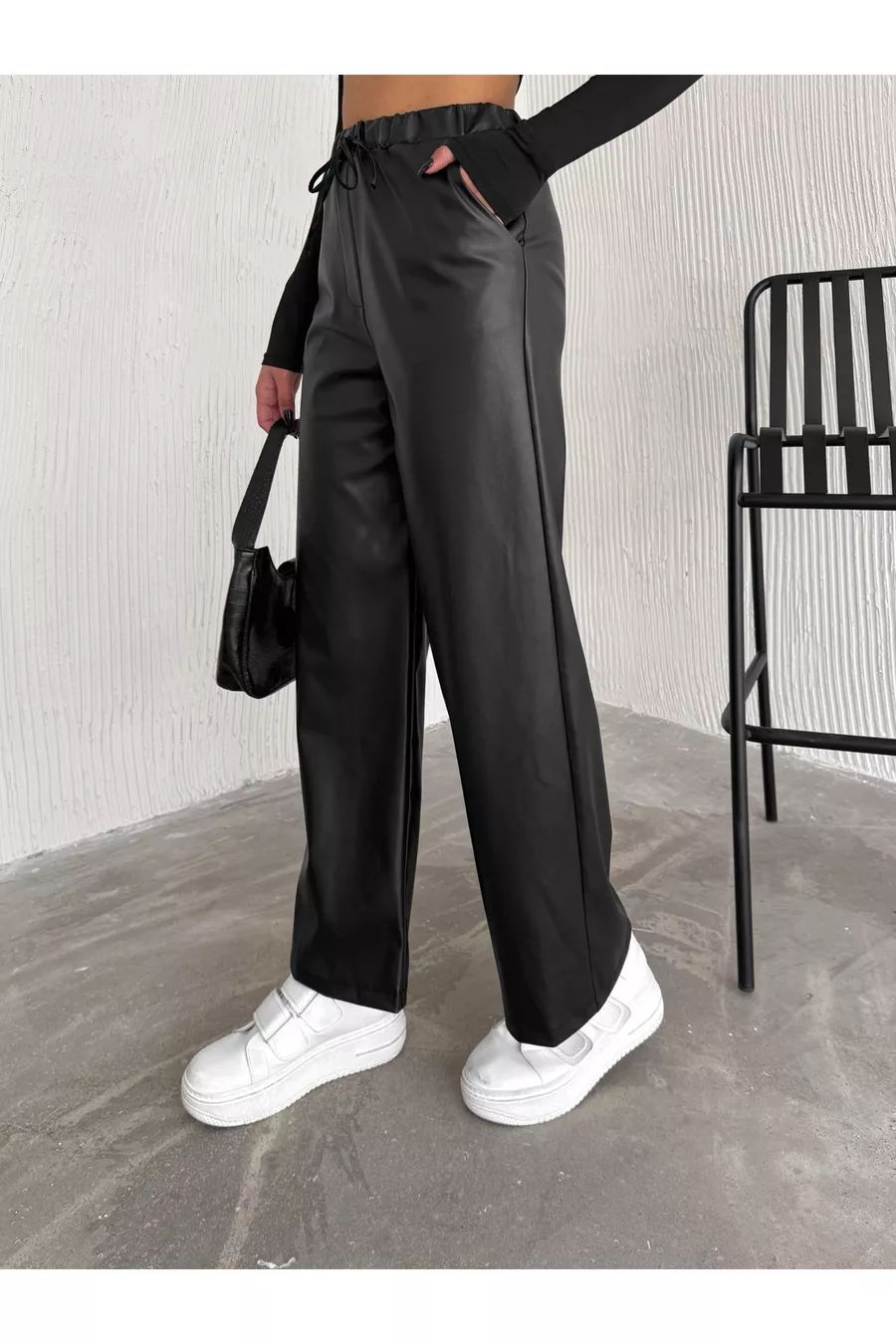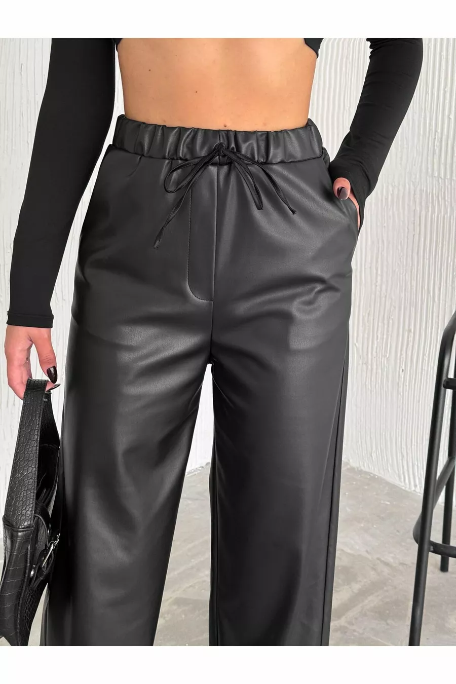 Black Elastic Waist Drawstring Palazzo Leather Pants