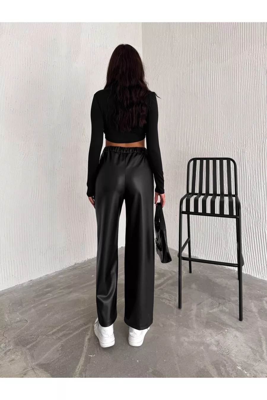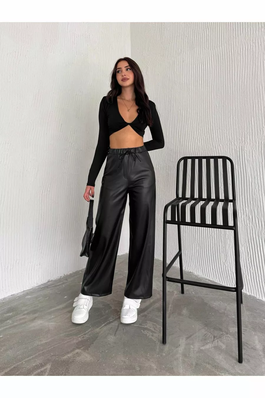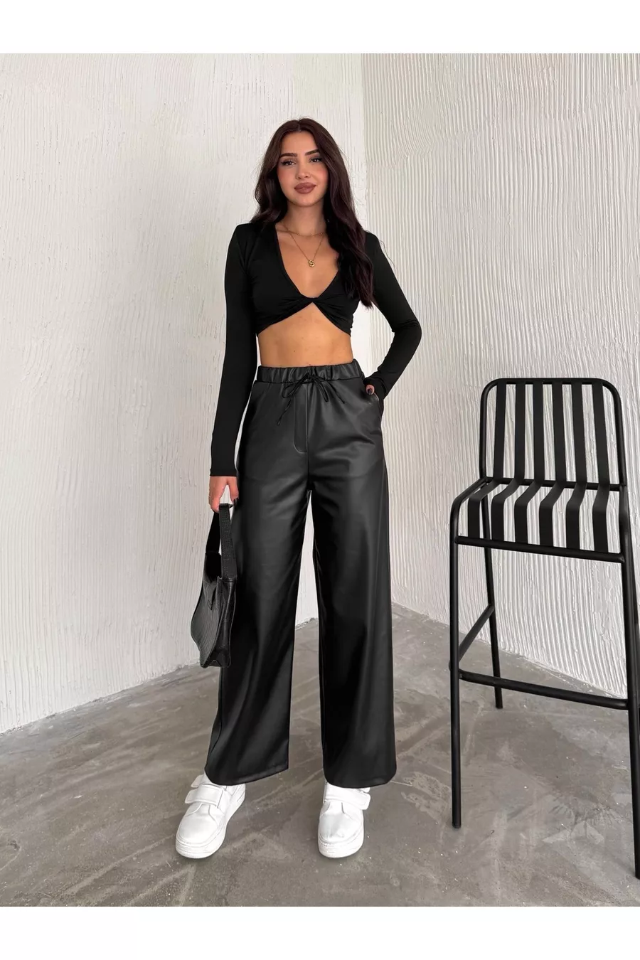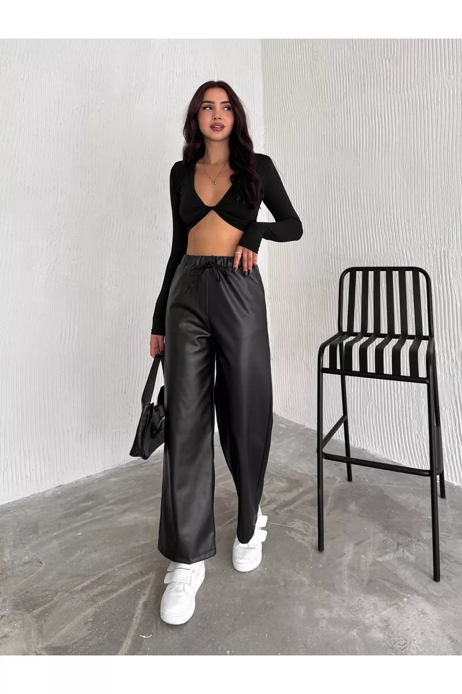 Black Elastic Waist Drawstring Palazzo Leather Pants