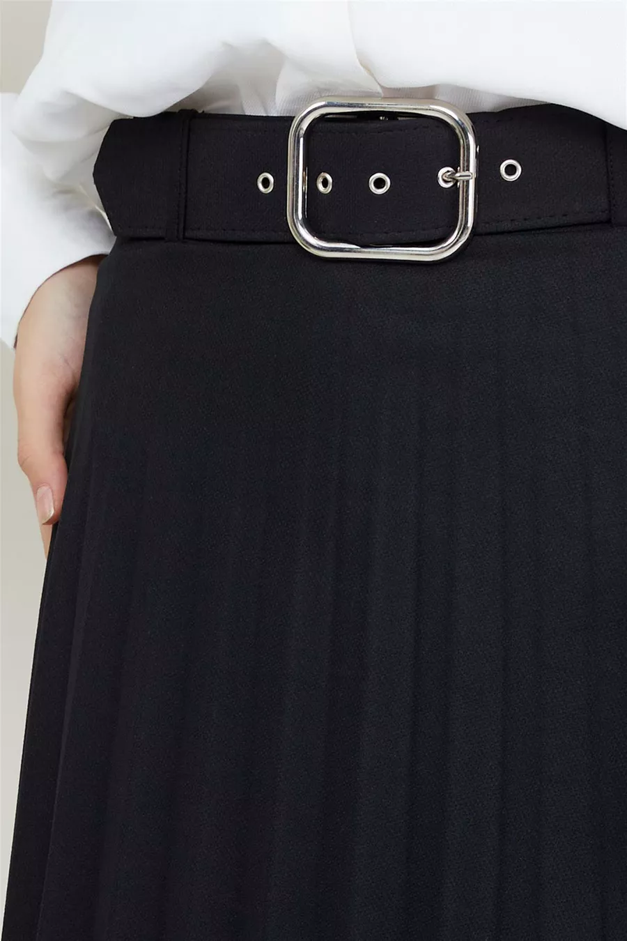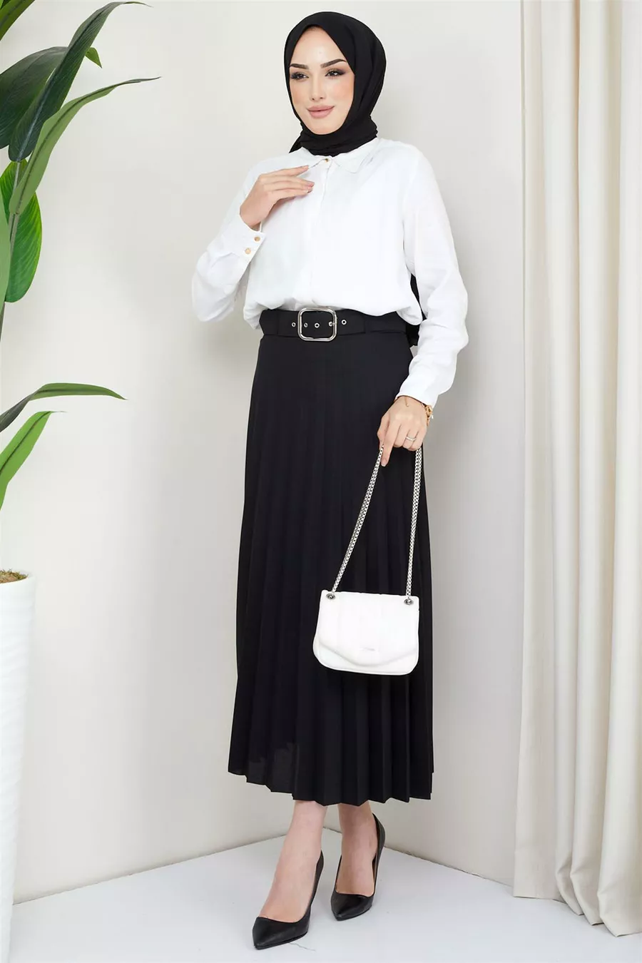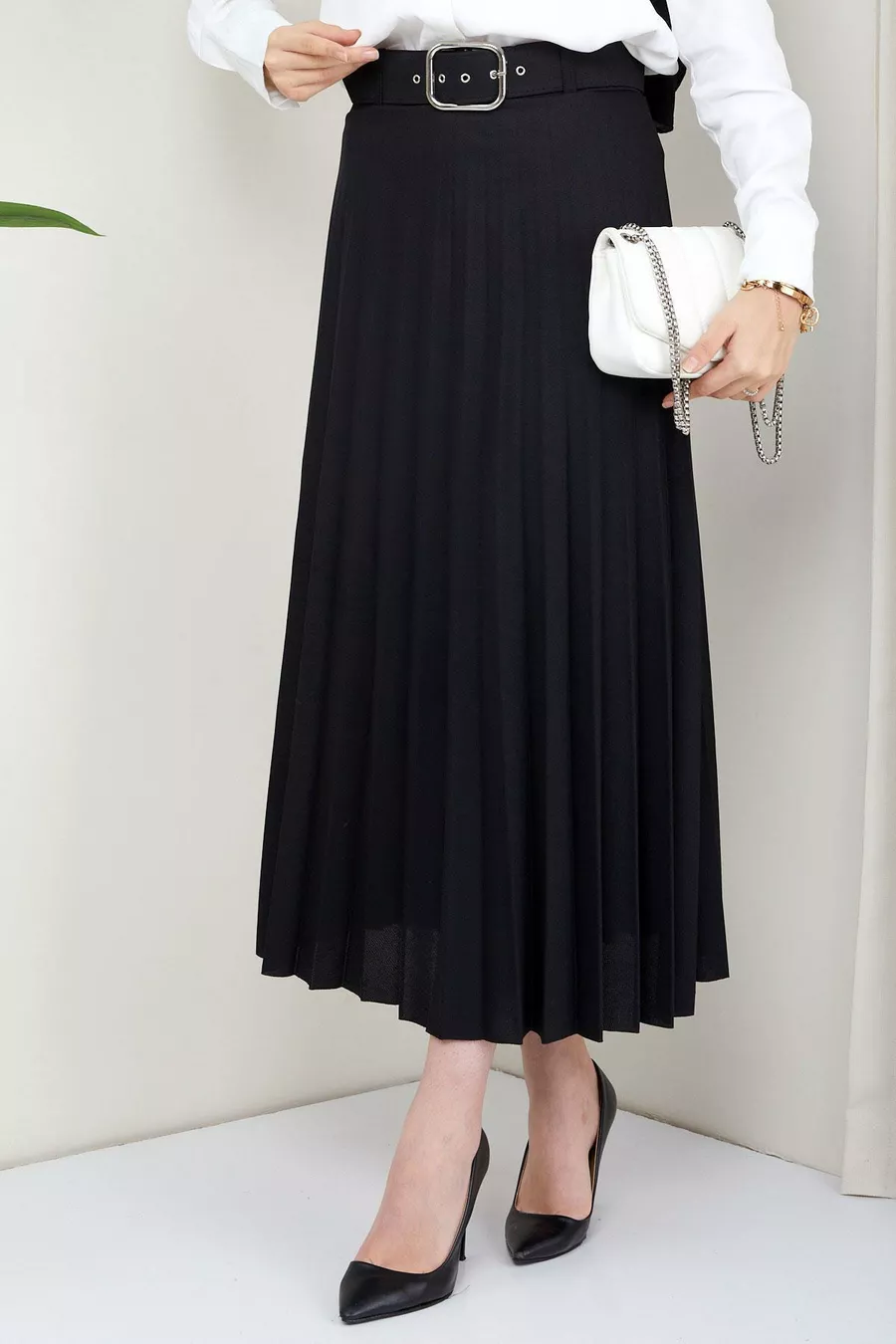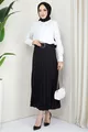 Silhouette: Pleated Fit: Regular Pattern: Plain Fabric Type: Woven Material: Fabric Color: Black Product Detail: With Belt Collection: Modest Wear Waist: Elastic Pocket: No Pockets Additional Feature: Elastic Waist Length: Maxi Belt/Sash Status: With Belt Closure Type: Elastic Sustainability Detail: No Lining: Unlined Occasion: Casual/Everyday Washing Instructions: Type 1 Origin: TR Box Condition: No Box Package Content: Single