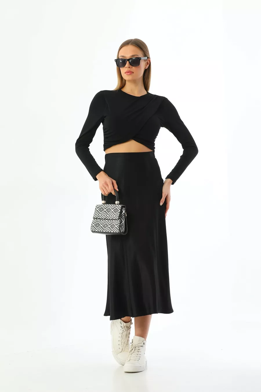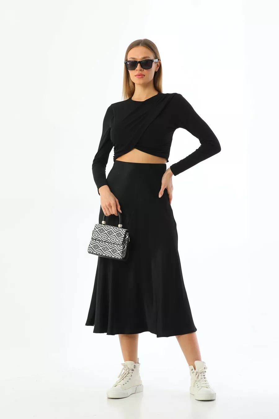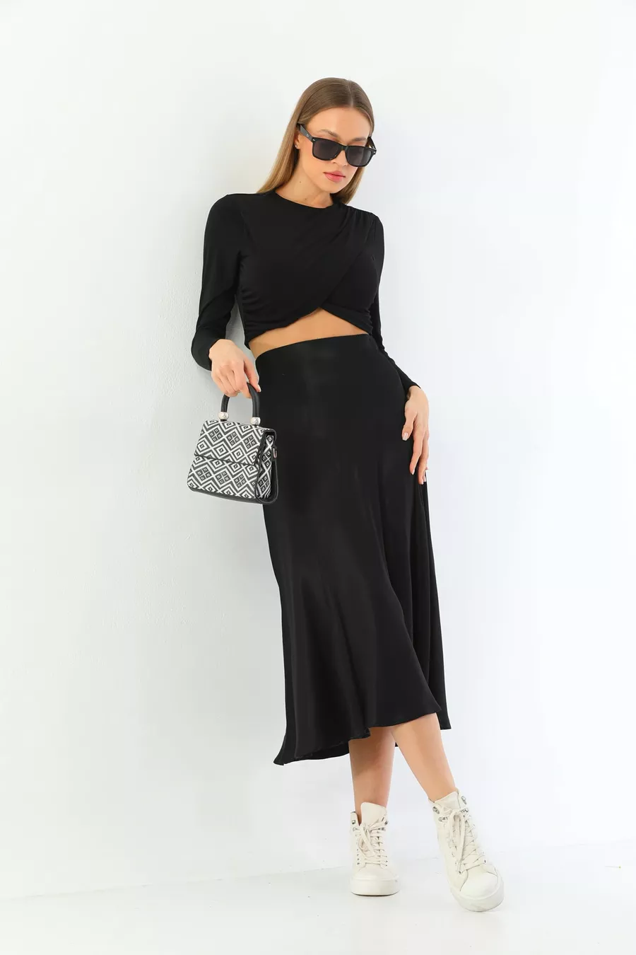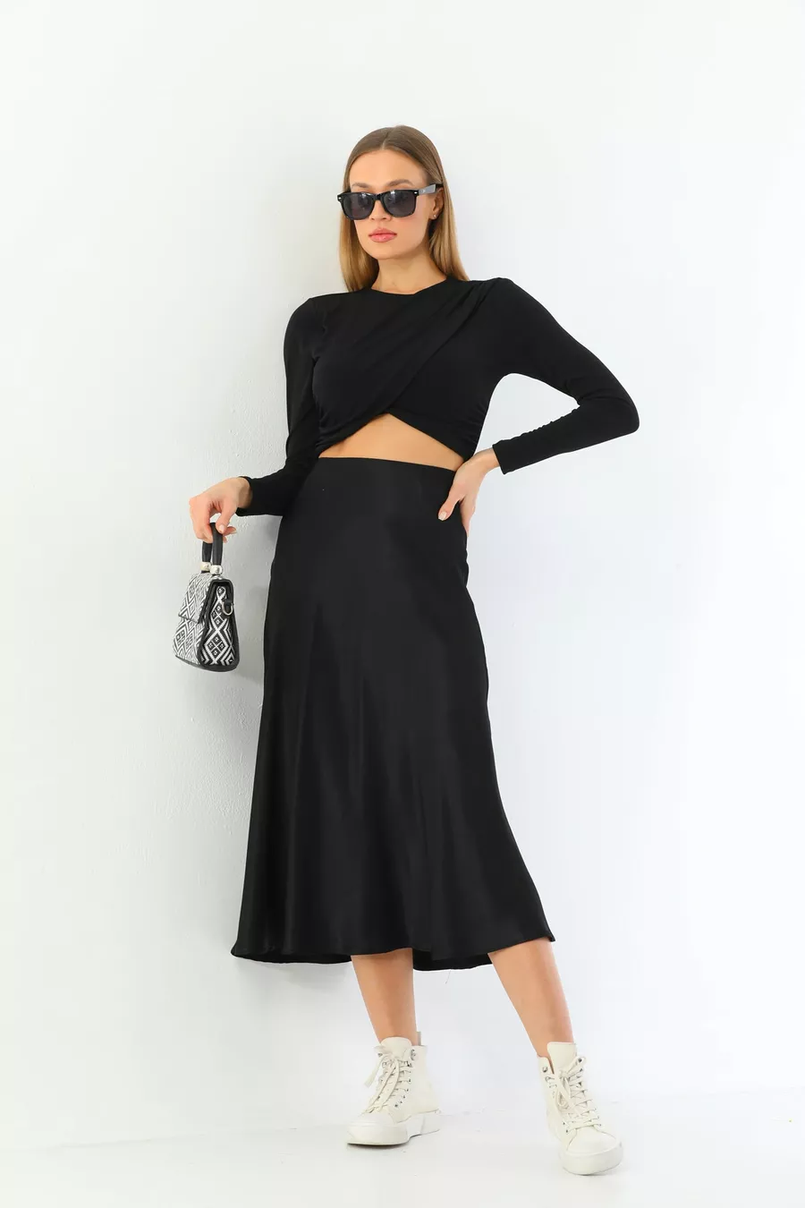 Box Condition: No box Material: Satin Fabric Type: Woven Pattern: Solid Color: Black Product Type: Solid Product Detail: Elasticated Pocket: No pockets Collection: Basic Thickness: Medium Lining: Unlined Length: Midi Silhouette: Flared Occasion: Casual Fit: Regular Additional Feature: Satin Weave Type: Satin Persona: Fashion Forward Sustainability Detail: No Belt/Waistband: No belt Waist: High Waist Washing Instructions: Type 1