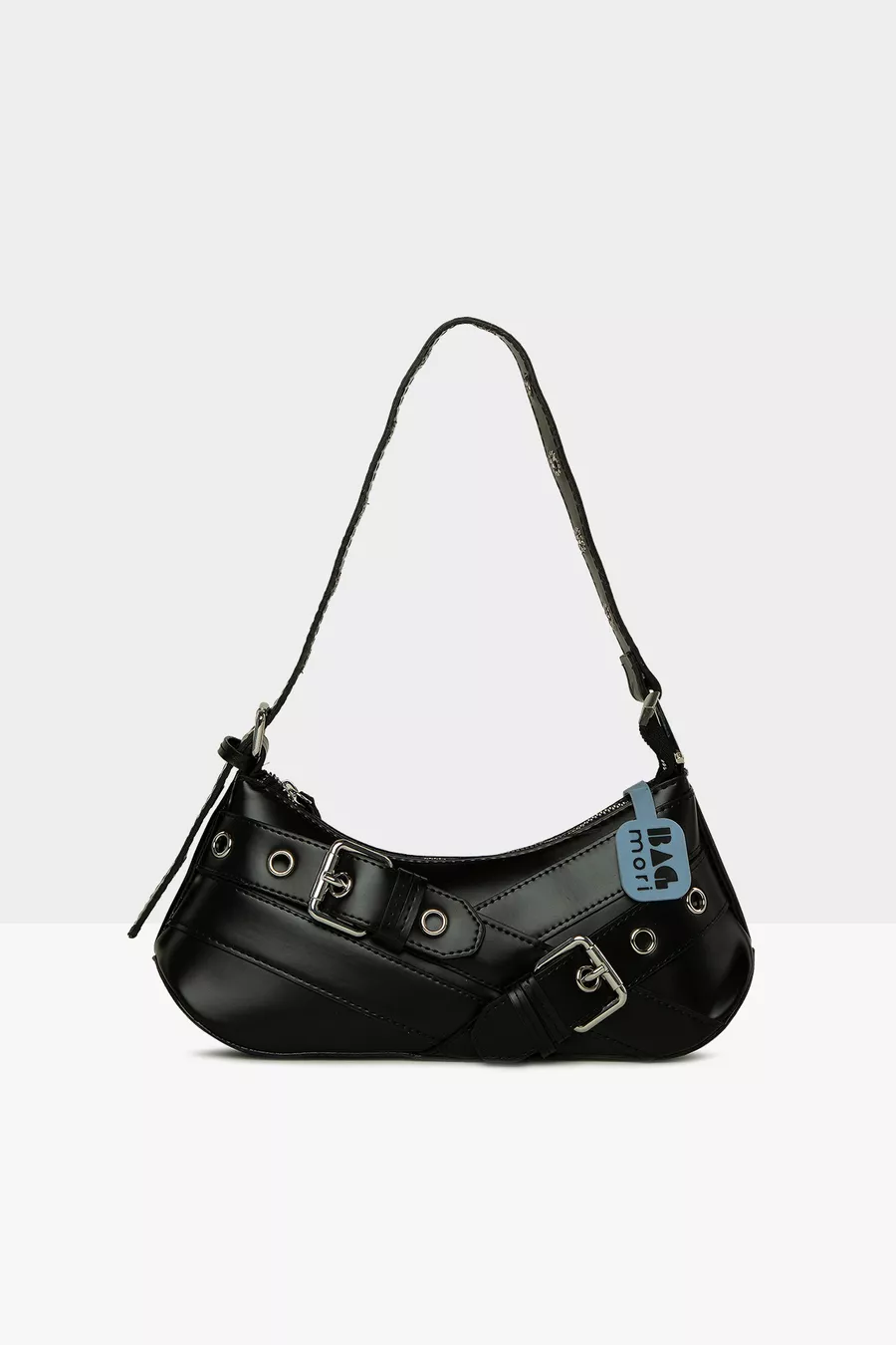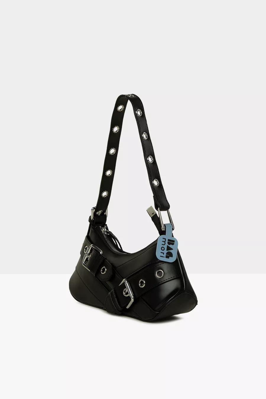 Black Women's Shoulder Bag with Belt Accessory and Strap Detail