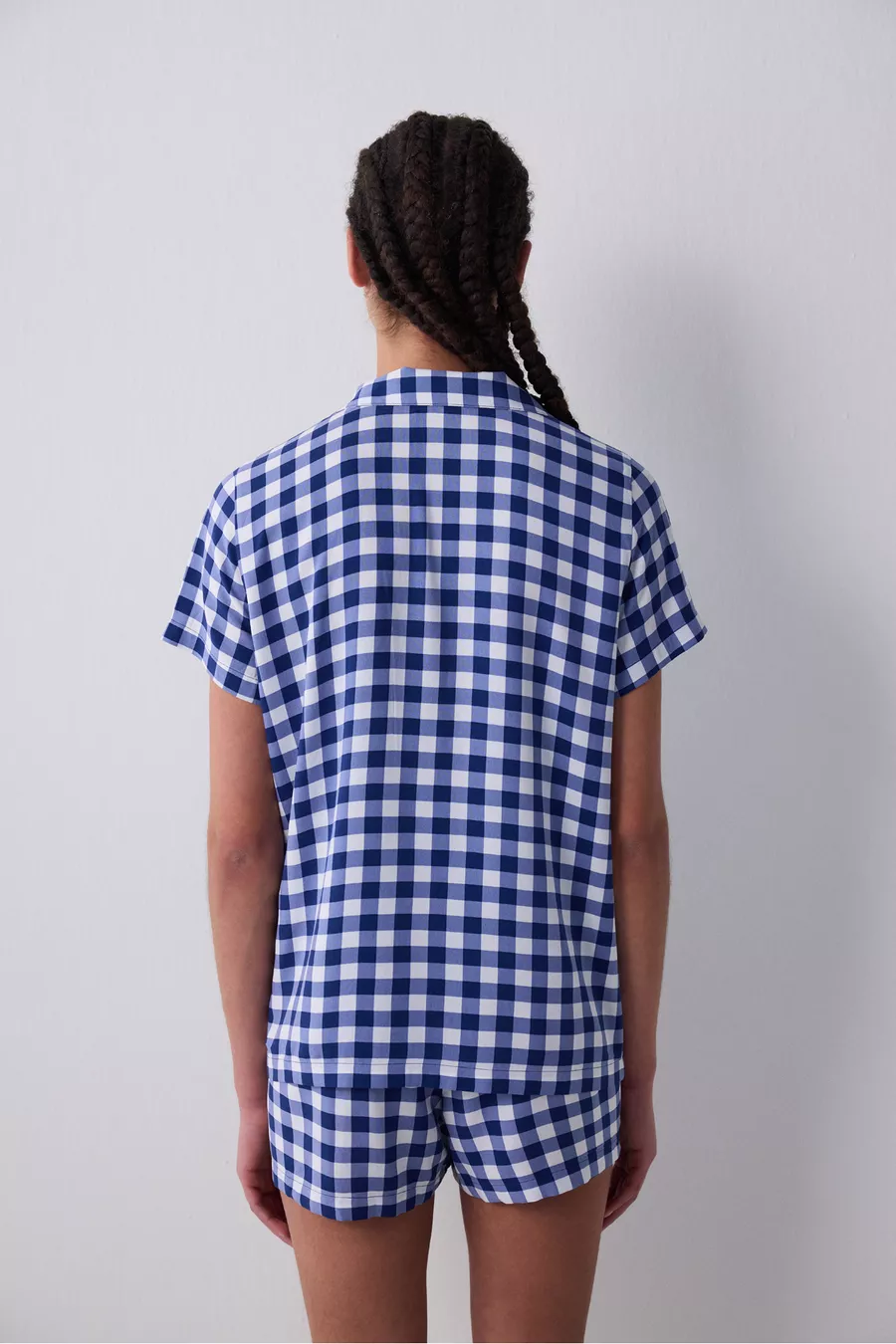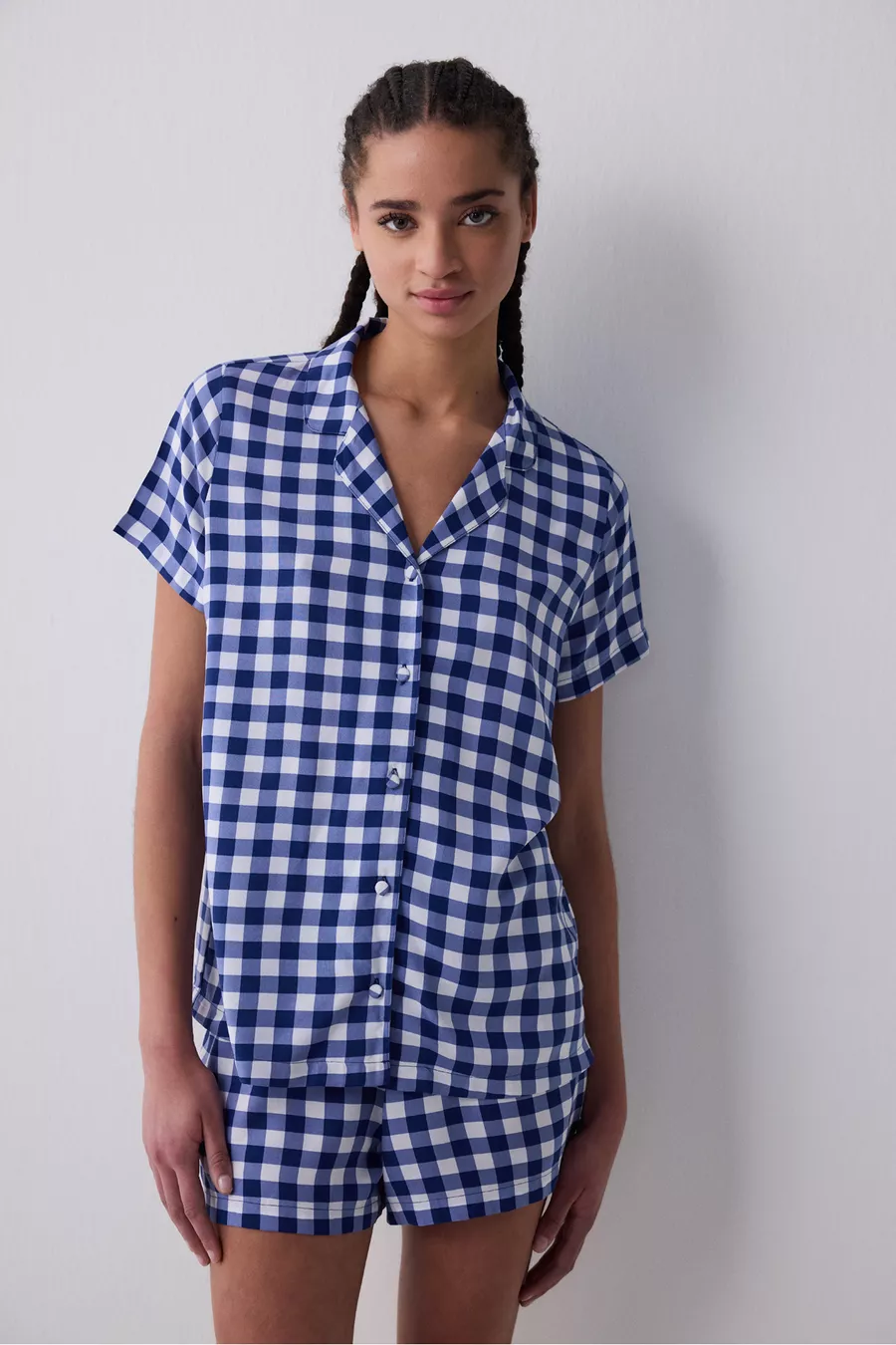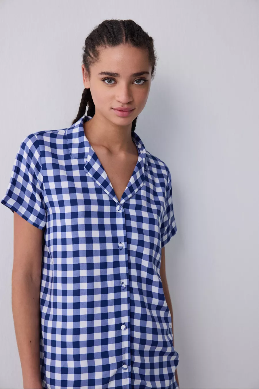 Sleeve Type: Short Sleeve Sustainability Detail: No Pattern: Plaid / Checkered Collar Type: V Neck Pant Length: Short Material: Cotton Color: Navy Product Type: Printed Sleeve Length: Short Fit: Regular Fabric Type: Woven Silhouette: Basic Setting: Homewear Material Composition: 100% Viscose Washing Instructions: T44 Leg Type: Tapered Leg Size: Large Origin: TR