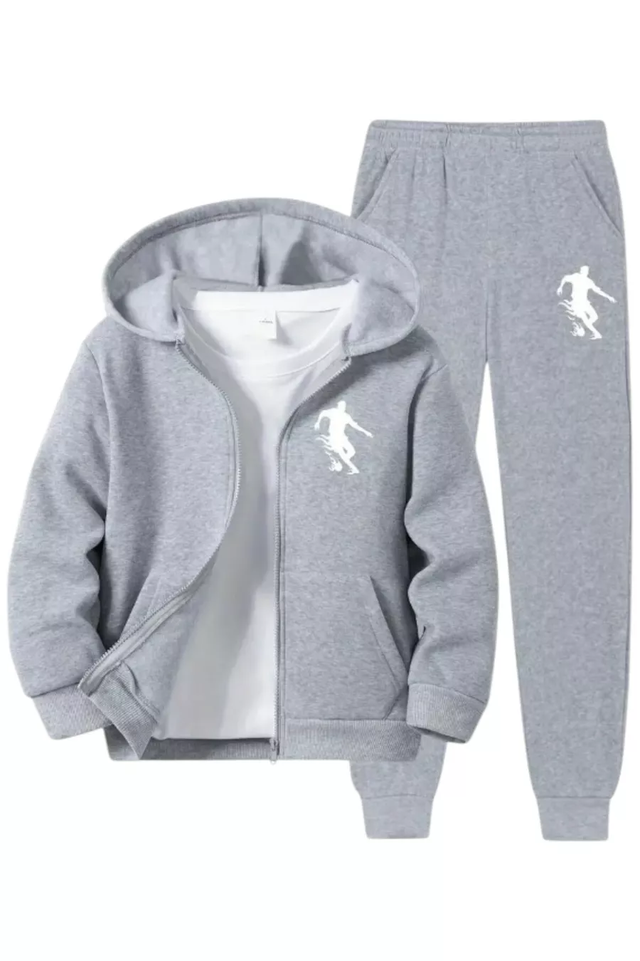 Fabric Type: Knitted Material: Polyester Blend Pattern: Printed Fit: Regular Neck Type: Hooded Color: Gray Product Details: Zipper Pocket: Double pocket Product Type: Printed Sleeve Length: Long Sleeve Type: Standard Sleeve Collection: Unisex Thickness: Medium Waist: Elastic Cuff Type: Elastic Cuff Silhouette: Regular Occasion: Casual/Daily Length: Regular Bottom-Top Set: Sweatshirt-Track Pants Additional Feature: Wrinkle resistant Weave Type: 2-Ply Without Carding Persona: Cool & Comfort Belt/Strap Status: Drawstring Print/Embroidery Technique: Digital Print Number of Pieces: 2 Lining Status: Unlined Sustainability Detail: Yes Washing Instructions: T09 Package Contents: 2-piece Origin: TR Box Status: No box