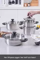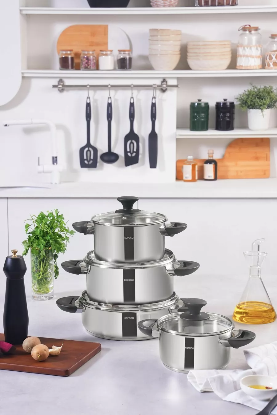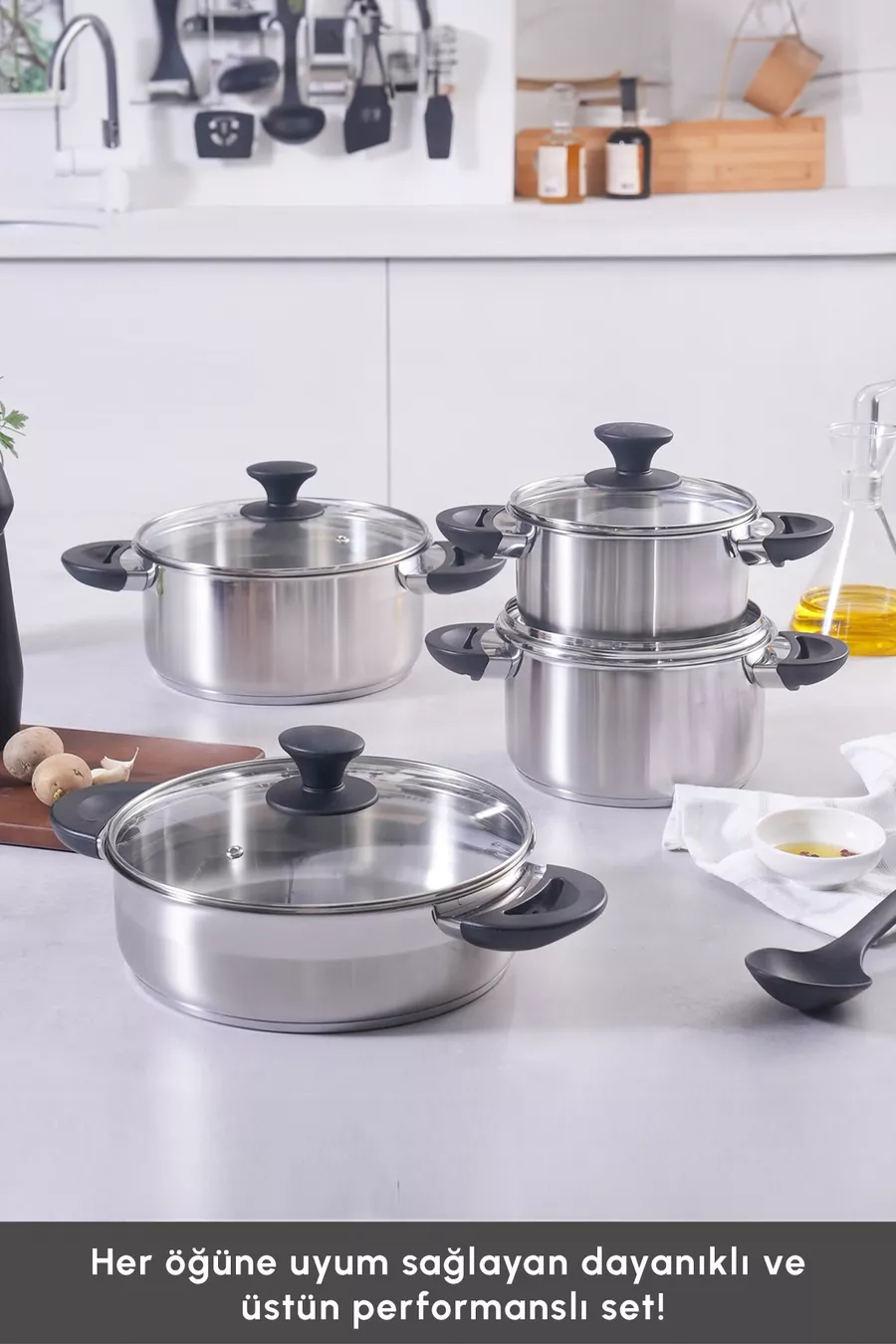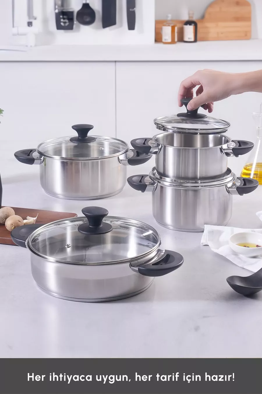 Color: Silver Feature: Suitable for induction cooktop Outer Material: Steel Inner Material: Steel Number of Pieces: 8 Origin: TR Care Instructions (Food Contact): Not microwave safe. Material: Steel