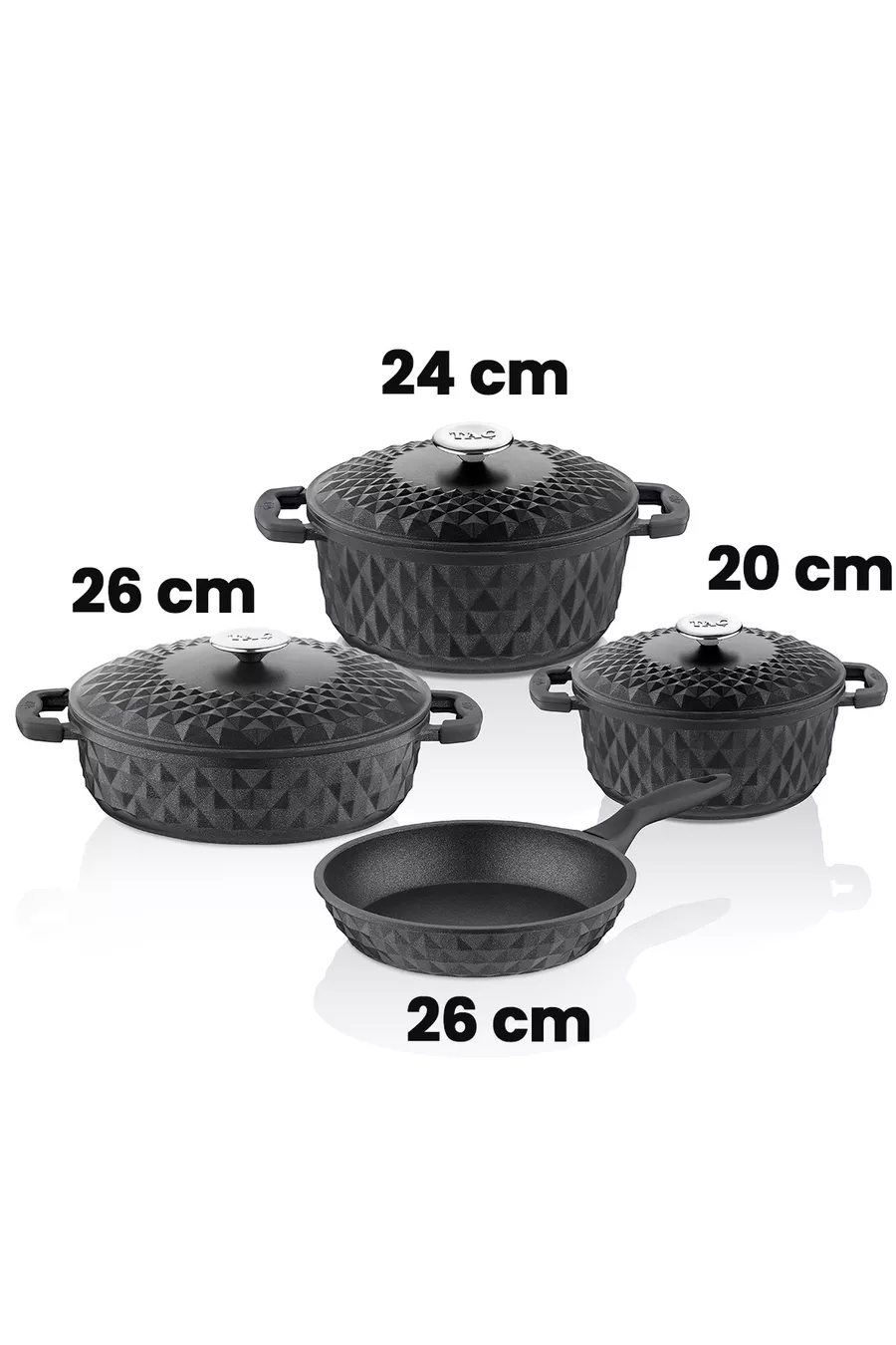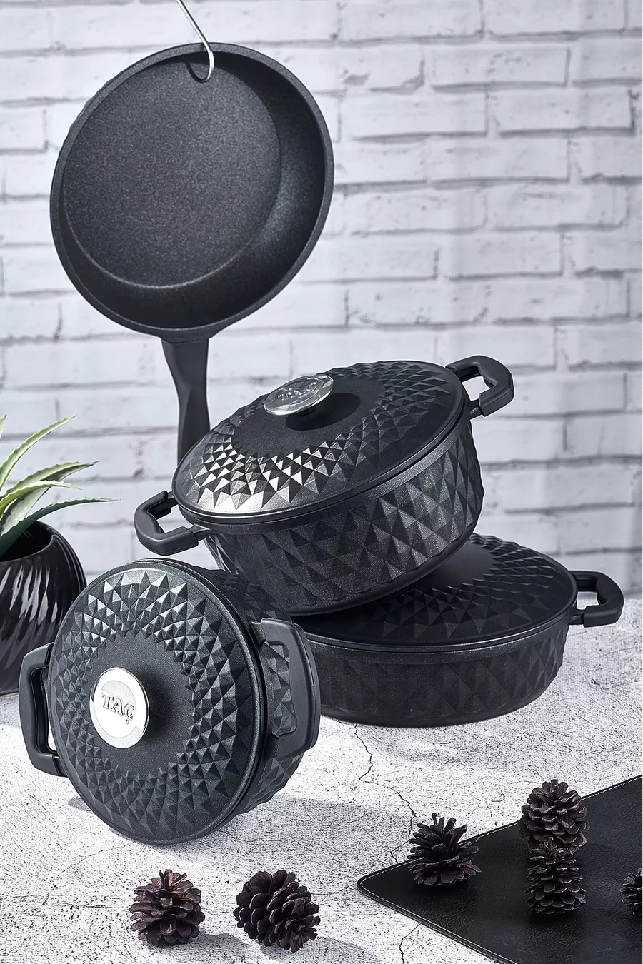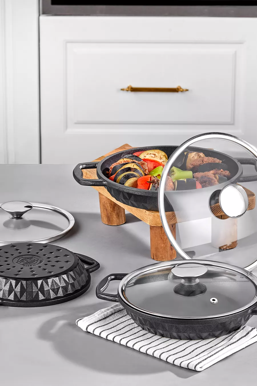 Color: Black Size/Dimension: 28 cm Capacity: 3.8 L Feature: Non-stick Base Outer Material: Cast Iron Inner Material: Cast Iron Number of Pieces: 16 Origin: TR Material: Cast Iron