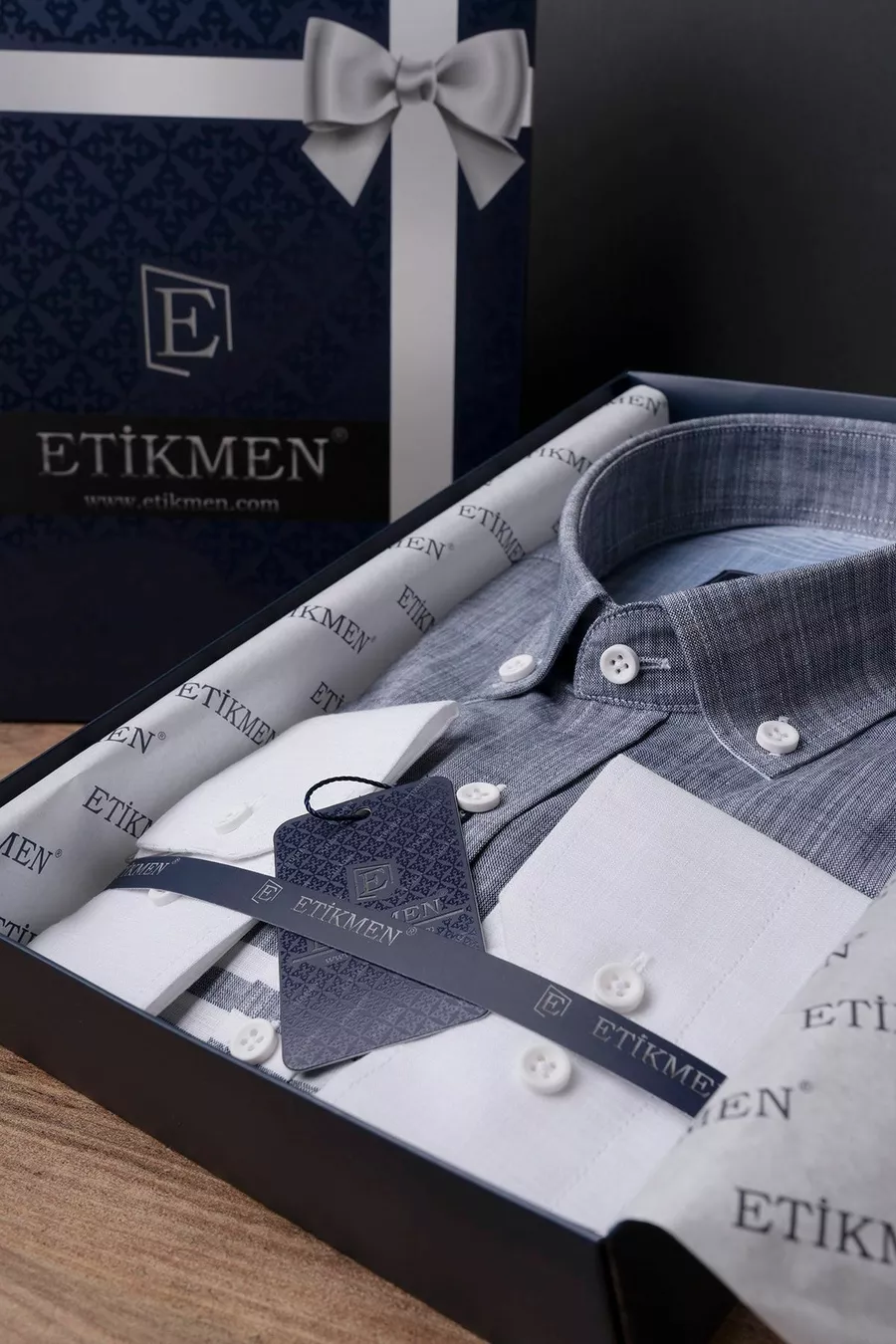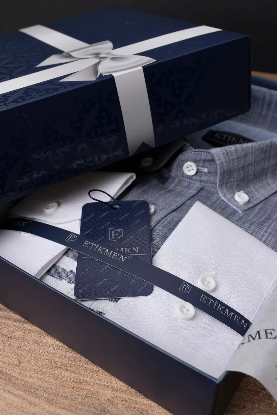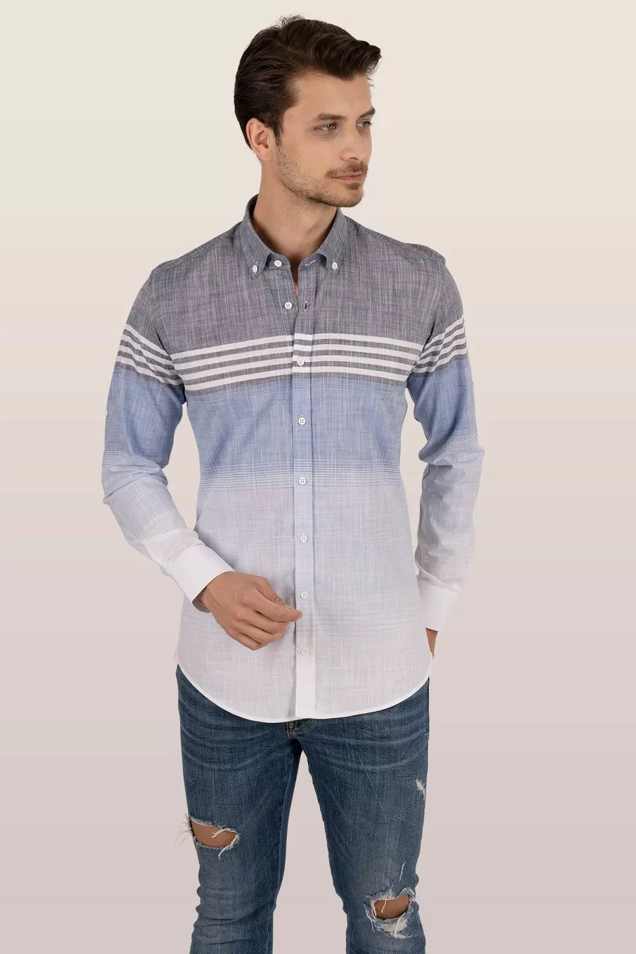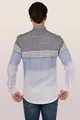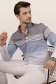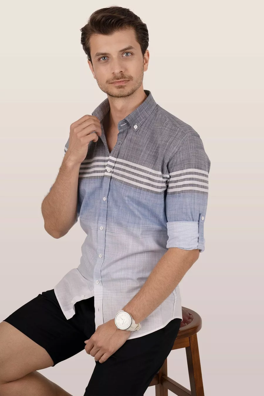 Checkered Gray Blue Striped Linen Slim Fit Men's Shirt