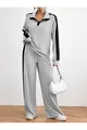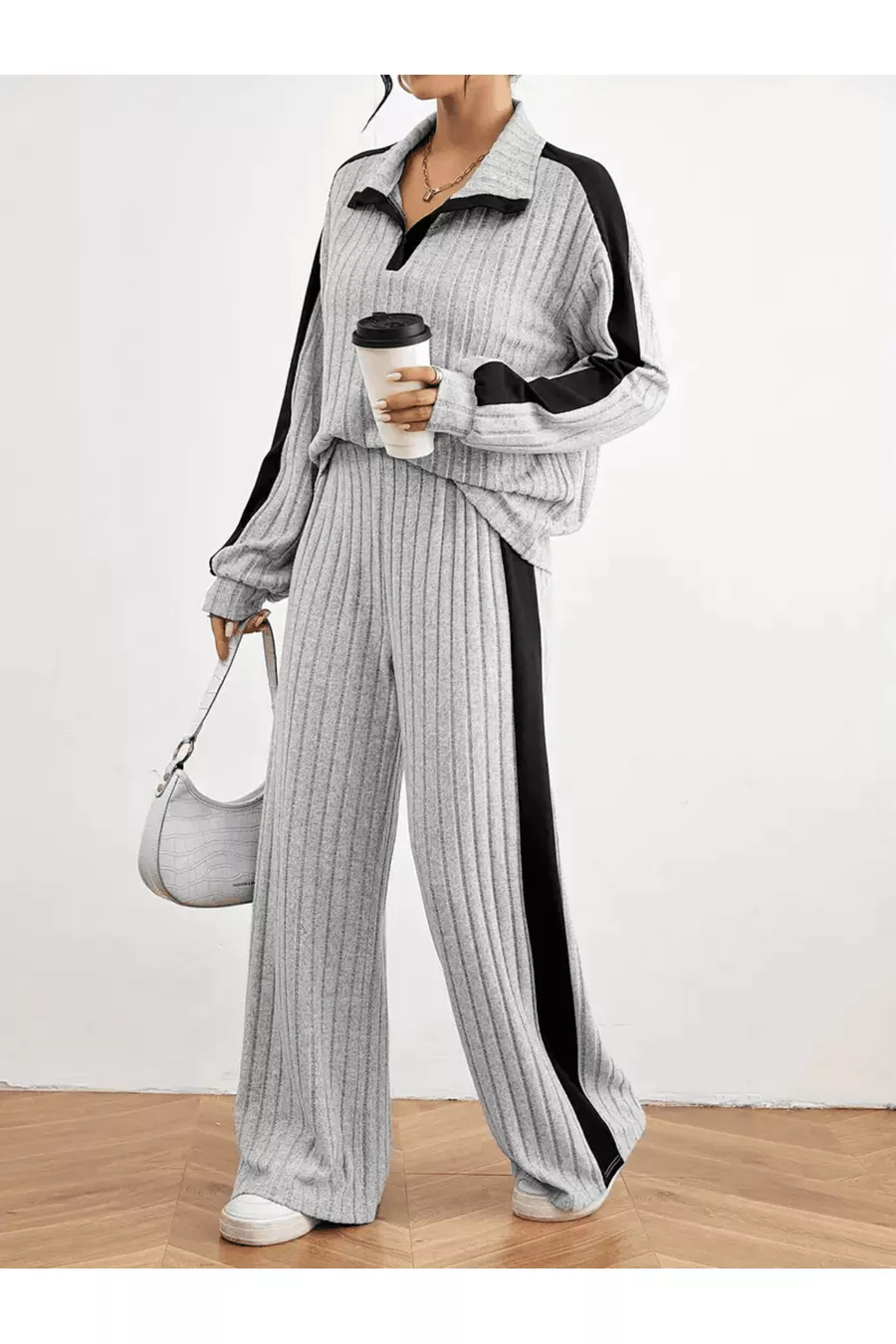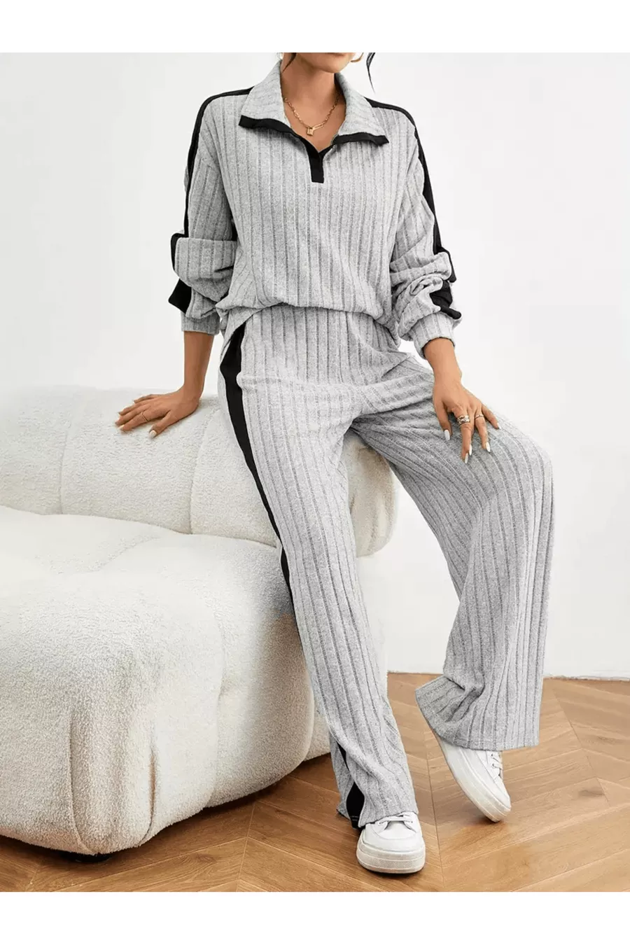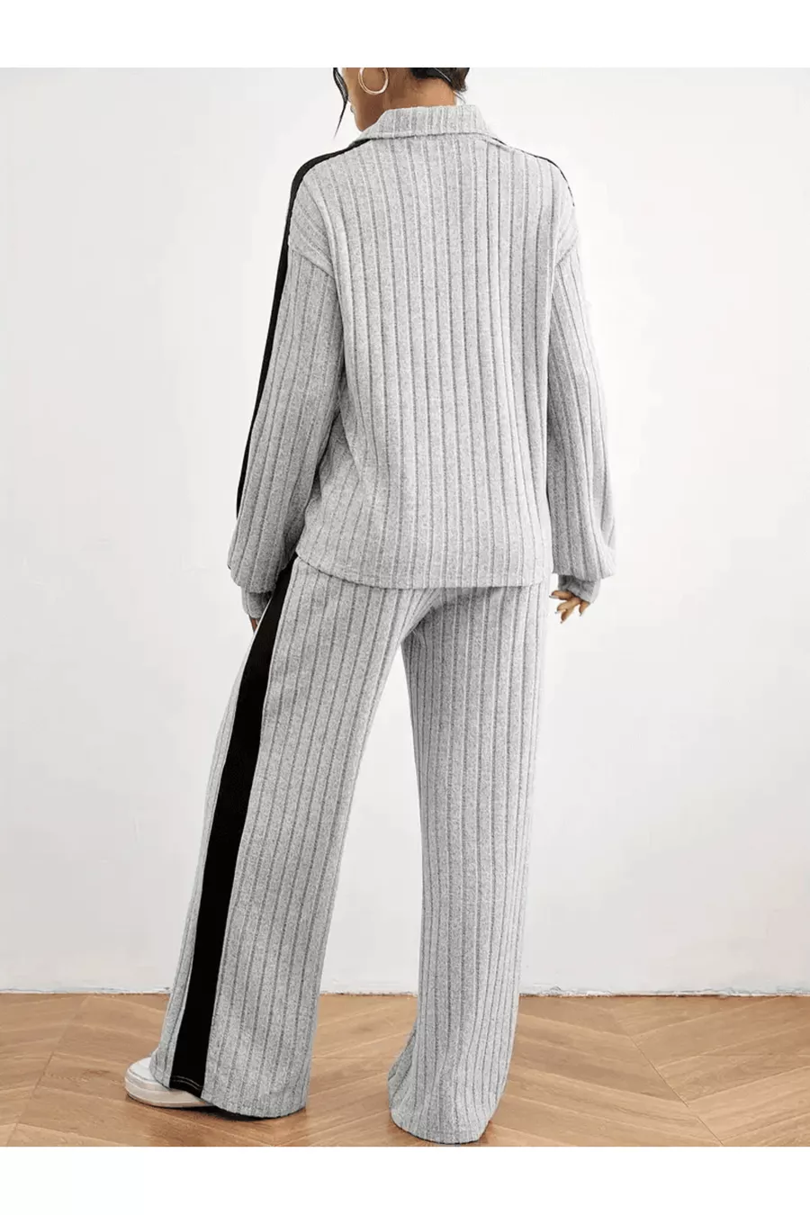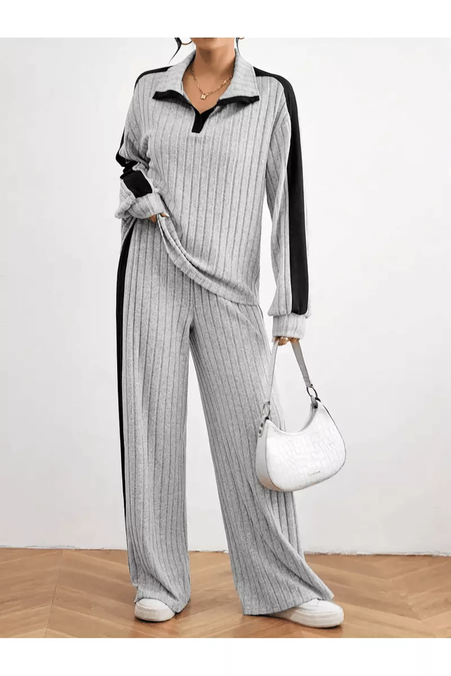 Fabric Type: Knitted Material: Viscose Pattern: Striped Fit: Regular Collar Type: Shirt Collar Color: Gray Product Detail: Striped Pocket: Pocketless Product Type: Plain Sleeve Length: Long Sleeve Type: Standard Sleeve Collection: Basic Thickness: Medium Waist: Regular Waist Leg Type: Wide Leg Silhouette: Regular Occasion: Trend Length: Regular Top-Bottom Set: Sweater-Pants Additional Feature: No Additional Feature Weave Type: Ribbed Knit Persona: Cool & Comfort Belt/Strap: Beltless Print/Embroidery Technique: No Print Number of Pieces: 2 Lining: Unlined Sustainability Detail: Yes Material Composition: Ribbed Knit Washing Instruction: 40 degrees Package Contents: 1+ Season: Winter Country of Origin: TR Box Condition: Boxed