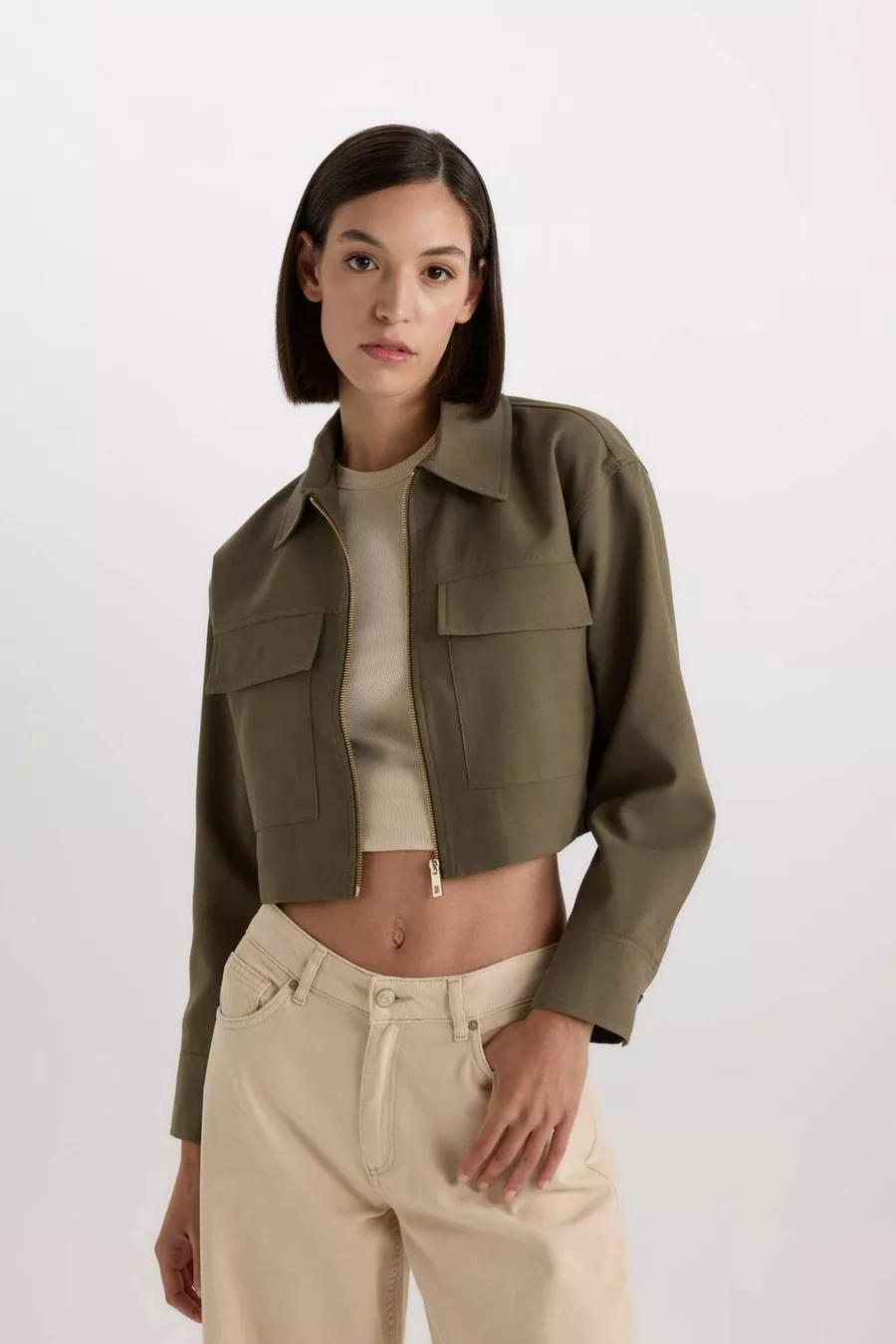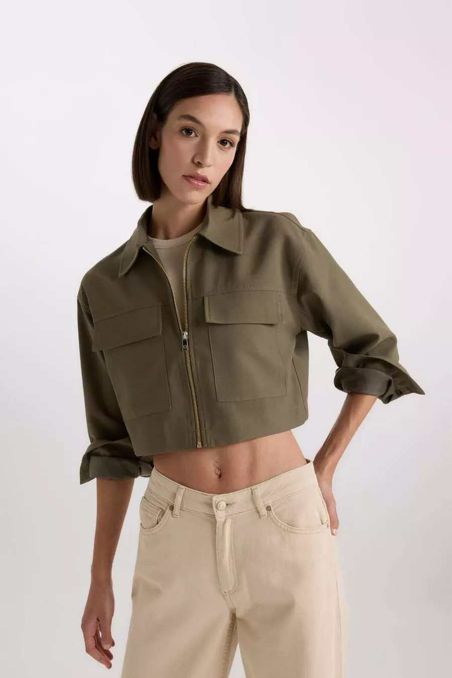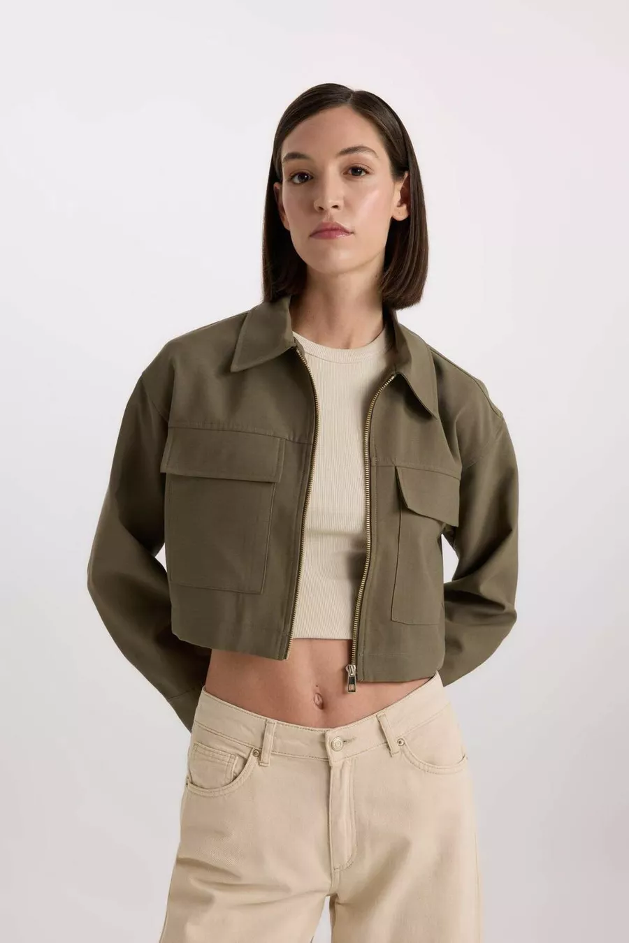 Sleeve Type: Long Sleeve Pattern: Plain Fit: Crop Neck Type: Shirt Collar Material: Gabardine Fabric Type: Woven Color: Khaki Closure Type: Zippered Product Detail: Zipper Pocket: Double Pocket Sleeve Length: Long Lining: Unlined Length: Crop Silhouette: Crop Occasion: Casual Weave Type: Gabardine Sustainability Detail: No Belt/Strap: Without Belt Product Type: Plain Material Composition: 92% Viscose, 8% Polyester Washing Instructions: Type 2 Origin: TR Box Status: No Box