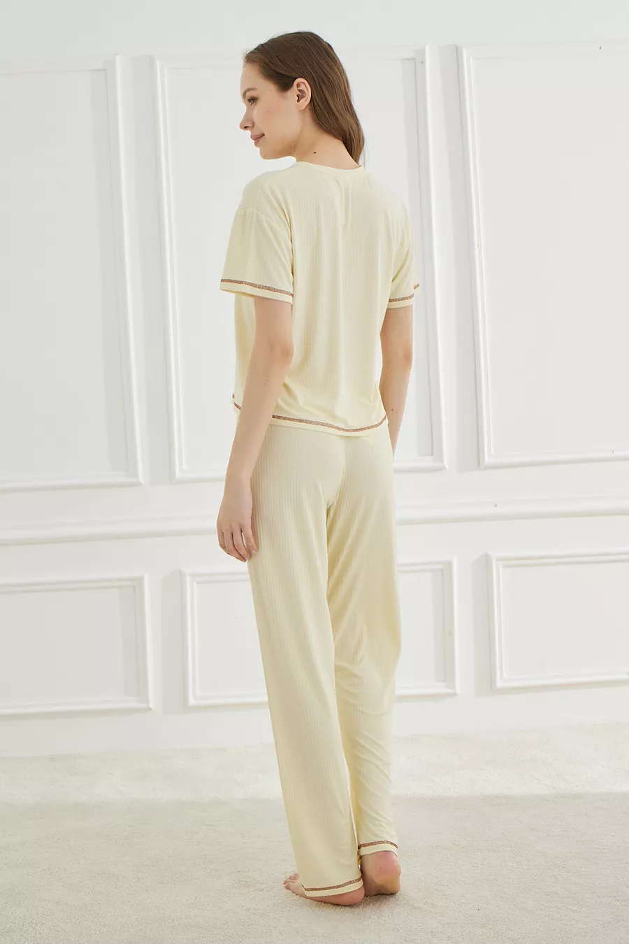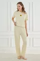 Sleeve Type: Standard Sleeve Sustainability Detail: Yes Pattern: Patterned Neck Type: Crew Neck Leg Length: Long Color: Yellow Material: Textile Product Type: Plain Product Detail: Elastic Collection: Homewear Top-Bottom Set: Robe-Pants Sleeve Length: Short Technique: Mixed Print Fit: Regular Fabric Type: Knit Waist: Regular Waist Weave Type: Soft Number of Pieces: 2 Pieces Silhouette: Regular Persona: Cool & Comfort Occasion: Homewear Additional Feature: Washed Material Composition: Ribbed Fabric Washing Instructions: 30 Degrees Hem Type: Regular Package Contents: Single Length: Long Season: All Seasons Origin: TR Closure Type: Single Closure