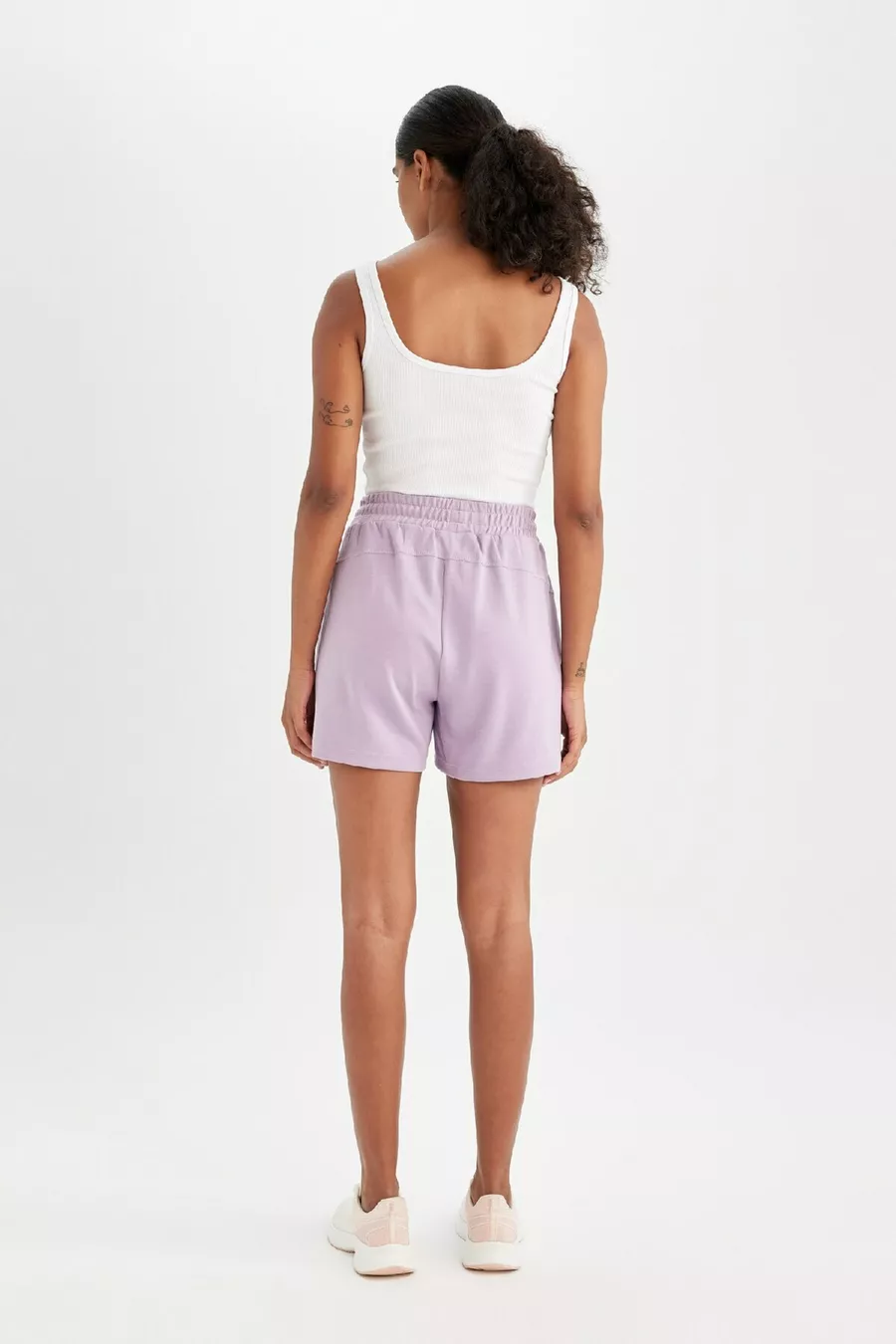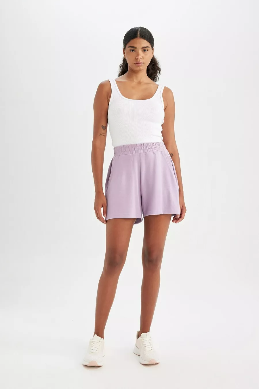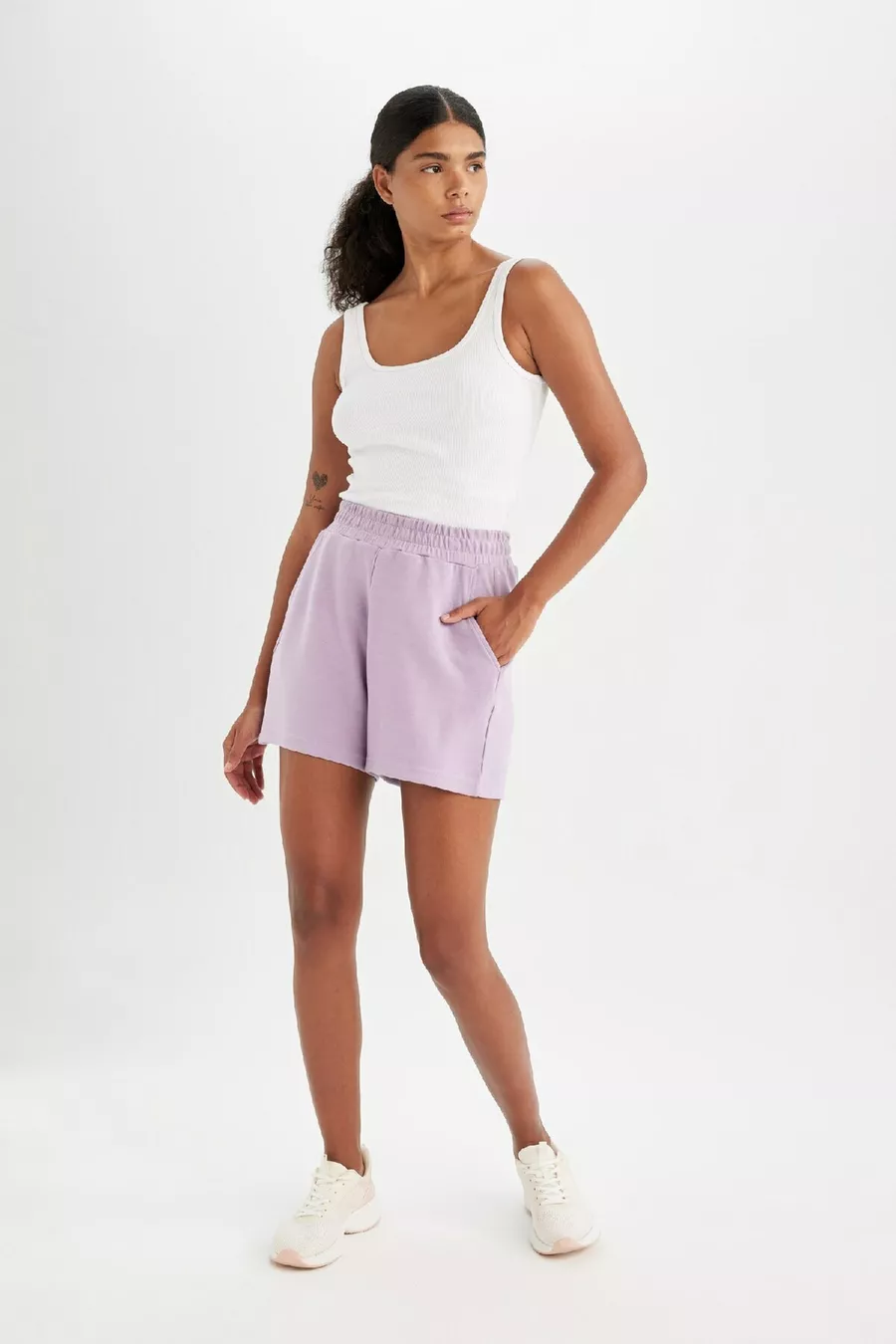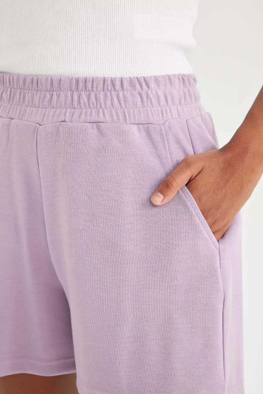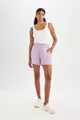 Waist: Normal Waist Additional Feature: Stretchy Pattern: Solid Length / Size: Mini Material: Polyester Blend Fabric Type: Knit Color: Purple Material Composition: 5% Elastane, 47% Modal, 48% Polyester Washing Instructions: Type 0 Length: Short Silhouette: Relaxed Collection: Sportswear Sustainability Detail: No Environment: Sportswear Country of Origin: TR Pocket: Double pocket
