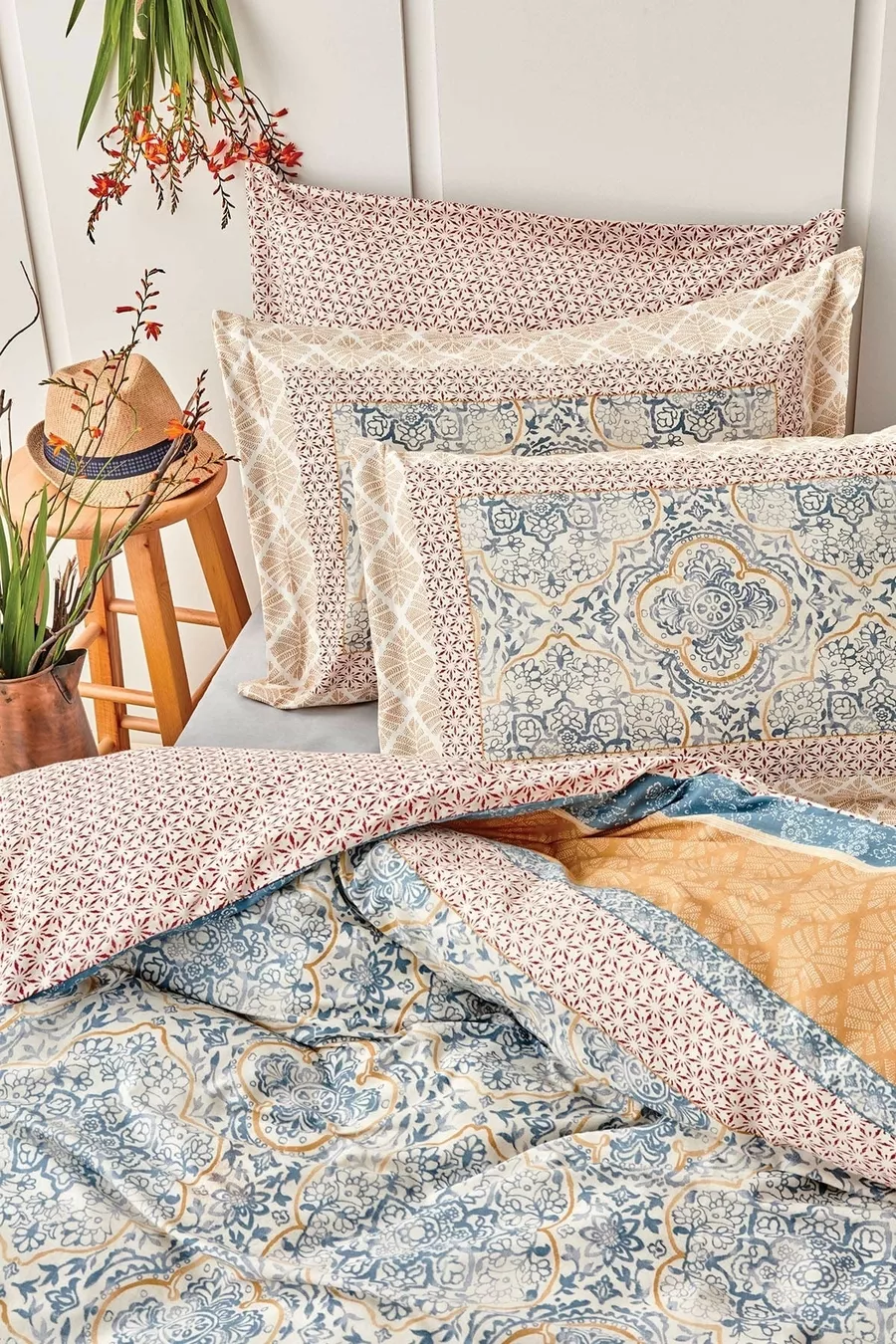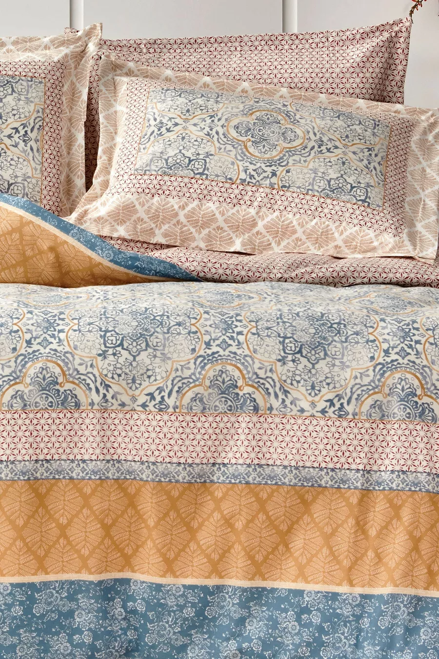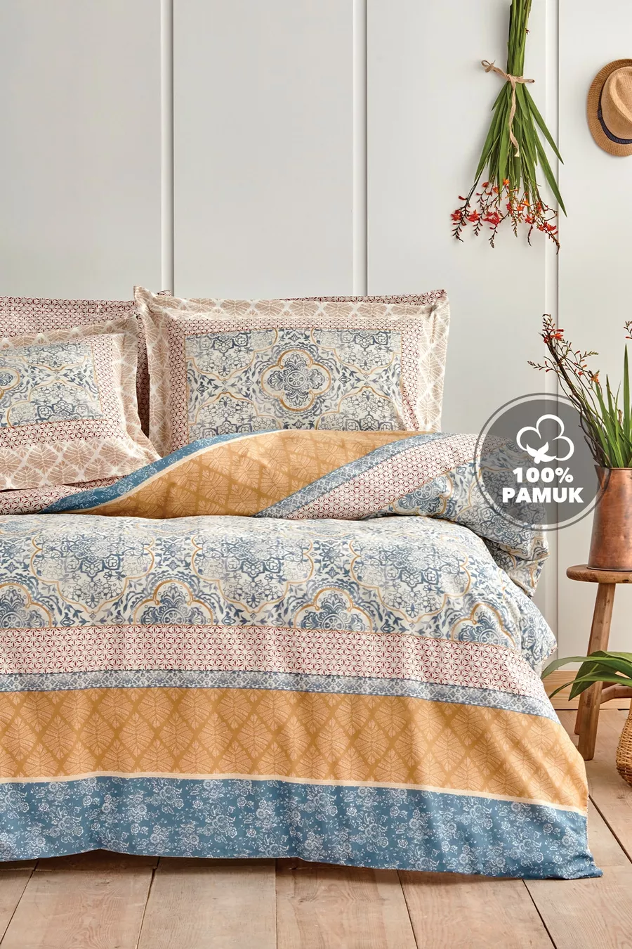 Material: Cotton Package Contents: Set of 4 Size/Dimension: 200 x 220 Sheet Type: Non-elastic Color: Blue Pattern: Geometric Feature: Reversible Material Composition: 100% Cotton Washing Instructions: Recommended to wash at 30 degrees. Box Condition: Boxed Origin: TR