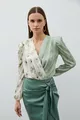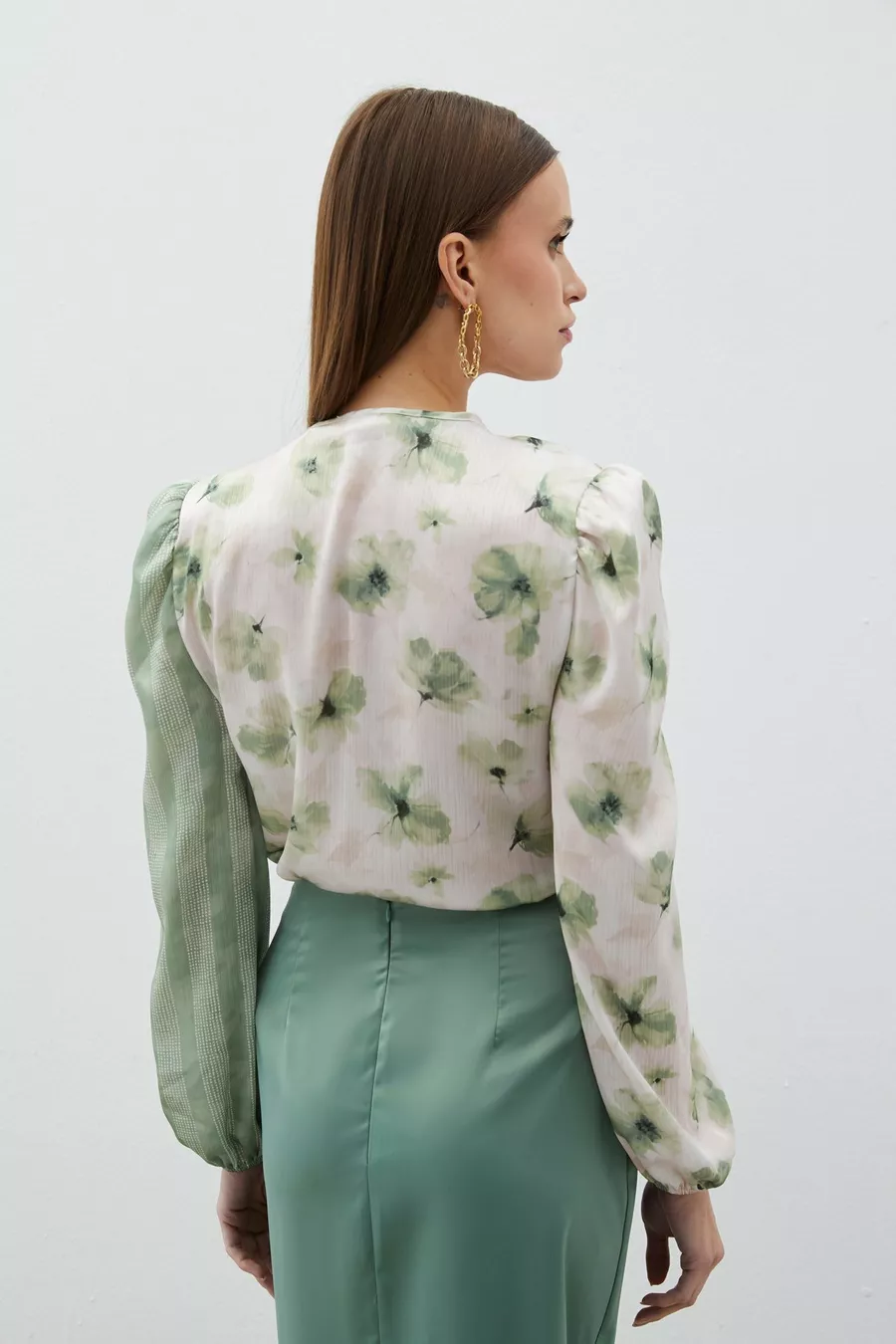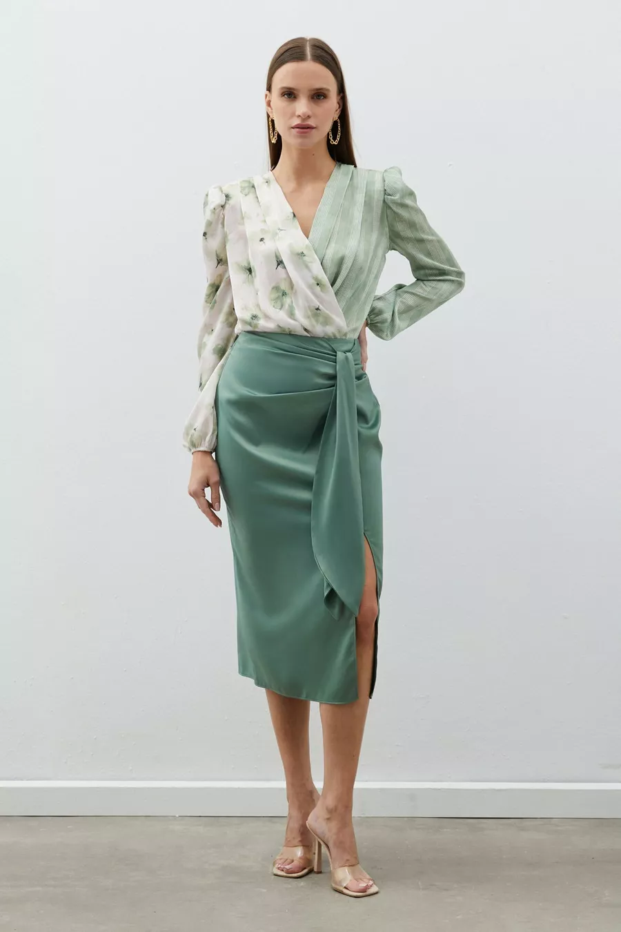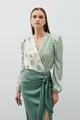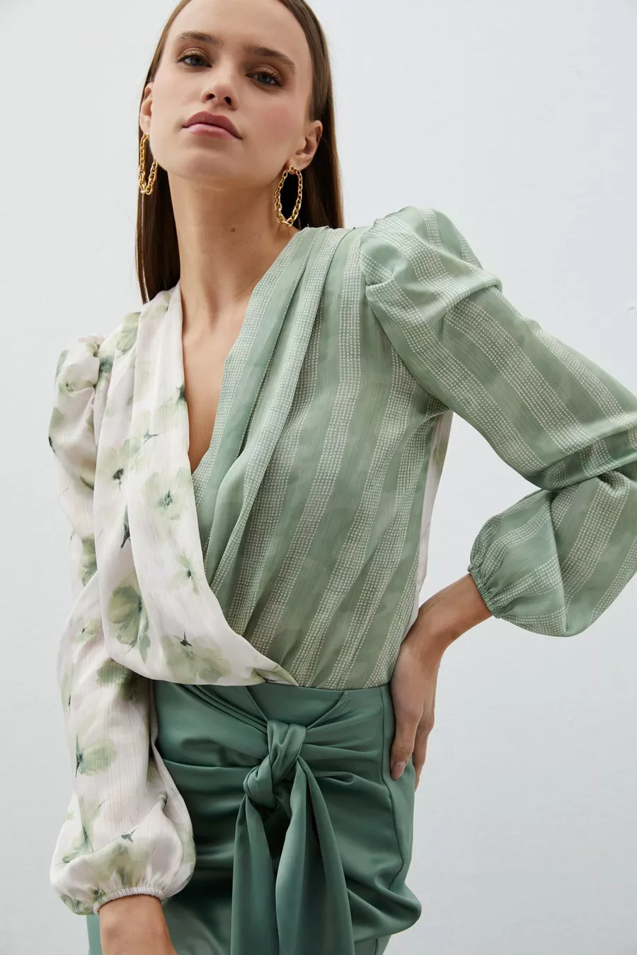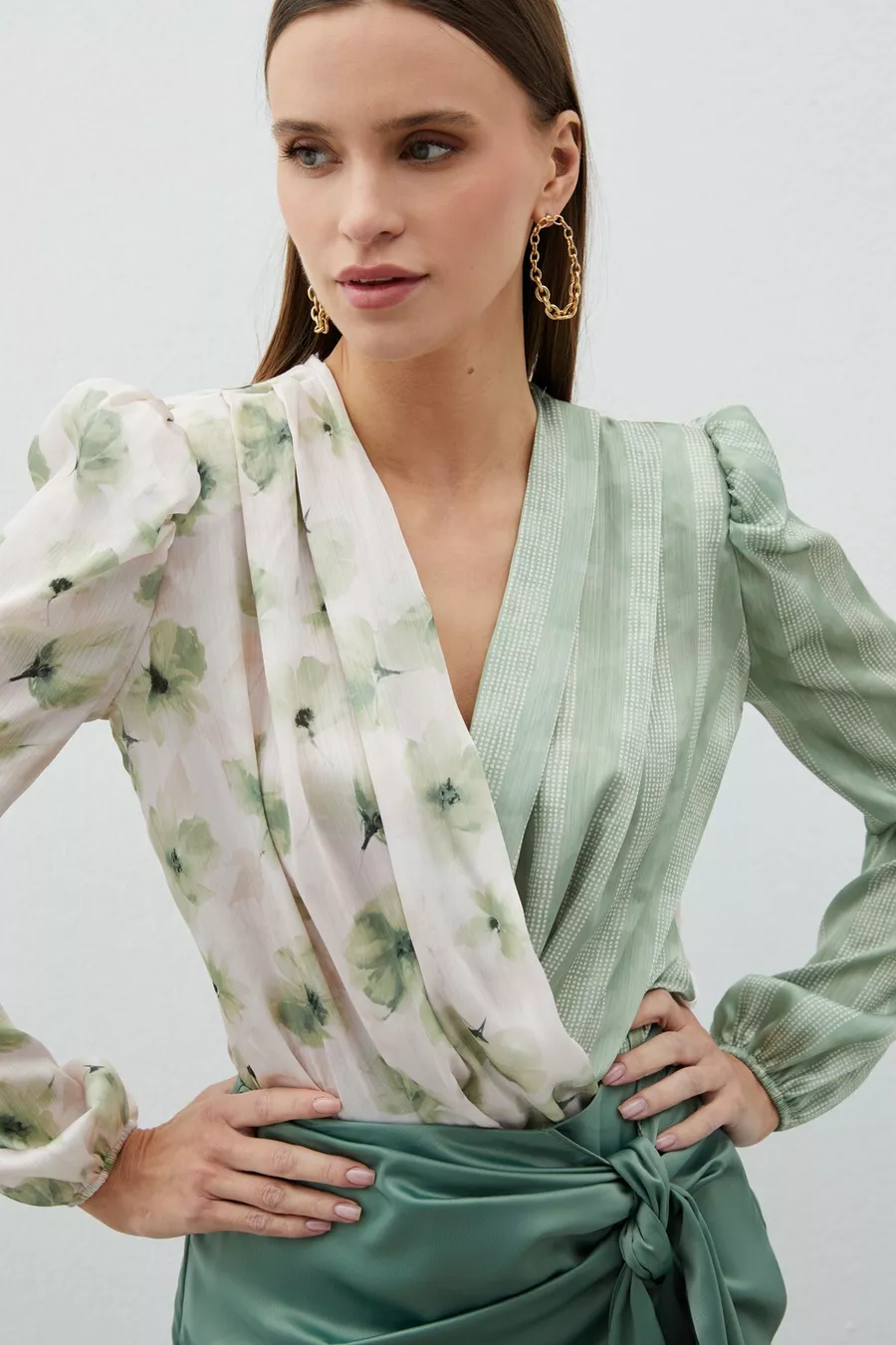 Double Pattern Wrap Bodysuit Blouse - MOSS GREEN