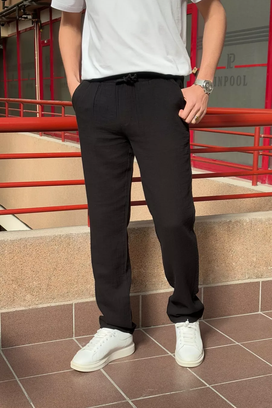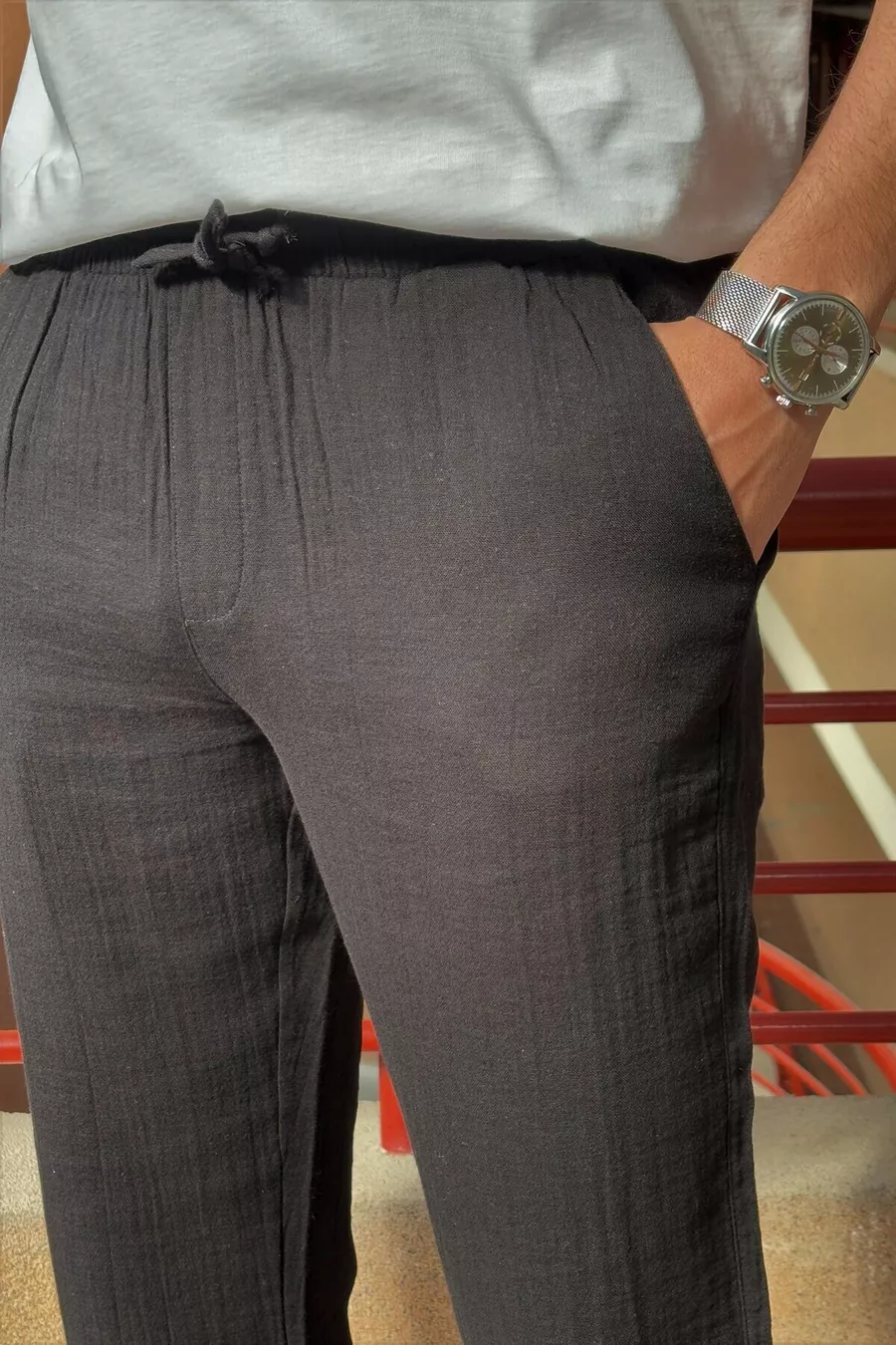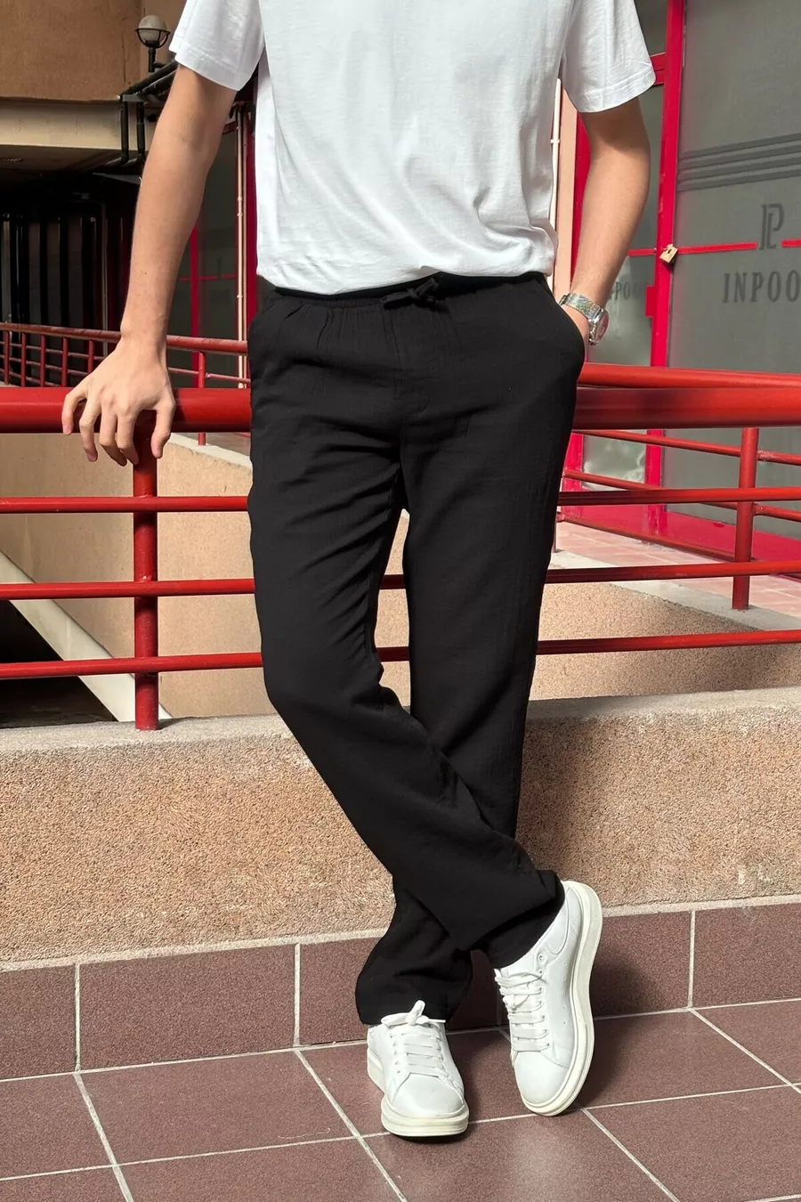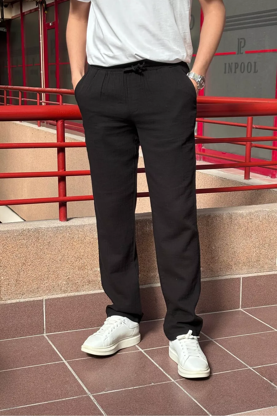 Material: Cotton Fabric Type: Woven Leg Type: Straight Leg Waist: Regular Waist Pattern: Plain Color: Black Pocket: Double Pocket Product Detail: Tie Detail Collection: Basic Thickness: Medium Lining: Unlined Length: Regular Silhouette: Elastic Waist Occasion: Casual/Everyday Fit: Oversize Additional Feature: Adjustable Waist Weave Type: Muslin Persona: Cool & Comfort Print/Embroidery Technique: No Print Belt/Strap: Drawstring Sustainability Detail: Yes Material Composition: 100% Cotton Washing Instructions: Type 0 Season: All Seasons Origin: TR Box Status: No Box Closure Type: Tie / Drawstring Package Contents: Single Piece